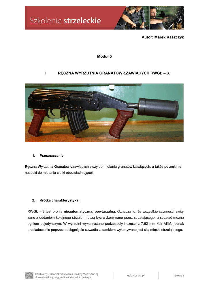 Autor: Marek Kaszczyk Moduł 5 I. 1. RĘCZNA WYRZUTNIA GRANATÓW ŁZAWIĄCYCH RWGŁ – 3. Przeznaczenie. Ręczna Wyrzutnia Granatów Łzawiących służy do miotania granatów łzawiących, a także po zmianie nasadki do miotania siatki obezwładniającej. 2. Krótka charakterystyka. RWGŁ – 3 jest bronią nieautomatyczną, powtarzalną. Oznacza to, że wszystkie czynności związane z oddaniem kolejnego strzału, muszą być wykonywane przez strzelającego, a strzelać można ogniem pojedynczym. W wyrzutni wykorzystano podzespoły i części z 7,62 mm kbk AKM, jednak przeładowanie poprzez odciągnięcie suwadła z zamkiem wykonywane jest siłą mięśni strzelającego. Centralny Ośrodek Szkolenia Służby Więziennej ul. Wrocławska 193–195, 62-800 Kalisz, tel. 62 766 95 00 edu.cossw.pl strona 1 3. Podstawowe dane taktyczno-techniczne. Kaliber lufy – 7,62 mm, nasadki do granatów – 52 mm. Amunicja stosowana w SW 7,62 mm nb.wz.43 Ślepe * 7,62 mm nb.wz.43 UNM Donośność granatu do 100 m. Pojemność magazynka 10 szt. Szybkostrzelność 10 strz./min. Zabezpieczenie przed strzałem przypadkowym bezpiecznik. Ciężar 2,5 kg. * – UNM: Uniwersalne Naboje Miotające stosuje się w celu miotania siatki obezwładniającej. 4. Ogólna budowa. 1. Komora zamkowa (wewnątrz umieszczony mechanizm spustowo – uderzeniowy). 2. Lufa. 3. Nasadka. 4. Zamek. 5. Suwadło. 6. Urządzenie powrotne. 7. Pokrywa komory zamkowej. 8. Nasada lufy. 9. Bezpiecznik. 10. Zatrzask magazynka. 11. Rękojeść tylna. 12. Rękojeść przednia. 13. Magazynek. Centralny Ośrodek Szkolenia Służby Więziennej ul. Wrocławska 193–195, 62-800 Kalisz, tel. 62 766 95 00 edu.cossw.pl strona 2 5. Posługiwanie się RWGŁ – 3 w różnych sytuacjach. 5.1. Przechowywanie wyrzutni w magazynie uzbrojenia. RWGŁ – 3 przechowuje się w głównym i podręcznym magazynie uzbrojenia, w następujący sposób: rozładowaną, magazynek odłączony, kurek zwolniony, bezpiecznik w położeniu – zabezpieczony. 5.2. Przenoszenie wyrzutni. Wyrzutnię przenosimy zabezpieczoną w położeniu "na pas" lub zaczepioną na pasie głównym umundurowania. Jeżeli wyrzutnia jest załadowana, przenosimy ją bez wprowadzonego naboju do komory nabojowej. W trakcie wsiadania i wysiadania z samochodu, w wąskich przejściach i korytarzach, podczas biegu, należy trzymać wyrzutnię w rękach przed sobą. 5.3. Podstawowe czynności przy posługiwaniu się wyrzutnią. 5.3.1. Odłączenie i dołączenie magazynka. W celu odłączenia magazynka od wyrzutni, należy chwycić magazynek i naciskając kciukiem zatrzask magazynka (w stroną magazynka) przesunąć magazynek do przodu i w dół. Centralny Ośrodek Szkolenia Służby Więziennej ul. Wrocławska 193–195, 62-800 Kalisz, tel. 62 766 95 00 edu.cossw.pl strona 3 W celu dołączenia magazynka do wyrzutni należy włożyć magazynek od strony krótszego łuku do gniazda w komorze zamkowej, a następnie przesunąć magazynek do tyłu wciskając go do gniazda tak aby zaskoczył za zatrzask magazynka. 5.3.2. Odbezpieczenie i zabezpieczenie. Odbezpieczenie wyrzutni następuje po przesunięciu bezpiecznika w dół. Pomimo możliwości ustawienia go w dwóch położeniach przy literach C lub P, pełni on tylko jedną rolę odbezpieczenia lub zabezpieczenia wyrzutni. Wyrzutnia jest zabezpieczona przed strzałem przypadkowym, gdy bezpiecznik znajduje się w górnym położeniu. Po zabezpieczeniu zostaje zablokowany język spustowy oraz ograniczony ruch suwadła do tyłu. Sprawdzenie skuteczności działania zabezpieczenia wykonuje się w następujący sposób: nacisnąć na spust – powinien być „twardy”, nie daje się go wcisnąć; odciągnąć suwadło do tyłu – powinno dać się odciągnąć tylko na krótkim odcinku i zostać zablokowane. Centralny Ośrodek Szkolenia Służby Więziennej ul. Wrocławska 193–195, 62-800 Kalisz, tel. 62 766 95 00 edu.cossw.pl strona 4 5.3.3. Rozkładanie częściowe i składanie. W celu dokonania częściowego rozłożenia wyrzutni należy wykonać w kolejności następujące czynności: 1. Odłączyć magazynek i upewnić się czy nie ma w nim naboju. 2. Sprawdzić komorę nabojową. Odbezpieczyć wyrzutnię i odciągnąć suwadło w tył. Sprawdzić czy nie ma naboju w komorze nabojowej, puścić suwadło. 3. Odłączyć pokrywę komory zamkowej. Wcisnąć stopkę mechanizmu powrotnego i unieść tylną część pokrywy komory zamkowej. 4. Odłączyć mechanizm powrotny. Ponownie wcisnąć stopkę mechanizmu powrotnego, wysunąć ją z wycięć w komorze zamkowej i odłączyć mechanizm powrotny. 5. Odłączyć suwadło wraz z zamkiem. Przesunąć suwadło do tyłu w końcowym położeniu unieść i wysunąć je z komory zamkowej. Centralny Ośrodek Szkolenia Służby Więziennej ul. Wrocławska 193–195, 62-800 Kalisz, tel. 62 766 95 00 edu.cossw.pl strona 5 6. Odłączyć zamek od suwadła. Ująć suwadło w rękę zamkiem do góry, następnie przesunąć zamek do tyłu obracając w prawo, aby spowodować wyjście występu zamka z wycięcia w suwadle. Odłączyć zamek przesuwając go do przodu. 7. Odkręcić nasadkę. Przy pomocy klucza 17 odkręcić nasadkę pamiętając, że zastosowano lewy gwint. 8. Wykręcić z nasadki dławik. Za pomocą specjalnego klucza wykręcamy dławik z nasadki. Czynność tę wykonujemy podczas czyszczenia wyrzutni po strzelaniu. Składanie wyrzutni polega na wykonaniu powyższych czynności w odwrotnej kolejności. Po złożeniu wyrzutni należy sprawdzić współdziałanie części i mechanizmów. Centralny Ośrodek Szkolenia Służby Więziennej ul. Wrocławska 193–195, 62-800 Kalisz, tel. 62 766 95 00 edu.cossw.pl strona 6 5.3.4. Załadowanie i rozładowanie magazynka. W celu załadowania magazynka nabojami, należy ująć magazynek w rękę wyłazem nabojowym do góry. Drugą ręką trzymać naboje zaślepieniem zwróconym w stronę krótszego łuku magazynka. Następnie ułożyć nabój na opory wyłazu mag