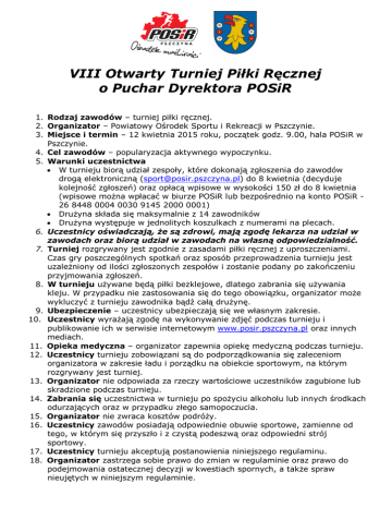 VIII Otwarty Turniej Piłki Ręcznej o Puchar Dyrektora POSiR 1. Rodzaj zawodów – turniej piłki ręcznej. 2. Organizator – Powiatowy Ośrodek Sportu i Rekreacji w Pszczynie. 3. Miejsce i termin – 12 kwietnia 2015 roku, początek godz. 9.00, hala POSiR w Pszczynie. 4. Cel zawodów – popularyzacja aktywnego wypoczynku. 5. Warunki uczestnictwa W turnieju biorą udział zespoły, które dokonają zgłoszenia do zawodów drogą elektroniczną ([email protected]) do 8 kwietnia (decyduje kolejność zgłoszeń) oraz opłacą wpisowe w wysokości 150 zł do 8 kwietnia (wpisowe można wpłacać w biurze POSiR lub bezpośrednio na konto POSiR 26 8448 0004 0030 9145 2000 0001) Drużyna składa się maksymalnie z 14 zawodników Drużyna występuje w jednolitych koszulkach z numerami na plecach. 6. Uczestnicy oświadczają, że są zdrowi, mają zgodę lekarza na udział w zawodach oraz biorą udział w zawodach na własną odpowiedzialność. 7. Turniej rozgrywany jest zgodnie z zasadami piłki ręcznej z uproszczeniami. Czas gry poszczególnych spotkań oraz sposób przeprowadzenia turnieju jest uzależniony od ilości zgłoszonych zespołów i zostanie podany po zakończeniu przyjmowania zgłoszeń. 8. W turnieju używane będą piłki bezklejowe, dlatego zabrania się używania kleju. W przypadku nie zastosowania się do tego obowiązku, organizator może wykluczyć z turnieju zawodnika bądź całą drużynę. 9. Ubezpieczenie – uczestnicy ubezpieczają się we własnym zakresie. 10. Uczestnicy wyrażają zgodę na wykonywanie zdjęć podczas turnieju i publikowanie ich w serwisie internetowym www.posir.pszczyna.pl oraz innych mediach. 11. Opieka medyczna – organizator zapewnia opiekę medyczną podczas turnieju. 12. Uczestnicy turnieju zobowiązani są do podporządkowania się zaleceniom organizatora w zakresie ładu i porządku na obiekcie sportowym, na którym rozgrywany jest turniej. 13. Organizator nie odpowiada za rzeczy wartościowe uczestników zagubione lub skradzione podczas turnieju. 14. Zabrania się uczestnictwa w turnieju po spożyciu alkoholu lub innych środkach odurzających oraz w przypadku złego samopoczucia. 15. Organizator nie zwraca kosztów podróży. 16. Uczestnicy zawodów posiadają odpowiednie obuwie sportowe, zamienne od tego, w którym się przyszło i z czystą podeszwą oraz odpowiedni strój sportowy. 17. Uczestnicy turnieju akceptują postanowienia niniejszego regulaminu. 18. Organizator zastrzega sobie prawo do zmian w regulaminie oraz prawo do podejmowania ostatecznej decyzji w kwestiach spornych, a także spraw nieujętych w niniejszym regulaminie.