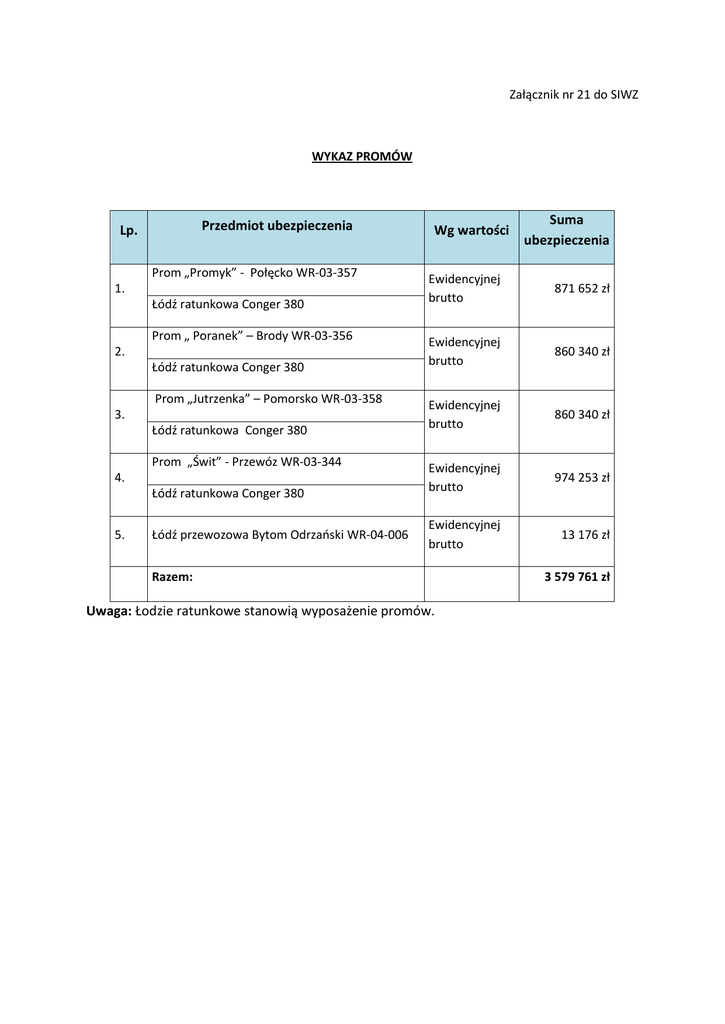 Załącznik nr 21 do SIWZ WYKAZ PROMÓW Przedmiot ubezpieczenia Lp. Prom „Promyk” - Połęcko WR-03-357 1. Łódź ratunkowa Conger 380 Prom „ Poranek” – Brody WR-03-356 2. Łódź ratunkowa Conger 380 Prom „Jutrzenka” – Pomorsko WR-03-358 3. Łódź ratunkowa Conger 380 Prom „Świt” - Przewóz WR-03-344 4. Łódź ratunkowa Conger 380 5. Łódź przewozowa Bytom Odrzański WR-04-006 Wg wartości Suma ubezpieczenia Ewidencyjnej brutto 871 652 zł Ewidencyjnej brutto 860 340 zł Ewidencyjnej brutto 860 340 zł Ewidencyjnej brutto 974 253 zł Ewidencyjnej brutto 13 176 zł Razem: Uwaga: Łodzie ratunkowe stanowią wyposażenie promów. 3 579 761 zł