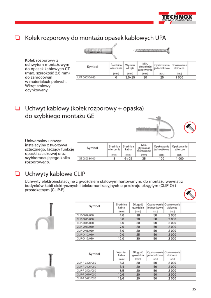 ❏ Kołek rozporowy do montażu opasek kablowych UPA Kołek rozporowy z uchwytem montaŜowym do opasek kablowych CT (max. szerokość 2.6 mm) do zamocowań w materiałach pełnych. Wkręt stalowy ocynkowany. Symbol Średnica wiercenia Wymiar wkręta Min. Opakowanie Opakowanie głębokość jednostkowe zbiorcze zakotwienia [mm] [mm] [mm] [szt.] [szt.] 6 3.5x35 30 25 1 000 Opakowanie jednostkowe Opakowanie zbiorcze UPA 06030/025 ❏ Uchwyt kablowy (kołek rozporowy + opaska) do szybkiego montażu GE Uniwersalny uchwyt instalacyjny z tworzywa sztucznego, łączący funkcję opaski zaciskowej oraz szybkomocującego kołka rozporowego. Symbol GE 08038/100 Średnica kabla Min. głębokość zakotwienia [mm] [mm] [mm] [szt.] [szt.] 8 6÷25 35 100 1 000 Średnica wiercenia ❏ Uchwyty kablowe CLIP Uchwyty elektroinstalacyjne z gwoździem stalowym hartowanym, do montaŜu wewnątrz budynków kabli elektrycznych i telekomunikacyjnych o przekroju okrągłym (CLIP-O) i prostokątnym (CLIP-P). Symbol CLIP-O 04/050 CLIP-O 05/050 CLIP-O 06/050 CLIP-O 07/050 CLIP-O 08/050 CLIP-O 10/050 CLIP-O 12/050 Symbol CLIP-P 0306/050 CLIP-P 0406/050 CLIP-P 0508/050 CLIP-P 0610/050 CLIP-P 0612/050 Średnica kabla Długość gwoździa Opakowanie Opakowanie jednostkowe zbiorcze [mm] [mm] [szt.] 4.0 5.0 6.0 7.0 8.0 10.0 12.0 18 20 20 20 20 25 30 50 50 50 50 50 50 50 Wymiar kabla Długość gwoździa [mm] [mm] [szt.] 6/3 6/4 8/5 10/6 12/6 20 20 20 20 20 50 50 50 50 50 [szt.] 2 2 2 2 2 2 2 000 000 000 000 000 000 000 Opakowanie Opakowanie jednostkowe zbiorcze [szt.] 2 2 2 2 2 000 000 000 000 000 35