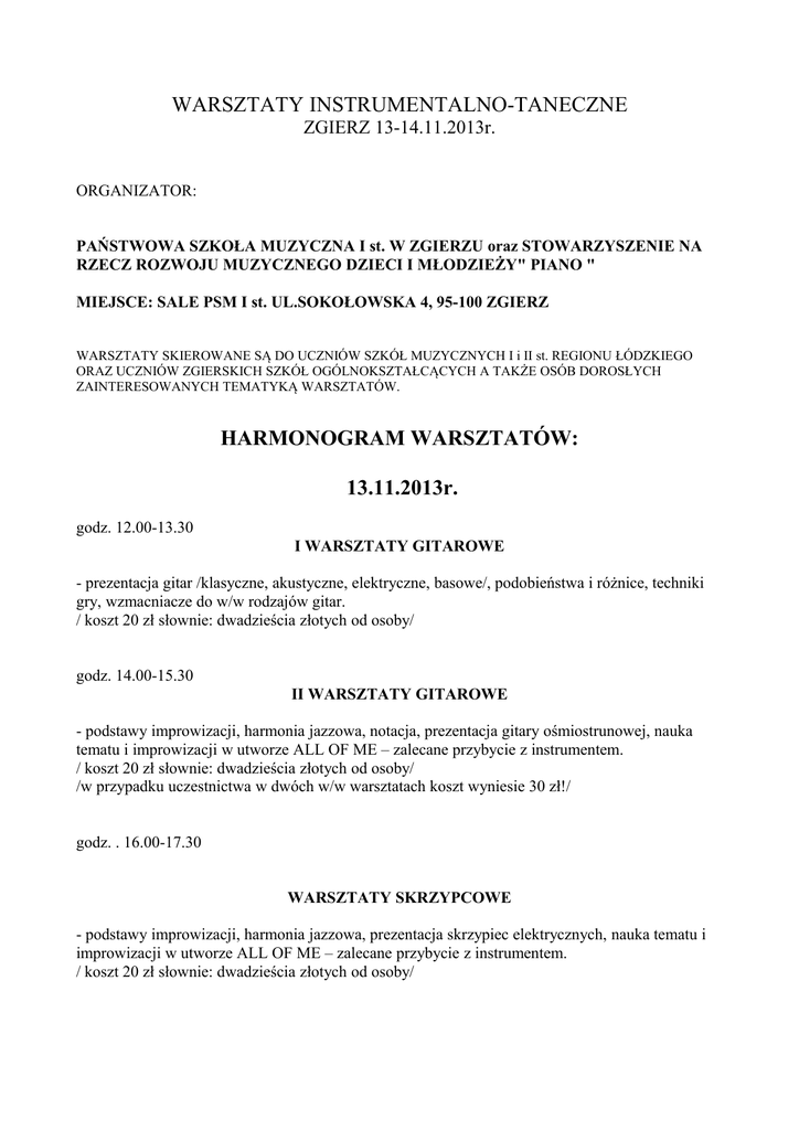 WARSZTATY INSTRUMENTALNO-TANECZNE ZGIERZ 13-14.11.2013r. ORGANIZATOR: PAŃSTWOWA SZKOŁA MUZYCZNA I st. W ZGIERZU oraz STOWARZYSZENIE NA RZECZ ROZWOJU MUZYCZNEGO DZIECI I MŁODZIEŻY" PIANO " MIEJSCE: SALE PSM I st. UL.SOKOŁOWSKA 4, 95-100 ZGIERZ WARSZTATY SKIEROWANE SĄ DO UCZNIÓW SZKÓŁ MUZYCZNYCH I i II st. REGIONU ŁÓDZKIEGO ORAZ UCZNIÓW ZGIERSKICH SZKÓŁ OGÓLNOKSZTAŁCĄCYCH A TAKŻE OSÓB DOROSŁYCH ZAINTERESOWANYCH TEMATYKĄ WARSZTATÓW. HARMONOGRAM WARSZTATÓW: 13.11.2013r. godz. 12.00-13.30 I WARSZTATY GITAROWE - prezentacja gitar /klasyczne, akustyczne, elektryczne, basowe/, podobieństwa i różnice, techniki gry, wzmacniacze do w/w rodzajów gitar. / koszt 20 zł słownie: dwadzieścia złotych od osoby/ godz. 14.00-15.30 II WARSZTATY GITAROWE - podstawy improwizacji, harmonia jazzowa, notacja, prezentacja gitary ośmiostrunowej, nauka tematu i improwizacji w utworze ALL OF ME – zalecane przybycie z instrumentem. / koszt 20 zł słownie: dwadzieścia złotych od osoby/ /w przypadku uczestnictwa w dwóch w/w warsztatach koszt wyniesie 30 zł!/ godz. . 16.00-17.30 WARSZTATY SKRZYPCOWE - podstawy improwizacji, harmonia jazzowa, prezentacja skrzypiec elektrycznych, nauka tematu i improwizacji w utworze ALL OF ME – zalecane przybycie z instrumentem. / koszt 20 zł słownie: dwadzieścia złotych od osoby/ g.18.00-1900 PODSUMOWANIE WARSZTATÓW - wspólne wykonanie utworu ALL OF ME - uczestnicy warsztatów + muzycy YANKEL BAND, mini koncert YANKEL BAND HARMONOGRAM WARSZTATÓW 14.11.2013r godz. 12.00-13.30 I WARSZTATY TANECZNE - tradycyjny taniec romski pochodzący z Rosji / koszt 20 zł słownie: dwadzieścia złotych od osoby/ godz. 14.00-15.30 II WARSZTATY TANECZNE - tradycyjny taniec romski pochodzący z Rumunii / koszt 20 zł słownie: dwadzieścia złotych od osoby/ godz. 16.00-17.30 III WARSZTATY TANECZNE - podstawy tańca flamenco !koszt 20 zł słownie: dwadzieścia złotych od osoby/ /w przypadku uczestnictwa w trzech w/w warsztatach koszt wyniesie 40 zł/ godz.18.00-19.00 - wspólny występ uczestników warsztatów, mini koncert romskiego zespołu PERŁA I BRACIA W TRAKCIE TRWANIA WARSZTATÓW WYSTAWA INSTRUMENTÓW I AKCESORIÓW PROWADZONA PRZEZ SKLEP ASSTONEX. ZAPIS UTWORU ALL OF ME /NUTY+ TABULATURA/ BĘDZIE ROZESŁANY DO SZKÓŁ. Wpłat wpisowego należy dokonywać na konto STOWARZYSZENIA NA RZECZ ROZWOJU MUZYCZNEGO DZIECI I MŁODZIEŻY" PIANO" Multi Bank Oddział Bankowości Detalicznej Bre Banku S.A. Skr. poczt. 2202, 90-959 Łódź, nr konta: 12 1140 2017 0000 4502 1304 7078 w nieprzekraczalnym terminie do dnia 6 listopada 2013r.z dopiskiem ”Warsztaty instrumentalnotaneczne” i wskazaniem, których warsztatów dotyczy wpisowe. Ilość miejsc ograniczona. Wpisowe – w przypadku nieuczestniczenia w warsztatach – nie podlega zwrotowi. Jeżeli będą wolne miejsca w dniu warsztatów można będzie dokonać wpłaty wpisowego w sekretariacie szkoły. Serdecznie zapraszamy Organizatorzy.
