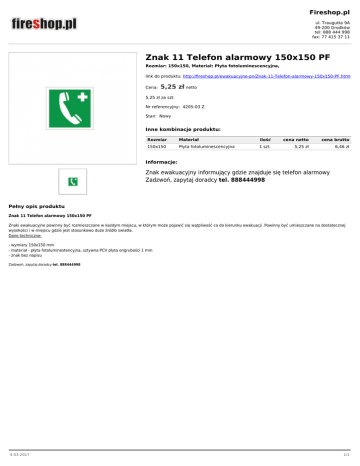 Fireshop.pl ul. Traugutta 9A 49-200 Grodków tel: 888 444 998 fax: 77 415 37 11 Znak 11 Telefon alarmowy 150x150 PF Rozmiar: 150x150, Materiał: Płyta fotoluminescencyjna, link do produktu: http://fireshop.pl/ewakuacyjne-pn/Znak-11-Telefon-alarmowy-150x150-PF.html Cena: 5,25 zł netto 5,25 zł za szt. Nr referencyjny: 4205-03 Z Stan: Nowy Inne kombinacje produktu: Rozmiar Materiał ilość cena netto cena brutto 150x150 Płyta fotoluminescencyjna 1 szt. 5,25 zł 6,46 zł Informacje: Znak ewakuacyjny informujący gdzie znajduje się telefon alarmowy Zadzwoń, zapytaj doradcy tel. 888444998 Pełny opis produktu Znak 11 Telefon alarmowy 150x150 PF Znaki ewakuacyjne powinny być rozmieszczane w każdym miejscu, w którym może pojawić się wątpliwość co do kierunku ewakuacji .Powinny być umieszczane na dostatecznej wysokości i w miejscu gdzie jest stosunkowo duże źródło swiatła. Dane techniczne: - wymiary 150x150 mm - materiał - płyta fotoluminestencyjna, sztywna PCV płyta ongrubości 1 mm - znak bez napisu Zadzwoń, zapytaj doradcy tel. 888444998 4-03-2017 1/1