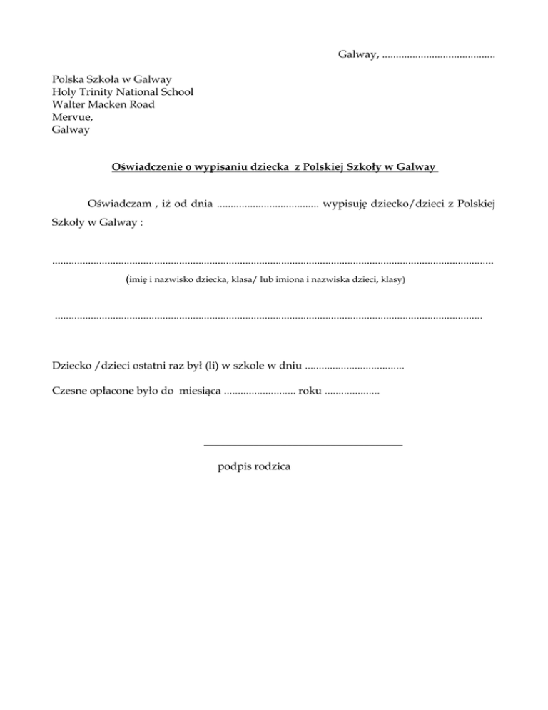 Galway, ......................................... Polska Szkoła w Galway Holy Trinity National School Walter Macken Road Mervue, Galway Oświadczenie o wypisaniu dziecka z Polskiej Szkoły w Galway Oświadczam , iż od dnia ..................................... wypisuję dziecko/dzieci z Polskiej Szkoły w Galway : ................................................................................................................................................................ (imię i nazwisko dziecka, klasa/ lub imiona i nazwiska dzieci, klasy) ........................................................................................................................................................... Dziecko /dzieci ostatni raz był (li) w szkole w dniu .................................... Czesne opłacone było do miesiąca .......................... roku .................... ____________________________________ podpis rodzica