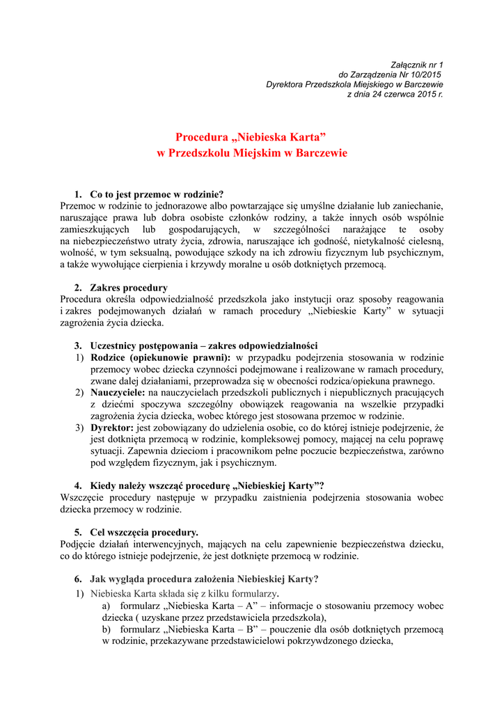 Załącznik nr 1 do Zarządzenia Nr 10/2015 Dyrektora Przedszkola Miejskiego w Barczewie z dnia 24 czerwca 2015 r. Procedura „Niebieska Karta” w Przedszkolu Miejskim w Barczewie 1. Co to jest przemoc w rodzinie? Przemoc w rodzinie to jednorazowe albo powtarzające się umyślne działanie lub zaniechanie, naruszające prawa lub dobra osobiste członków rodziny, a także innych osób wspólnie zamieszkujących lub gospodarujących, w szczególności narażające te osoby na niebezpieczeństwo utraty życia, zdrowia, naruszające ich godność, nietykalność cielesną, wolność, w tym seksualną, powodujące szkody na ich zdrowiu fizycznym lub psychicznym, a także wywołujące cierpienia i krzywdy moralne u osób dotkniętych przemocą. 2. Zakres procedury Procedura określa odpowiedzialność przedszkola jako instytucji oraz sposoby reagowania i zakres podejmowanych działań w ramach procedury „Niebieskie Karty” w sytuacji zagrożenia życia dziecka. 3. Uczestnicy postępowania – zakres odpowiedzialności 1) Rodzice (opiekunowie prawni): w przypadku podejrzenia stosowania w rodzinie przemocy wobec dziecka czynności podejmowane i realizowane w ramach procedury, zwane dalej działaniami, przeprowadza się w obecności rodzica/opiekuna prawnego. 2) Nauczyciele: na nauczycielach przedszkoli publicznych i niepublicznych pracujących z dziećmi spoczywa szczególny obowiązek reagowania na wszelkie przypadki zagrożenia życia dziecka, wobec którego jest stosowana przemoc w rodzinie. 3) Dyrektor: jest zobowiązany do udzielenia osobie, co do której istnieje podejrzenie, że jest dotknięta przemocą w rodzinie, kompleksowej pomocy, mającej na celu poprawę sytuacji. Zapewnia dzieciom i pracownikom pełne poczucie bezpieczeństwa, zarówno pod względem fizycznym, jak i psychicznym. 4. Kiedy należy wszcząć procedurę „Niebieskiej Karty”? Wszczęcie procedury następuje w przypadku zaistnienia podejrzenia stosowania wobec dziecka przemocy w rodzinie. 5. Cel wszczęcia procedury. Podjęcie działań interwencyjnych, mających na celu zapewnienie bezpieczeństwa dziecku, co do którego istnieje podejrzenie, że jest dotknięte przemocą w rodzinie. 6. Jak wygląda procedura założenia Niebieskiej Karty? 1) Niebieska Karta składa się z kilku formularzy. a) formularz „Niebieska Karta – A” – informacje o stosowaniu przemocy wobec dziecka ( uzyskane przez przedstawiciela przedszkola), b) formularz „Niebieska Karta – B” – pouczenie dla osób dotkniętych przemocą w rodzinie, przekazywane przedstawicielowi pokrzywdzonego dziecka, c) formularz „Niebieska Karta – C” – dotyczy osoby dotkniętej przemocą w rodzinie, (wypełnia zespół interdyscyplinarny lub grupa robocza), d) formularz „Niebieska Karta – D” – dotyczy osoby podejrzanej o stosowanie przemocy w rodzinie (wypełnia zespół interdyscyplinarny lub grupa robocza). 2) Wszczęcie procedury następuje przez wypełnienie formularza „Niebieska Karta – A” przez przedstawiciela oświaty (dyrektor przedszkola, nauczyciel) w obecności dziecka, co do którego istnieje podejrzenie, że jest dotknięte przemocą w rodzinie (§ 2.1 Rozporządzenia). Rozmowa z pokrzywdzonym dzieckiem powinna być przeprowadzona w warunkach gwarantujących swobodę wypowiedzi i poszanowanie godności dziecka oraz zapewniających mu bezpieczeństwo. Może to mieć miejsce zarówno w przedszkolu, jak i w miejscu pobytu dziecka. 3) Działania z udziałem dziecka, co do którego istnieje podejrzenie, że jest dotknięte przemocą w rodzinie, powinny być prowadzone w miarę możliwości w obecności psychologa (§ 5.3 Rozporządzenia). 4) W przypadku braku możliwości wypełnienia formularza „Niebieska Karta – A” z uwagi na nieobecność dziecka, co do którego istnieje podejrzenie, że jest dotknięte przemocą w rodzinie, ze względu na stan jego zdrowia lub zagrożenie jego życia lub zdrowia, wypełnienie formularza następuje niezwłocznie po nawiązaniu bezpośredniego kontaktu z nim lub po ustaniu przyczyny uniemożliwiającej jego wypełnienie. W przypadku, gdy nawiązanie bezpośredniego kontaktu z pokrzywdzonym dzieckiem jest niewykonalne, wypełnienie formularza „Niebieska Karta – A” następuje bez jego udziału. 5) Kopię wypełnionego formularza „Niebieska Karta — A” pozostawia się u wszczynającego procedurę. 6) Następnie, niezwłocznie po wszczęciu postępowania, ale nie później niż w terminie siedmiu dni (§ 7 Rozporządzenia) od dnia wszczęcia, przedstawiciel przedszkola przekazuje formularz przewodniczącemu zespołu interdyscyplinarnego. Zespół powołuje burmistrz. W jego skład wchodzą przedstawiciele: jednostek organizacyjnych pomocy społecznej, gminnej komisji rozwiązywania problemów alkoholowych, policji, oświaty, ochrony zdrowia, organizacji pozarządowych, a nadto kuratorów i prokuratorów (art. 9a ust. 3–5 Ustawy o przeciwdziałaniu przemocy w rodzinie). 7) Przewodniczący zespołu interdyscyplinarnego po otrzymaniu formularza „Niebieska Karta — A” niezwłocznie, nie później niż w ciągu 3 dni od dnia jego otrzymania, przekazuje go członkom zespołu interdyscyplinarnego lub grupy roboczej (§ 8 Rozporządzenia ) 8) Po wypełnieniu formularza „Niebieska Karta – A” przekazuje się formularz „Niebieska Karta – B” rodzicowi, opiekunowi prawnemu lub faktycznemu albo osobie, która zgłosiła podejrzenie stosowania przemocy w rodzinie (§ 6.3 Rozporządzenia). 9) Formularza „Niebieska Karta — B” nie przekazuje się osobie, wobec której istnieje podejrzenie, że stosuje przemoc w rodzinie. 10) Po przekazaniu formularza A zespołowi interdyscyplinarnemu dalsze działania podejmowane są przez ten zespół. 11) Na posiedzeniu członkowie zespołu interdyscyplinarnego lub grupy roboczej w obecności zaproszonej osoby, co do której istnieje podejrzenie, że jest dotknięta przemocą w rodzinie, dokonują analizy sytuacji rodziny i w