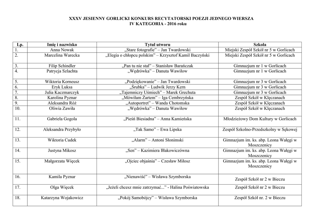 XXXV JESIENNY GORLICKI KONKURS RECYTATORSKI POEZJI JEDNEGO WIERSZA IV KATEGORIA - 2016 roku Imię i nazwisko Anna Nowak Marcelina Warecka Tytuł utworu „Stare fotografie” – Jan Twardowski „Elegia o chłopcu polskim” – Krzysztof Kamil Baczyński Szkoła Miejski Zespół Szkół nr 5 w Gorlicach Miejski Zespół Szkół nr 5 w Gorlicach 3. 4. Filip Schindler Patrycja Szlachta „Pan tu nie stał” – Stanisław Barańczak „Wędrówka” – Danuta Wawiłow Gimnazjum nr 1 w Gorlicach Gimnazjum nr 1 w Gorlicach 5. 6. 7. 8. 9. 10. Wiktoria Korneusz Eryk Luksa Julia Kaczmarczyk Karolina Pyznar Aleksandra Róż Oliwia Zawiła „Podziękowanie” – Jan Twardowski „Śrubka” – Ludwik Jerzy Kern „Tajemniczy Uśmiech” – Marek Grechuta „Mówiłam Żartem” – Iga Cembrzyńska „Autoportret” – Wanda Chotomska „Wędrówka” – Danuta Wawiłow Gimnazjum nr 3 w Gorlicach Gimnazjum nr 3 w Gorlicach Gimnazjum nr 3 w Gorlicach Zespół Szkół w Klęczanach Zespół Szkół w Klęczanach Zespół Szkół w Klęczanach 11. Gabriela Gogola „Pieśń Biesiadna” – Anna Kamieńska Młodzieżowy Dom Kultury w Gorlicach 12. Aleksandra Przybyło „Tak Samo” – Ewa Lipska Zespół Szkolno-Przedszkolny w Sękowej 13. Wiktoria Cudek „Alarm” – Antoni Słonimski 14. Justyna Mikosz „Sen” – Kazimiera Iłłakowiczówna 15. Małgorzata Więcek „Ojciec objaśnia” – Czesław Miłosz Gimnazjum im. ks. abp. Leona Wałęgi w Moszczenicy Gimnazjum im. ks. abp. Leona Wałęgi w Moszczenicy Gimnazjum im. ks. abp. Leona Wałęgi w Moszczenicy 16. Kamila Pyznar „Nienawiść” – Wisława Szymborska 17. Olga Więcek „Jeżeli chcesz mnie zatrzymać...” - Halina Poświatowska Zespół Szkół nr 2 w Bieczu 18. Katarzyna Wojakowicz „Pokój Samobójcy” – Wisława Szymborska Zespół Szkół nr. 2 w Bieczu Lp. 1. 2. Zespół Szkół nr 2 w Bieczu 19. 20. Karolina Kudławiec Justyna Wójcik „Czyżyk i Zięba” – Aleksander Fredro „Dziewczyna” – Bolesław Leśmian Zespół Szkół w Bystrej Zespół Szkół w Bystrej 21. Nikola Soczek „Matka Partyzanta” – Maria Kozaczkowa Zespół Szkolno-Przedszkolny w Rożnowicach 22. 23. Honorata Kozyra Konstanty Kubicki „Siódmy anioł” – Zbigniew Herbert „Odpowiedź gwiżdże wiatr” – Bob Dylan Zespół Szkół w Uściu Gorlickim Zespół Szkół w Uściu Gorlickim 24. Kinga Szczerba „Na Wieży Babel” – Wisława Szymborska Gimnazjum im. Jana Pawła II w Staszkówce 25. Karolina Fryczek „Trochę plotek o świętych” – Jan Twardowski Gimnazjum im ks. Jana Reca w Siedliskach 26. Gabriela Rymek „Gorętsza od Spojrzenia” – Jan Twardowski 27. Urszula Ziomek „Modlitwa” – Autor nieznany 28. Zuzanna Cisowska „Biurko Mickiewicza” - Stanisław Baliński 29. Natalia Bochenek „Szymon z Cyreny” – Karol Wojtyła 30. Katarzyna Jamro „O Grzesiu kłamczuchu i jego cioci” – Julian Tuwim 31. Antoni Żegleń „Spóźniony słowik” – Julian Tuwim 32. 33. 34. 35. 36. 37. Aleksandra Gryzło Martyna Przepióra Aleksandra Sendecka Gabriela Sendecka Paulina Kosiba Roksana Tylawska „Żona Wacia” – K. I. Gałczyński „Kiedy się dziwić przestanę” – Janusz Kofta „Niepewność” – Adam Mickiewicz „Ta nadzieja” – Agnieszka Osiecka „Myśli niedźwiedzia” – Leszek Sulima Ciundziewicki „Dwa wiatry” – Julian Tuwim Gimnazjum im ks. Jana Reca w Siedliskach Gimnazjum im ks. Jana Reca w Siedliskach Zespół Szkół Miejski nr 6 w Gorlicach Gimnazjum im. KEN w Zagórzanach Gimnazjum im. KEN w Zagórzanach Gimnazjum im. KEN w Zagórzanach Gimnazjum w Bobowej Gimnazjum w Binarowej Gimnazjum w Binarowej Gimnazjum w Binarowej Publiczne gimnazjum w Krygu Publiczne gimnazjum w Krygu 38. Klaudia Wal „Szczęście” – Krystyna Kunigiel-Jabłońska Publiczne gimnazjum w Krygu