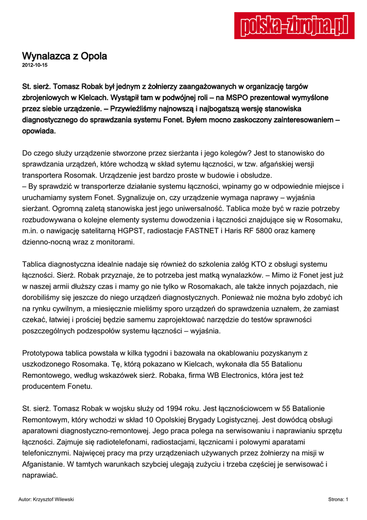 Wynalazca z Opola 2012-10-15 St. sierż. Tomasz Robak był jednym z żołnierzy zaangażowanych w organizację targów zbrojeniowych w Kielcach. Wystąpił tam w podwójnej roli – na MSPO prezentował wymyślone przez siebie urządzenie. – Przywieźliśmy najnowszą i najbogatszą wersję stanowiska diagnostycznego do sprawdzania systemu Fonet. Byłem mocno zaskoczony zainteresowaniem – opowiada. Do czego służy urządzenie stworzone przez sierżanta i jego kolegów? Jest to stanowisko do sprawdzania urządzeń, które wchodzą w skład sytemu łączności, w tzw. afgańskiej wersji transportera Rosomak. Urządzenie jest bardzo proste w budowie i obsłudze. – By sprawdzić w transporterze działanie systemu łączności, wpinamy go w odpowiednie miejsce i uruchamiamy system Fonet. Sygnalizuje on, czy urządzenie wymaga naprawy – wyjaśnia sierżant. Ogromną zaletą stanowiska jest jego uniwersalność. Tablica może być w razie potrzeby rozbudowywana o kolejne elementy systemu dowodzenia i łączności znajdujące się w Rosomaku, m.in. o nawigację satelitarną HGPST, radiostacje FASTNET i Haris RF 5800 oraz kamerę dzienno-nocną wraz z monitorami. Tablica diagnostyczna idealnie nadaje się również do szkolenia załóg KTO z obsługi systemu łączności. Sierż. Robak przyznaje, że to potrzeba jest matką wynalazków. – Mimo iż Fonet jest już w naszej armii dłuższy czas i mamy go nie tylko w Rosomakach, ale także innych pojazdach, nie dorobiliśmy się jeszcze do niego urządzeń diagnostycznych. Ponieważ nie można było zdobyć ich na rynku cywilnym, a miesięcznie mieliśmy sporo urządzeń do sprawdzenia uznałem, że zamiast czekać, łatwiej i prościej będzie samemu zaprojektować narzędzie do testów sprawności poszczególnych podzespołów systemu łączności – wyjaśnia. Prototypowa tablica powstała w kilka tygodni i bazowała na okablowaniu pozyskanym z uszkodzonego Rosomaka. Tę, którą pokazano w Kielcach, wykonała dla 55 Batalionu Remontowego, według wskazówek sierż. Robaka, firma WB Electronics, która jest też producentem Fonetu. St. sierż. Tomasz Robak w wojsku służy od 1994 roku. Jest łącznościowcem w 55 Batalionie Remontowym, który wchodzi w skład 10 Opolskiej Brygady Logistycznej. Jest dowódcą obsługi aparatowni diagnostyczno-remontowej. Jego praca polega na serwisowaniu i naprawianiu sprzętu łączności. Zajmuje się radiotelefonami, radiostacjami, łącznicami i polowymi aparatami telefonicznymi. Najwięcej pracy ma przy urządzeniach używanych przez żołnierzy na misji w Afganistanie. W tamtych warunkach szybciej ulegają zużyciu i trzeba częściej je serwisować i naprawiać. Autor: Krzysztof Wilewski Strona: 1 Sierżant podkreśla, że większość z jego wynalazków i usprawnień powstała w wyniku codziennej, żmudnej remontowej pracy całego personelu warsztatu łączności. Tak było chociażby ze stanowiskiem do sprawdzania szczelności radiostacji R-3501. – Takich urządzeń nikt nie produkował, a mieliśmy dziesiątki radiostacji do sprawdzenia. Zbudowaliśmy więc je sami. Część podzespołów trzeba było kupić, a akwarium, w którym zatapiamy radiostacje, przyniósł kolega z domu. Natomiast reduktor między sprężarką a radiostacją powstał już w batalionowym warsztacie – opowiada Robak. Żołnierz z Opola udoskonalił też proces sprawdzania i diagnozowania odbiorników do nawigacji satelitarnej. Do niedawna, żeby sprawdzić, czy GPS działa, trzeba było wychodzić z warsztatu na zewnątrz, czekać parę chwil aż urządzenie znajdzie satelitę i odbierze dane. Sierż. Robak i jego koledzy zbudowali na dachu antenę i poprowadzili sygnał do warsztatu. Podobnie było z tzw. eliminatorem baterii do radiostacji R-3501. Według instrukcji, po naprawie radiostacji trzeba zmierzyć jej pobór prądu. Problem w tym, że nie było do tego odpowiedniego narzędzia. Sierż. Robak wspólnie z kolegą z warsztatu zbudowali je sami ze zużytych akumulatorów. – W ten sposób zdobyliśmy narzędzie, które pozwala nam nie tylko wykonywać pomiary zgodnie z instrukcją, ale też mamy stabilne źródło zasilania radiostacji podczas prac serwisowych. Pomysł ten później wykorzystaliśmy do innych typów radiostacji i radiotelefonów – mówi sierżant. Obecnie razem z zespołem pracują nad ulepszeniem tablicy diagnostycznej do Foneta, tak aby można było zamontować ją w Aparatowni ADR. Dzięki temu urządzenia systemu Fonet będzie można serwisować bezpośrednio w jednostkach wojskowych lub na poligonach i placach ćwiczeń. *** WB Elektronics S.A. jest producentem Zestawów Diagnostyczno-Serwisowych Pokładowego Zestawu Urządzeń Łączności Wewnętrznej Fonet w różnych konfiguracjach, w tym również w wykonaniu dla wersji ISAF. Pierwsze zestawy w tej konfiguracji były sprzedawane do JW 1948 w 2008 r. Autor: Krzysztof Wilewski Strona: 2