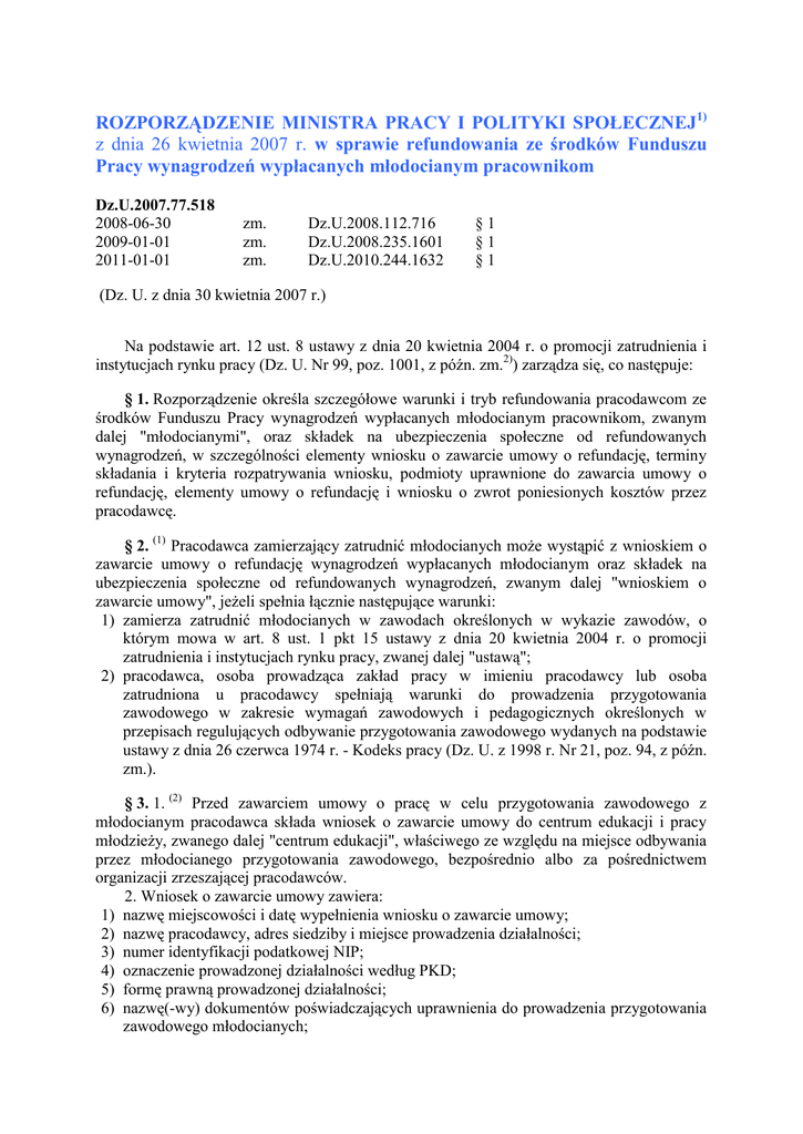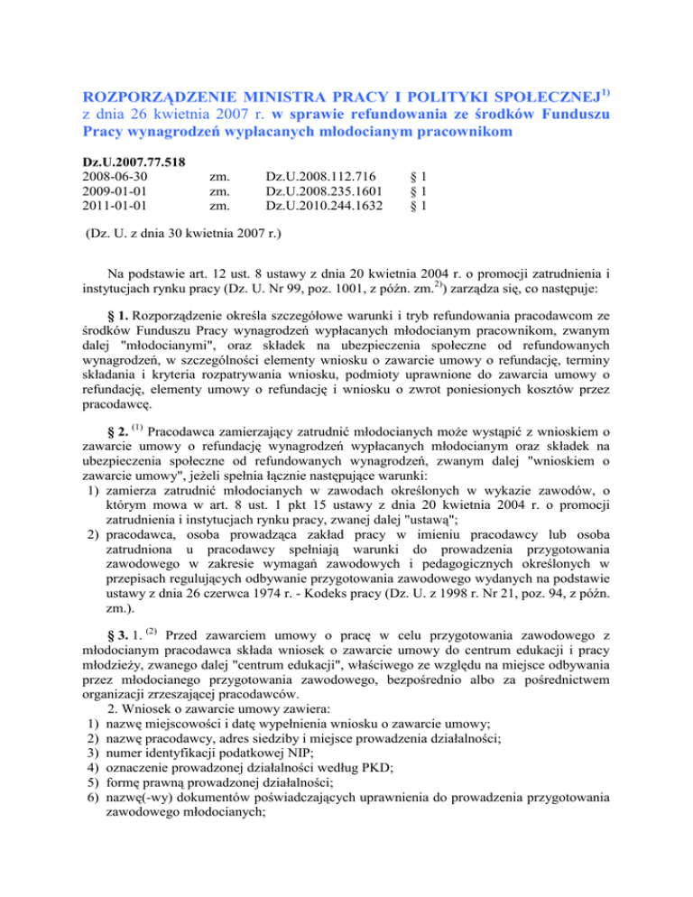 ROZPORZĄDZENIE MINISTRA PRACY I POLITYKI SPOŁECZNEJ1) z dnia 26 kwietnia 2007 r. w sprawie refundowania ze środków Funduszu Pracy wynagrodzeń wypłacanych młodocianym pracownikom Dz.U.2007.77.518 2008-06-30 2009-01-01 2011-01-01 zm. zm. zm. Dz.U.2008.112.716 Dz.U.2008.235.1601 Dz.U.2010.244.1632 §1 §1 §1 (Dz. U. z dnia 30 kwietnia 2007 r.) Na podstawie art. 12 ust. 8 ustawy z dnia 20 kwietnia 2004 r. o promocji zatrudnienia i instytucjach rynku pracy (Dz. U. Nr 99, poz. 1001, z późn. zm.2)) zarządza się, co następuje: § 1. Rozporządzenie określa szczegółowe warunki i tryb refundowania pracodawcom ze środków Funduszu Pracy wynagrodzeń wypłacanych młodocianym pracownikom, zwanym dalej "młodocianymi", oraz składek na ubezpieczenia społeczne od refundowanych wynagrodzeń, w szczególności elementy wniosku o zawarcie umowy o refundację, terminy składania i kryteria rozpatrywania wniosku, podmioty uprawnione do zawarcia umowy o refundację, elementy umowy o refundację i wniosku o zwrot poniesionych kosztów przez pracodawcę. § 2. (1) Pracodawca zamierzający zatrudnić młodocianych może wystąpić z wnioskiem o zawarcie umowy o refundację wynagrodzeń wypłacanych młodocianym oraz składek na ubezpieczenia społeczne od refundowanych wynagrodzeń, zwanym dalej "wnioskiem o zawarcie umowy", jeżeli spełnia łącznie następujące warunki: 1) zamierza zatrudnić młodocianych w zawodach określonych w wykazie zawodów, o którym mowa w art. 8 ust. 1 pkt 15 ustawy z dnia 20 kwietnia 2004 r. o promocji zatrudnienia i instytucjach rynku pracy, zwanej dalej "ustawą"; 2) pracodawca, osoba prowadząca zakład pracy w imieniu pracodawcy lub osoba zatrudniona u pracodawcy spełniają warunki do prowadzenia przygotowania zawodowego w zakresie wymagań zawodowych i pedagogicznych określonych w przepisach regulujących odbywanie przygotowania zawodowego wydanych na podstawie ustawy z dnia 26 czerwca 1974 r. - Kodeks pracy (Dz. U. z 1998 r. Nr 21, poz. 94, z późn. zm.). § 3. 1. (2) Przed zawarciem umowy o pracę w celu przygotowania zawodowego z młodocianym pracodawca składa wniosek o zawarcie umowy do centrum edukacji i pracy młodzieży, zwanego dalej "centrum edukacji", właściwego ze względu na miejsce odbywania przez młodocianego przygotowania zawodowego, bezpośrednio albo za pośrednictwem organizacji zrzeszającej pracodawców. 2. Wniosek o zawarcie umowy zawiera: 1) nazwę miejscowości i datę wypełnienia wniosku o zawarcie umowy; 2) nazwę pracodawcy, adres siedziby i miejsce prowadzenia działalności; 3) numer identyfikacji podatkowej NIP; 4) oznaczenie prowadzonej działalności według PKD; 5) formę prawną prowadzonej działalności; 6) nazwę(-wy) dokumentów poświadczających uprawnienia do prowadzenia przygotowania zawodowego młodocianych; (3) wykaz zawodów lub wykaz zakresów przyuczenia, w których będzie odbywać się przygotowanie zawodowe, i liczbę młodocianych, którzy będą odbywać przygotowanie zawodowe w poszczególnych zawodach lub zakresach przyuczenia; 8) oświadczenia o: a) liczbie pracowników zatrudnionych w dniu składania wniosku o zawarcie umowy, z uwzględnieniem młodocianych i roku ich nauki, b) liczbie młodocianych, którzy w okresie ostatnich trzech lat przed dniem złożenia wniosku o zawarcie umowy ukończyli przygotowanie zawodowe u tego pracodawcy, c) liczbie młodocianych, którzy ukończyli przygotowanie zawodowe w okresie ostatnich trzech lat przed dniem złożenia wniosku o zawarcie umowy i kontynuowali zatrudnienie u tego pracodawcy przez okres co najmniej 12 miesięcy lub nadal są u niego zatrudnieni, d) niekorzystaniu z refundacji wynagrodzeń i składek na ubezpieczenia społeczne od tych wynagrodzeń młodocianych, o których mowa w wykazie wymienionym w pkt 7, z innej wojewódzkiej komendy Ochotniczych Hufców Pracy, zwanej dalej "OHP", e) (4) nieciążeniu na pracodawcy obowiązku zwrotu pomocy wynikającego z wcześniejszej decyzji Komisji Europejskiej uznającej pomoc za niezgodną z prawem i wspólnym rynkiem oraz niezaliczaniu się do kategorii przedsiębiorców zagrożonych w rozumieniu art. 1 ust. 7 rozporządzenia Komisji (WE) nr 800/2008 z dnia 6 sierpnia 2008 r. uznającego niektóre rodzaje pomocy za zgodne ze wspólnym rynkiem w zastosowaniu art. 87 i 88 Traktatu (ogólne rozporządzenie w sprawie wyłączeń blokowych) (Dz. Urz. UE L 214 z 09.08.2008, str. 3), zwanego dalej "rozporządzeniem w sprawie wyłączeń blokowych", lub w rozumieniu pkt 9-11 Wytycznych wspólnotowych dotyczących pomocy państwa w celu ratowania i restrukturyzacji zagrożonych przedsiębiorstw (Dz. Urz. UE C 244 z 01.10.2004, str. 2); 9) deklarację zatrudnienia na podstawie umowy o pracę przez okres co najmniej 6 miesięcy po zakończeniu przygotowania zawodowego każdego młodocianego, którego dotyczy wniosek o zawarcie umowy; 10) informację o otrzymanej pomocy publicznej, zawierającą w szczególności dane o dacie jej udzielenia, podstawie prawnej, formie i przeznaczeniu zgodnie z przepisami o postępowaniu w sprawach dotyczących pomocy publicznej. 3. Do wniosku o zawarcie umowy dołącza się: (5) 1) (uchylony); 2) oryginały lub kopie poświadczone za zgodność z oryginałem dokumentów potwierdzających spełnienie wymagań zawodowych i pedagogicznych osób prowadzących przygotowanie zawodowe młodocianych. 4. Wzór wniosku o zawarcie umowy jest określony w załączniku nr 1 do rozporządzenia. 5. Wniosek o zawarcie umowy może dotyczyć: 1) nie więcej niż trzech młodocianych, jeżeli pracodawca zatrudnia wyłącznie młodocianych; 2) młodocianych w liczbie nieprzekraczającej trzykrotnej liczby zatrudnionych w przeliczeniu na pełny wymiar czasu pracy na czas nieokreślony niebędących młodocianymi. 6. Wniosek o zawarcie umowy składany za pośrednictwem organizacji zrzeszającej pracodawców jest sporządzany przez tę organizację na podstawie wniosków pracodawców oraz zawiera in