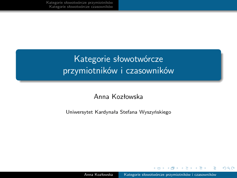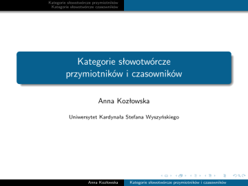 Kategorie słowotwórcze przymiotników Kategorie słowotwórcze czasowników Kategorie słowotwórcze przymiotników i czasowników Anna Kozłowska Uniwersytet Kardynała Stefana Wyszyńskiego Anna Kozłowska Kategorie słowotwórcze przymiotników i czasowników Kategorie słowotwórcze przymiotników Kategorie słowotwórcze czasowników 1 Kategorie słowotwórcze przymiotników 2 Kategorie słowotwórcze czasowników Anna Kozłowska Kategorie słowotwórcze przymiotników i czasowników Kategorie słowotwórcze przymiotników Kategorie słowotwórcze czasowników Derywaty odprzymiotnikowe 1. Derywaty gradacyjne. Przykłady: bledszy, mądrzejszy, zielonkawy, niedorozwinięty, superciekawy, ekstramocny, najkrótszy. 2. Expressiva. Przykłady: świeżutki, maluśki, miluchny. 3. Antonimy (derywaty negacyjne). Przykłady: nieludzki, antyromantyczny, irracjonalny, aspołeczny. Anna Kozłowska Kategorie słowotwórcze przymiotników i czasowników Kategorie słowotwórcze przymiotników Kategorie słowotwórcze czasowników Derywaty odrzeczownikowe – typy użyć użycia subiektowe, np. dziecięca (mowa), uczniowski (wybryk) użycia obiektowe, np. (urzędnik) podatkowy, (pług) śnieżny użycia posesywne (dzierżawcze), np. babcine (okulary), (dobro) narodowe użycia instrumentowe, np. (wycieczka) samolotowa, (rozmowa) telefoniczna użycia materiałowe, np. złoty (pierścionek), (chleb) żytni użycia genetyczne, np. kurze (jajko), (kość) słoniowa użycia charakterystyczne, np. garbaty, piegowaty, uczuciowy, silny, honorowy (człowiek) Anna Kozłowska Kategorie słowotwórcze przymiotników i czasowników Kategorie słowotwórcze przymiotników Kategorie słowotwórcze czasowników Derywaty odrzeczownikowe – typy użyć użycia subiektowe, np. dziecięca (mowa), uczniowski (wybryk) użycia obiektowe, np. (urzędnik) podatkowy, (pług) śnieżny użycia posesywne (dzierżawcze), np. babcine (okulary), (dobro) narodowe użycia instrumentowe, np. (wycieczka) samolotowa, (rozmowa) telefoniczna użycia materiałowe, np. złoty (pierścionek), (chleb) żytni użycia genetyczne, np. kurze (jajko), (kość) słoniowa użycia charakterystyczne, np. garbaty, piegowaty, uczuciowy, silny, honorowy (człowiek) Anna Kozłowska Kategorie słowotwórcze przymiotników i czasowników Kategorie słowotwórcze przymiotników Kategorie słowotwórcze czasowników Derywaty odrzeczownikowe – typy użyć użycia subiektowe, np. dziecięca (mowa), uczniowski (wybryk) użycia obiektowe, np. (urzędnik) podatkowy, (pług) śnieżny użycia posesywne (dzierżawcze), np. babcine (okulary), (dobro) narodowe użycia instrumentowe, np. (wycieczka) samolotowa, (rozmowa) telefoniczna użycia materiałowe, np. złoty (pierścionek), (chleb) żytni użycia genetyczne, np. kurze (jajko), (kość) słoniowa użycia charakterystyczne, np. garbaty, piegowaty, uczuciowy, silny, honorowy (człowiek) Anna Kozłowska Kategorie słowotwórcze przymiotników i czasowników Kategorie słowotwórcze przymiotników Kategorie słowotwórcze czasowników Derywaty odrzeczownikowe – typy użyć użycia subiektowe, np. dziecięca (mowa), uczniowski (wybryk) użycia obiektowe, np. (urzędnik) podatkowy, (pług) śnieżny użycia posesywne (dzierżawcze), np. babcine (okulary), (dobro) narodowe użycia instrumentowe, np. (wycieczka) samolotowa, (rozmowa) telefoniczna użycia materiałowe, np. złoty (pierścionek), (chleb) żytni użycia genetyczne, np. kurze (jajko), (kość) słoniowa użycia charakterystyczne, np. garbaty, piegowaty, uczuciowy, silny, honorowy (człowiek) Anna Kozłowska Kategorie słowotwórcze przymiotników i czasowników Kategorie słowotwórcze przymiotników Kategorie słowotwórcze czasowników Derywaty odrzeczownikowe – typy użyć użycia subiektowe, np. dziecięca (mowa), uczniowski (wybryk) użycia obiektowe, np. (urzędnik) podatkowy, (pług) śnieżny użycia posesywne (dzierżawcze), np. babcine (okulary), (dobro) narodowe użycia instrumentowe, np. (wycieczka) samolotowa, (rozmowa) telefoniczna użycia materiałowe, np. złoty (pierścionek), (chleb) żytni użycia genetyczne, np. kurze (jajko), (kość) słoniowa użycia charakterystyczne, np. garbaty, piegowaty, uczuciowy, silny, honorowy (człowiek) Anna Kozłowska Kategorie słowotwórcze przymiotników i czasowników Kategorie słowotwórcze przymiotników Kategorie słowotwórcze czasowników Derywaty odrzeczownikowe – typy użyć użycia subiektowe, np. dziecięca (mowa), uczniowski (wybryk) użycia obiektowe, np. (urzędnik) podatkowy, (pług) śnieżny użycia posesywne (dzierżawcze), np. babcine (okulary), (dobro) narodowe użycia instrumentowe, np. (wycieczka) samolotowa, (rozmowa) telefoniczna użycia materiałowe, np. złoty (pierścionek), (chleb) żytni użycia genetyczne, np. kurze (jajko), (kość) słoniowa użycia charakterystyczne, np. garbaty, piegowaty, uczuciowy, silny, honorowy (człowiek) Anna Kozłowska Kategorie słowotwórcze przymiotników i czasowników Kategorie słowotwórcze przymiotników Kategorie słowotwórcze czasowników Derywaty odrzeczownikowe – typy użyć użycia subiektowe, np. dziecięca (mowa), uczniowski (wybryk) użycia obiektowe, np. (urzędnik) podatkowy, (pług) śnieżny użycia posesywne (dzierżawcze), np. babcine (okulary), (dobro) narodowe użycia instrumentowe, np. (wycieczka) samolotowa, (rozmowa) telefoniczna użycia materiałowe, np. złoty (pierścionek), (chleb) żytni użycia genetyczne, np. kurze (jajko), (kość) słoniowa użycia charakterystyczne, np. garbaty, piegowaty, uczuciowy, silny, honorowy (człowiek) Anna Kozłowska Kategorie słowotwórcze przymiotników i czasowników Kategorie słowotwórcze przymiotników Kategorie słowotwórcze czasowników Derywaty odrzeczownikowe – typy użyć użycia subiektowe, np. dziecięca (mowa), uczniowski (wybryk) użycia obiektowe, np. (urzędnik) podatkowy, (pług) śnieżny użycia posesywne (dzierżawcze), np. babcine (okulary)