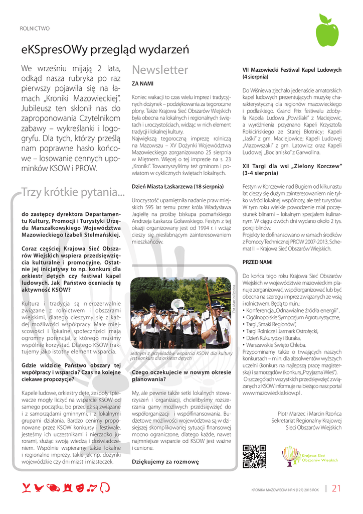 ROLNICTWO eKSpresOWy przegląd wydarzeń Trzy krótkie pytania... do zastępcy dyrektora Departamentu Kultury, Promocji i Turystyki Urzędu Marszałkowskiego Województwa Mazowieckiego Izabeli Stelmańskiej. Coraz częściej Krajowa Sieć Obszarów Wiejskich wspiera przedsięwzięcia kulturalne i promocyjne. Ostatnie jej inicjatywy to np. konkurs dla orkiestr dętych czy festiwal kapel ludowych. Jak Państwo oceniacie tę aktywność KSOW? Kultura i tradycja są nierozerwalnie związane z rolnictwem i obszarami wiejskimi, dlatego cieszymy się z każdej możliwości współpracy. Małe miejscowości i lokalne społeczności mają ogromny potencjał, z którego musimy wspólnie korzystać. Dlatego KSOW traktujemy jako istotny element wsparcia. Gdzie widzicie Państwo obszary tej współpracy i wsparcia? Czas na kolejne ciekawe propozycje? Kapele ludowe, orkiestry dęte, zespoły śpiewacze mogły liczyć na wsparcie KSOW od samego początku, bo przecież są związane i z samorządami gminnymi, i z lokalnymi grupami działania. Bardzo cenimy proponowane przez KSOW konkursy i festiwale, jesteśmy ich uczestnikami i nierzadko jurorami, służąc swoją wiedzą i doświadczeniem. Wspólnie wspieramy także lokalne i regionalne imprezy, takie jak np. dożynki wojewódzkie czy dni miast i miasteczek. Newsletter VII Mazowiecki Festiwal Kapel Ludowych (4 sierpnia) ZA NAMI Do Wiśniewa zjechało jedenaście amatorskich kapel ludowych prezentujących muzykę charakterystyczną dla regionów mazowieckiego i podlaskiego. Grand Prix festiwalu zdobyła Kapela Ludowa „Powiślaki” z Maciejowic, a wyróżnienia przyznano Kapeli Krzysztofa Rokicińskiego ze Starej Błotnicy; Kapeli „Jaśki” z gm. Maciejowice; Kapeli Ludowej „Mazowszaki” z gm. Latowicz oraz Kapeli Ludowej „Bocianisko” z Garwolina. Koniec wakacji to czas wielu imprez i tradycyjnych dożynek – podziękowania za tegoroczne plony. Także Krajowa Sieć Obszarów Wiejskich była obecna na lokalnych i regionalnych świętach i uroczystościach, widząc w nich element tradycji i lokalnej kultury. Największą tegoroczną imprezę rolniczą na Mazowszu – XV Dożynki Województwa Mazowieckiego zorganizowano 25 sierpnia w Miętnem. Więcej o tej imprezie na s. 23 „Kroniki”. Towarzyszyliśmy też gminom i powiatom w cyklicznych świętach lokalnych. XII Targi dla wsi „Zielony Korczew” (3-4 sierpnia) Dzień Miasta Łaskarzewa (18 sierpnia) Festyn w Korczewie nad Bugiem od kilkunastu lat cieszy się dużym zainteresowaniem nie tylko wśród lokalnej wspólnoty, ale też turystów. W tym roku wielkie powodzenie miał poczęstunek blinami – lokalnym specjałem kulinarnym. W ciągu dwóch dni wydano około 2 tys. porcji blinów. Projekty te dofinansowano w ramach środków z Pomocy Technicznej PROW 2007-2013, Schemat III – Krajowa Sieć Obszarów Wiejskich. Uroczystość upamiętniła nadanie praw miejskich 595 lat temu przez króla Władysława Jagiełłę na prośbę biskupa poznańskiego Andrzeja Łaskarza Goławskiego. Festyn z tej okazji organizowany jest od 1994 r. i wciąż cieszy się niesłabnącym zainteresowaniem mieszkańców. PRZED NAMI Fot. Marcin Rzońca We wrześniu mijają 2 lata, odkąd nasza rubryka po raz pierwszy pojawiła się na łamach „Kroniki Mazowieckiej”. Jubileusz ten skłonił nas do zaproponowania Czytelnikom zabawy – wykreślanki i logogryfu. Dla tych, którzy prześlą nam poprawne hasło końcowe – losowanie cennych upominków KSOW i PROW. Jednym z przykładów wsparcia KSOW dla kultury jest konkurs dla orkiestr dętych Czego oczekujecie w nowym okresie planowania? My, ale pewnie także setki lokalnych stowarzyszeń i organizacji, chcielibyśmy rozszerzania gamy możliwych przedsięwzięć do współorganizacji i współfinansowania. Budżetowe możliwości województwa są w dzisiejszej skomplikowanej sytuacji finansowej mocno ograniczone, dlatego każde, nawet najmniejsze wsparcie od KSOW jest ważne i cenione. Do końca tego roku Krajowa Sieć Obszarów Wiejskich w województwie mazowieckim planuje zorganizować, współorganizować lub być obecna na szeregu imprez związanych ze wsią i rolnictwem. Będą to m.in.: • Konferencja „Odnawialne źródła energii” , • Ogólnopolskie Sympozjum Agroturystyczne, • Targi „Smaki Regionów”, • Targi Rolnicze i Jarmark Ostrołęcki, • Dzień Kukurydzy i Buraka, • Warszawskie Święto Chleba. Przypominamy także o trwających naszych konkursach – m.in. dla absolwentów wyższych uczelni (konkurs na najlepszą pracę magisterską) i samorządów (konkurs „Przyjazna Wieś”). O szczegółach wszystkich przedsięwzięć związanych z KSOW informuje na bieżąco nasz portal www.mazowieckie.ksow.pl . Piotr Marzec i Marcin Rzońca Sekretariat Regionalny Krajowej Sieci Obszarów Wiejskich Dziękujemy za rozmowę KRONIKA MAZOWIECKA NR 9 (127) 2013 ROK 21