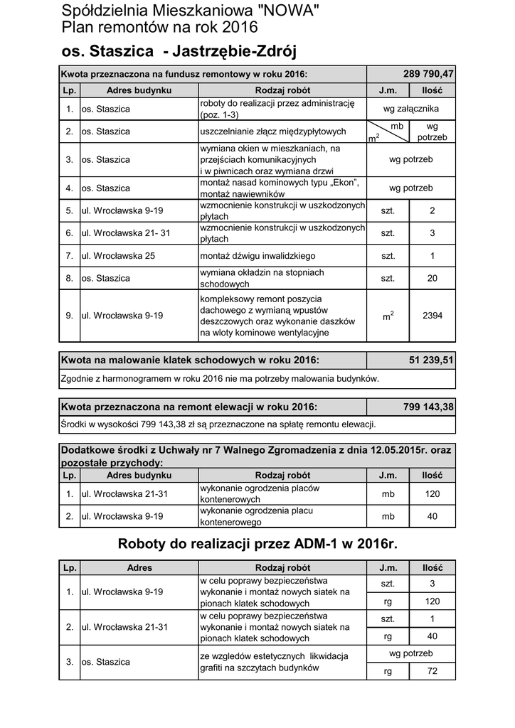 Spółdzielnia Mieszkaniowa "NOWA" Plan remontów na rok 2016 os