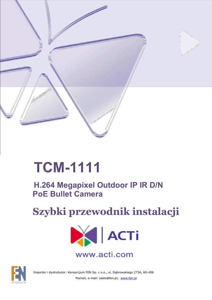 TCM-1111 H.264 Megapixel Outdoor IP IR D/N PoE Bullet Camera Szybki przewodnik instalacji Importer i dystrybutor: Konsorcjum FEN Sp. z o.o., ul. Dąbrowskiego 273A, 60-406 Poznań, e-mail: [email protected]; www.fen.pl Wstęp 1.1 ZAWARTOŚĆ OPAKOWANIA KCM-5111 (nie zawiera uchwytu) CD produktu Karta gwarancyjna Importer i dystrybutor: Konsorcjum FEN Sp. z o.o., ul. Dąbrowskiego 273A, 60-406 Poznań, e-mail: [email protected]; www.fen.pl 1.2 OPIS 1. Port RJ-45 Ethernet Urządzenie IP podłączone jest do Ethernetu poprzez standardowe złącze RJ45. Wspomagając NWAY, to urządzeni IP może automatycznie wykryć szybkość lokalnego segmentu sieci (10BaseT/100Base-TX Ethernet). 2. Przycisk Reset Krok 1: Wyłącz urządzenia IP poprzez odłączenie kabla zasilającego. Krok 2: Naciśnij i przytrzymaj przycisk Reset. Podłącz ponownie kabel zasilający trzymając ciągle przycisk Reset. Krok 3: Przytrzymaj przycisk Reset jeszcze przez chwilę, puść przycisk Reset. Proces trwa około 20 sekund. Jednostka uruchomi się z domyślnymi ustawieniami fabrycznymi. 3. Dioda zasilania Dioda LED zapali się gdy urządzenie z powodzeniem zakończy proces uruchamiania. 1.3 Podłączenie Postępuj zgodnie z poniższymi instrukcjami aby podłączyć kamerę IP z poszczególnymi urządzeniami. Kamerę należy podłączyć do zasilania PoE (Power Over Ethernet) z przełącznika lub injectora: 1) Podłącz kamerę do przełącznika/injectora przewodem CAT5 lub CAT6 2) Podłącz komputer do przełącznika kolejnym przewodem CAT5 lub CAT6 Dostęp do kamery Ta sekcja przeprowadzi Cię w skrócie poprzez obsługę urządzenia. Jeżeli w twojej sieci znajduje się serwer DHCP, kamera uzyska adres IP automatycznie. Aby wyszukać kamerę w sieci skorzystaj z oprogramowania: http://www.acti.com/product/detail/Software/ACTi_Utility_Suite Jeżeli w twojej sieci nie ma serwera DHCP: Domyślnym adresem ip kamery jest 192.168.0.100. Przed przystąpieniem do dalszej obsługi należy upewnić się czy urządzenie oraz komputer PC należą do tego samego segmentu sieciowego. Proszę ustawić następujące wartości: Adres IP: 192.168.0.xxx Adres podsieci: 255.255.255.0 (Uwaga: xxx powinno być wartością z zakresu 1-254, z wykluczeniem wartości 100) Otwórz przeglądarkę internetową ze wskazanym adresem IP UWAGA! Jeśli posiadasz wcześniejszą wersję przeglądarki Internet Explorer zaleca się pobranie najnowszej wersji. UWAGA! Domyślnym adresem IP tego urządzenia jest 192.168.0.100 Zaloguj się przy użyciu domyślnego loginu i hasła konta administratora UWAGA! Domyślnie konto administratora zostało ustawione na: login: Admin hasło: 123456 Kliknij przycisk „Login” aby się zalogować. Podgląd na żywo i konfiguracja Zmiana adresu IP możliwa jest z poziomu ustawień sieciowych Aby zapisać zmiany przejdź do zakładki Save & Reboot