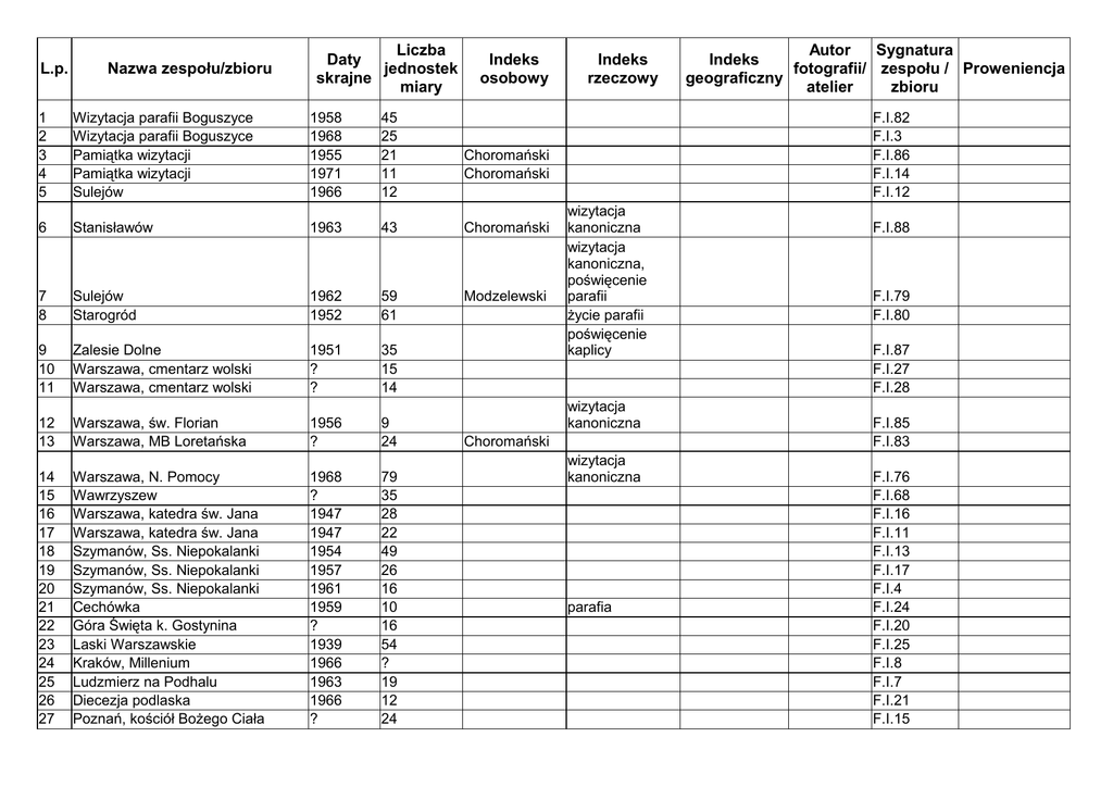 L.p. Nazwa zespołu/zbioru Liczba Daty jednostek skrajne miary Indeks osobowy 1 2 3 4 5 Wizytacja parafii Boguszyce Wizytacja parafii Boguszyce Pamiątka wizytacji Pamiątka wizytacji Sulejów 1958 1968 1955 1971 1966 45 25 21 11 12 6 Stanisławów 1963 43 Choromański 7 8 Sulejów Starogród 1962 1952 59 61 Modzelewski 9 10 11 Zalesie Dolne Warszawa, cmentarz wolski Warszawa, cmentarz wolski 1951 ? ? 35 15 14 12 13 Warszawa, św. Florian Warszawa, MB Loretańska 1956 ? 9 24 14 15 16 17 18 19 20 21 22 23 24 25 26 27 Warszawa, N. Pomocy Wawrzyszew Warszawa, katedra św. Jana Warszawa, katedra św. Jana Szymanów, Ss. Niepokalanki Szymanów, Ss. Niepokalanki Szymanów, Ss. Niepokalanki Cechówka Góra Święta k. Gostynina Laski Warszawskie Kraków, Millenium Ludzmierz na Podhalu Diecezja podlaska Poznań, kościół Bożego Ciała 1968 ? 1947 1947 1954 1957 1961 1959 ? 1939 1966 1963 1966 ? 79 35 28 22 49 26 16 10 16 54 ? 19 12 24 Indeks rzeczowy Autor Sygnatura Indeks fotografii/ zespołu / Proweniencja geograficzny atelier zbioru F.I.82 F.I.3 F.I.86 F.I.14 F.I.12 Choromański Choromański wizytacja kanoniczna wizytacja kanoniczna, poświęcenie parafii życie parafii poświęcenie kaplicy wizytacja kanoniczna Choromański wizytacja kanoniczna parafia F.I.88 F.I.79 F.I.80 F.I.87 F.I.27 F.I.28 F.I.85 F.I.83 F.I.76 F.I.68 F.I.16 F.I.11 F.I.13 F.I.17 F.I.4 F.I.24 F.I.20 F.I.25 F.I.8 F.I.7 F.I.21 F.I.15 28 29 Bieszczady, wakacje chłopców Warszawa, siostry parafialne 1963 ? 57 128 F.I.2 F.I.72 30 31 Piesza pielgrzymka na Jasną Górę Papczyński Stanisław Kościoły Warszawy i inne rysunki A. Pajewskiego Nauka religii Delegacja RP w Moskwie 1921/1922 1955 1963 31 39 F.I.34 F.I.1 1953 8 F.I.6 F.I.5 1922 60 F.I.9 32 33 34 35 Seminarium Warszawskie 1916 55 36 37 Seminarium Warszawskie Polacy XIX w. Warszawa, MB Nieustającej Pomocy Białystok, Millenium Lipków, 15lecie parafii Diecezja podlaska, w millenijnym hołdzie Warszawa, chorzy Papież Pius XII Obrazki świętych Warszawa, kaplica RES SACRA MISER. Zmarli z Rodziny Rodzin Warszawa, przedszkole na ul Racławickiej Ruiny kościoła w Rokitnie Poznań, katedra i inne kościoły Polska w roku 1914/1915 Obrazki o tematyce religijnej Kraków, Wawel Rzym, Watykan Rzym, Watykan Zalerzczyki 1918 53 73 Warszawa: Bogacki Stanisław F.I.53 Warszawa: Bogacki Stanisław F.I.50 F.I.19 1967 1966 1967 31 19 41 F.I.75 F.I.81 F.I.78 1958 33 37 F.I.77 F.I.49 F.I.51 F.I.52 19591964 1962 31 3 F.I.48 F.I.73 3 F.I.18 F.I.59 F.I.66 F.I.61 F.I.54 F.I.58 F.I.74 F.I.65 F.I.57 38 39 40 41 42 43 44 45 46 47 48 49 50 51 52 53 54 55 1966 1961 1914 1902 1915 11 1939 1929 1925 56 57 58 59 63 64 65 Clermont-Ferrand Trzeźwość Katedra warszawska Kapłani z Łucka i Żytomierza Warszawa Falenica, 31 sierpnia 1974 r. Myślenice Skolimów Konwikt księży, Wydział Teologii UW Sitkowski Tadeusz Wilno, Ostra Brama 66 Polska w roku 1914/1915 60 61 62 67 68 69 70 71 72 73 74 Warszawa, seminarium duchowne Polskie Towarzystwo Pomocy Ofiarom Wojny w Piotrogrodzie Pompea Warszawa, MB Częstochowska Pochód narodowy w Warszawie Polska Peciak Kazimierz, pogrzeb Warszawa, Miłosierdzia Bożego 75 76 77 Cechówka Warszawa, NMP Królowej Polski Wesoła, Opatrzności Bożej 78 79 Warszawa, NMP Królowej Świata Warszawa, uroczystość św. Andrzeja, oo. jezuici na Rakowieckiej 1935 1960 1960 1917 47 1974 1969 1926 19291930 1930 1927 19141915 42 20 23 1918 20 50 44 Wyszyński Wojtyła konsekracja kościoła parafia F.I.84 F.I.35 F.I.37 F.I.36 F.I.22 F.I.60 F.I.62 44 1916 1934 1905 1939 1966 1977 19341959 1978 F.I.56 F.I.41 F.I.69 F.I.71 Warszawa: Bogacki Stanisław F.I.26 34 10 F.I.55 F.I.38 F.I.10 F.I.67 F.I.63 F.I.64 F.I.39 9 10 81 F.I.23 F.I.45 F.I.94a-b 16 32 19771980 34 Warszawa: Krzywańska E., Malinowski R., Rzepecki R. F.I.70 1978 13 F.I.92 80 81 82 83 84 85 Białystok, kościoły 1966 Kraków, Millenium 1966 Sandomierz 1967 Jubileuszowa pielgrzymka Krakowian do sanktuarium Krzyża Świętego w Mogile e Roku Świętym, 15 września 1974 1974 Mogiła, opactwo Cystersów 1972 Konsekracja kościoła Matki Boskiej Częstochowskiej patronki Armii Krajowej w Warszawie przy ul. Zagórnej 5, 26 września 1993r. 1993 18 39 11 Wojtyła F.I.43 F.I.93 F.I.91 19 26 Wojtyła Wojtyła F.I.90 F.I.89 15 93 94 Profesorowie i kapłani seminarium warszawskiego wyświęceni 1 czerwca 1969 r. 1969 Politechnika Warszawska Gniezno, wizyta papieża Jana Pawła II, 3 czerwca 1979 r. 1979 Ss. Zmartwychwstanki, wizyta biskupów warszawskich, 23 stycznia 1983r. 1983 I pielgrzymka papieża Jana Pawła II w Polsce, 2-10 czerwca 1979r. 1979 Wizyta papieża Jana Pawła II w Walii, 2 czerwca 1982 r. 1982 Maria Cetys Centrum Informacji, spotkań, dialogu, wychowania i modlitwy w 1992Oświęcimiu 1993 Taciszów, dzwony 95 96 Glinianka, wizytacja duszpasterska 1954 Kołbiel 1959 97 1958 106 1933 1961 1948 2 39 25 86 87 88 89 90 91 92 Kutno, wizytacja kanoniczna Lubanie, 25lecie kapłaństwa ks. 98 F.S. Wojewódzkiego 99 Łomianki 100 Milanówek, św. Jadwigi 6 16 F.I.29 F.I.30 F.I.32 Glemp 23 10 F.I.31 Dąbrowski, Glemp F.I.33 30 F.I.40 28 1 F.I.42 F.I.44 45 7 F.I.46 F.I.47 Modzelewski wizytacja kanoniczna wizytacja kanoniczna F.I.127 F.I.114 F.I.124 F.I.98 F.I.186 F.I.183 22.08.1997 Kuria Metropolitalna Warszawska Milanówek, św. Jadwigi, 101 konsekracja kościoła 102 Miedniewice 103 Pruszków, św. Kazimierz 1948 1967 1962 104 Pruszków, poświęcenie chrzcielnicy 1967 105 Pruszków, wizytacja kanoniczna 1967 106 Skolimów, wizytacja pasterska 1950 113 29 24 18 37 23 Wyszyński Modzelewski Choromański konsekracja kościoła F.I.102 F.I.129 F.I.139 F.I.135 F.I.111 F.I.141