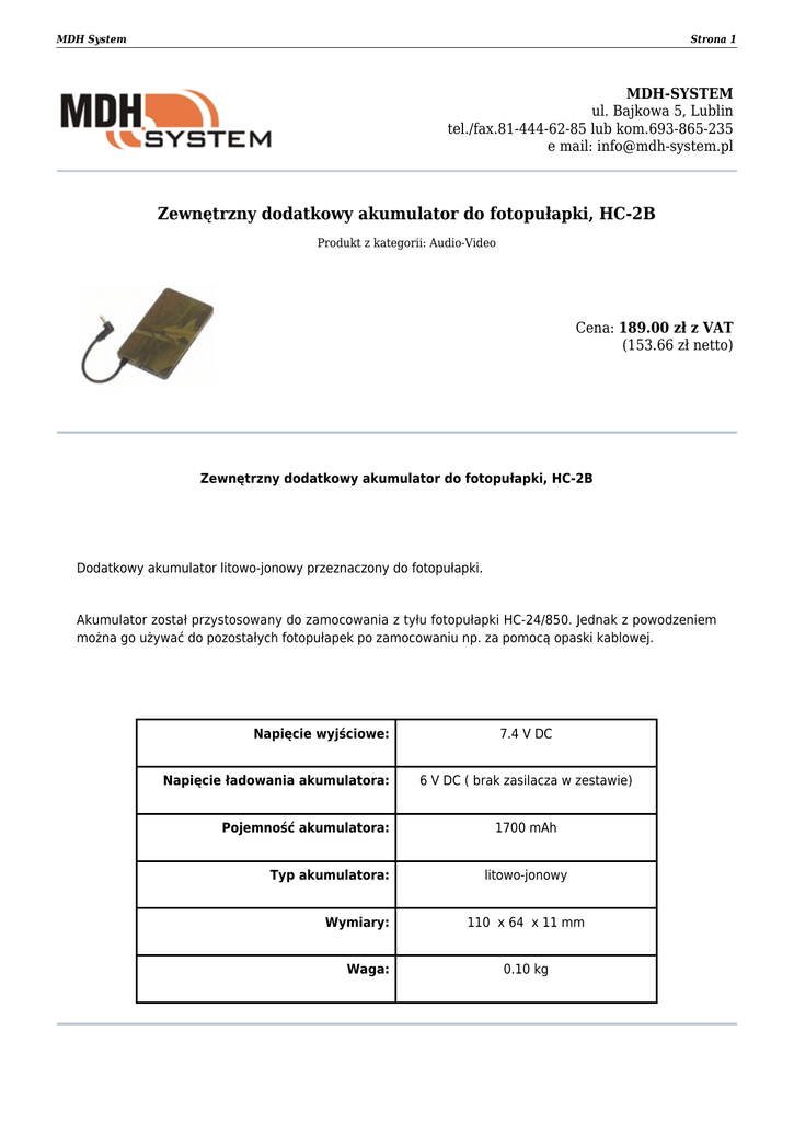 Zewnętrzny dodatkowy akumulator do fotopułapki, HC - Mdh