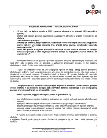PROBLEMY ALKOHOLOWE – POLSKA, EUROPA, ŚWIAT - 1,8 mln ludzi na świecie zmarło w 2002 z powodu alkoholu – co stanowi 3,2% wszystkich zgonów;* alkohol jest trzecim głównym czynnikiem zagrażającym zdrowiu w krajach rozwiniętych, za nikotyną i nadciśnieniem tętniczym;* konsumpcja alkoholu jest podłożem 9% wszystkich chorób w Europie np.: wielu przypadków chorób wątroby, wysokiego ciśnienia krwi, chorób serca, zawału, nowotworów przewodu pokarmowego itp.;** ponad 90% państw w regionie europejskim rejestruje roczne spożycie alkoholu na jednego mieszkańca powyżej 2 litrów czystego alkoholu. Europa ma najwyższe spożycie alkoholu na całym świecie;** Po wstąpieniu Polski do UE pojawią się kolejne zagrożenia związane z problematyką alkoholową. Od maja 2004 roku będziemy mieć do czynienia z ułatwionym przepływem towarów, w tym napojów alkoholowych, między Polską a pozostałymi krajami UE. To jak i czy wstąpienie Polski do Unii Europejskiej wpłynie na mapę i zasięg polskich problemów alkoholowych, będziemy mogli sprawdzić dopiero za jakiś czas. Już teraz jednak musimy zdać sobie sprawę z istniejących w tej kwestii zagrożeń. W ostatnich latach, w krajach UE, wzrasta świadomość znaczenia problematyki alkoholowej dla polityki zdrowotnej i społecznej wobec obywateli wspólnoty. Wyrazem tego jest ilość instytucji rządowych i organizacji pozarządowych zajmujących się tą problematyką oraz jakość i zakres ich działań. Z inicjatywy Ministra Zdrowia Szwecji podjętej wspólnie z Ministrem Zdrowia Irlandii, polityka wobec alkoholu w Zjednoczonej Europie jest priorytetem zdrowia publicznego w Unii Europejskiej podczas prezydentury Irlandii (od stycznia 2004 roku). Wśród zagadnień, objętych szczególną troską w tym zakresie są: - picie alkoholu przez młodzież i działania zmierzające do redukcji wielkości spożycia alkoholu przez nieletnich; agresywna reklama napojów alkoholowych skierowana do grupy młodych konsumentów; działania zmierzające do zmniejszenia rozmiaru szkód zdrowotnych związanych z piciem alkoholu; promocja postaw wspomagających racjonalną kontrolę nad rynkiem napojów alkoholowych wśród osób podejmujących decyzje w tym obszarze. W regionie europejskim widać pewne trendy. Kraje północne utrzymują stałe tendencje w spożyciu alkoholu – z wyjątkiem Szwecji, gdzie spożycie spada. Konsumpcja powiększa się na Litwie, Łotwie, podczas gdy spożycie 1 Państwowa Agencja Rozwiązywania Problemów Alkoholowych 01-458 Warszawa, ul. Szańcowa 25 fax: (0-22) 836-81-66, tel. (0-22) 532-03-20, http://www.parpa.pl w Estonii spada. Wśród krajów Unii Europejskiej Irlandia jest krajem gdzie konsumpcja alkoholu rośnie znacząco, w mniejszym zasięgu rośnie też w Grecji, Luxemburgu i Portugalii. W krajach Europy Środkowej i Wschodniej konsumpcja rośnie w Republice Czeskiej, Rumunii i Macedonii. Konsumpcja rośnie również na Białorusi i Federacji Rosyjskiej. Każdego roku ok. 55 000 młodych Europejczyków traci życie na skutek efektów nadużywania alkoholu – jedna z czterech śmierci w grupie wiekowej 15-29 jest spowodowana alkoholem. Koszty związane z pomocą społeczną, służbą zdrowia, ubezpieczeniami, wymiarem sprawiedliwości i więziennictwa pochodne picia alkoholu oraz koszty związane ze stratami w sektorze produkcyjnym stanowią duże sumy całego dochodu społeczności Europy (1-3%). Badanie ESPAD (przeprowadzane co 4 lata w 26 krajach europejskich wśród uczniów szkół średnich, którego celem jest diagnoza używania przez nich substancji psychoaktywnych) pokazują, że wzrasta liczba uczniów i studentów, którzy używają alkoholu, szczególnie w Centralnej i Wschodniej Europie: na Litwie, w Polsce, na Słowacji i w Słowenii. W innych krajach picie alkoholu wśród młodzieży jest również zjawiskiem powszechnym. Z czterech krajów o największym wskaźniku intoksykacji w 1995 roku: Danii, Irlandii, Finlandii i Wielkiej Brytanii, Dania i Irlandia zanotowała jeszcze większy jej wzrost, podczas gdy w Finlandii i Wielkiej Brytanii statystyki się nie zmieniły. Szacuje się, że w Polsce w rodzinach z problemem alkoholowym żyje 3-4 mln osób, w tym 800 tyś. osób uzależnionych, 1,5 mln współuzależnionych, 1,5-2 mln dzieci alkoholików. Wynika z tego, że ponad 2 proc. całej populacji jest uzależniona od alkoholu, jednak tylko ok. 30 procent zarejestrowanych pacjentów ma możliwość skorzystania z nowoczesnej i skutecznej terapii leczenia uzależnienia. Z badań zrealizowanych w ubiegłym roku na zlecenie Państwowej Agencji Rozwiązywania Problemów Alkoholowych wynika, że ok. 2,5 mln osób w Polsce nadużywa alkoholu. Duża część z tych osób leczy się w placówkach podstawowej i specjalistycznej opieki zdrowotnej, z powodu zaburzeń układu trawiennego, krążenia, neurologicznego, chorób płuc, nowotworów i urazów.*** Wyniki badań wskazują, iż 71% polskiej młodzieży w wieku 11–15 lat próbowało napojów alkoholowych, w tym 20% 11–latków. Młodzi ludzie najczęściej sięgają po piwo. W 2002 roku, co najmniej raz w miesiącu konsumentami piwa było prawie 8% uczniów w wieku 11–15 lat, a wino i wódkę piło 4%. Wyniki najnowszych badań wskazują na prawie 30% wzrost odsetka upijających się dziewcząt oraz na niewielkie zahamowanie niekorzystnych zmian obserwowanych w latach 90, wśród chłopców.*** * Raportu o stanie zdrowia na świecie 2002 - WHO ** The European Health Report 2002 – WHO *** Sprawozdanie z realizacji ustawy o wychowaniu w trzeźwości i przeciwdziałaniu alkoholizmowi 2002 – Ministerstwo Zdrowia 2 Państwowa Agencja Rozwiązywania Problemów Alkoholowych 01-458 Warszawa, ul. Szańcowa 25 fax: (0-22) 836-81-66, tel. (0-22) 532-03-20, http://www.parpa.pl