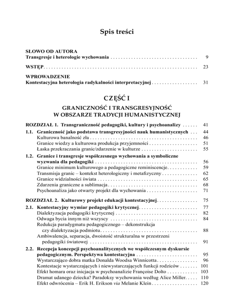 Spis treści Słowo od Autora Transgresje i heterologie wychowania. . . . . . . . . . . . . . . . . . . . . . . . . . . . . . . . . . . 9 Wstęp. . . . . . . . . . . . . . . . . . . . . . . . . . . . . . . . . . . . . . . . . . . . . . . . . . . . . . . . . . . . . 23 Wprowadzenie Kontestacyjna heterologia radykalności interpretacyjnej. . . . . . . . . . . . . . . . . . . 31 CZĘŚĆ I GRANICZNOŚĆ I TRANSGRESYJNOŚĆ W OBSZARZE TRADYCJI HUMANISTYCZNEJ ROZDZIAŁ 1. Transgraniczność pedagogiki, kultury i psychoanalizy . . . . . . . 1.1. Graniczność jako podstawa transgresyjności nauk humanistycznych . . . . Kulturowa banalność zła. . . . . . . . . . . . . . . . . . . . . . . . . . . . . . . . . . . . . . . . . . . Granice wiedzy a kulturowa produkcja przyjemności. . . . . . . . . . . . . . . . . . . . Łaska przekraczania granic/zdarzenie w kulturze. . . . . . . . . . . . . . . . . . . . . . . 1.2. Granice i transgresje współczesnego wychowania a symboliczne wyzwania dla pedagogiki. . . . . . . . . . . . . . . . . . . . . . . . . . . . . . . . . . . . . . . . . Granice minimum kulturowego a pedagogiczne reminiscencje. . . . . . . . . . . . . Transmisja granic – kontekst heterologiczny i metafizyczny. . . . . . . . . . . . . . . Granice widzialności świata . . . . . . . . . . . . . . . . . . . . . . . . . . . . . . . . . . . . . . . . Zdarzenia graniczne a sublimacja. . . . . . . . . . . . . . . . . . . . . . . . . . . . . . . . . . . . Psychoanaliza jako otwarty projekt dla wychowania. . . . . . . . . . . . . . . . . . . . . 41 44 46 51 55 56 59 62 65 68 71 ROZDZIAŁ 2. Kulturowy projekt edukacji kontestacyjnej. . . . . . . . . . . . . . . . . 2.1. Kontestacyjny wymiar pedagogiki krytycznej. . . . . . . . . . . . . . . . . . . . . . . . Dialektyzacja pedagogiki krytycznej. . . . . . . . . . . . . . . . . . . . . . . . . . . . . . . . . Odwaga bycia innym niż wszyscy . . . . . . . . . . . . . . . . . . . . . . . . . . . . . . . . . . . Redukcja paradygmatu pedagogicznego – dekonstrukcja czy dialektyzacja podmiotu. . . . . . . . . . . . . . . . . . . . . . . . . . . . . . . . . . . . . . . Ambiwalencja, separacja, dwoistość strukturalna w przestrzeni pedagogiki światowej . . . . . . . . . . . . . . . . . . . . . . . . . . . . . . . . . . . . . . . . . . . 2.2.Recepcja koncepcji psychoanalitycznych we współczesnym dyskursie pedagogicznym. Perspektywa kontestacyjna. . . . . . . . . . . . . . . . . . . . . . . . . Wystarczająco dobra matka Donalda Woodsa Winnicotta. . . . . . . . . . . . . . . . . Kontestacje wystarczających i niewystarczających funkcji rodziców. . . . . . . . Efekt homara oraz inicjacja w psychoanalizie Françoise Dolto. . . . . . . . . . . . . Dramat udanego dziecka? Paradoksy wychowania według Alice Miller. . . . . Efekt odwrócenia – Erik H. Erikson via Melanie Klein. . . . . . . . . . . . . . . . . . . 75 77 82 84 88 91 95 96 101 103 110 120 6 Spis treści CZĘŚĆ II PSYCHOANALITYCZNA TRANSGRESYJNOŚĆ W PERSPEKTYWIE GRANICZNOŚCI PRAKTYKI WYCHOWAWCZEJ. PERSPEKTYWA KONTESTACYJNA ROZDZIAŁ 3. Psychoanalityczne pogranicza wychowania. Struktura społeczna a rozwój podmiotu. . . . . . . . . . . . . . . . . . . . . . . . . . . . . 3.1. Freudowska kultura popędu śmierci. . . . . . . . . . . . . . . . . . . . . . . . . . . . . . . . Spór o psychoanalizę. . . . . . . . . . . . . . . . . . . . . . . . . . . . . . . . . . . . . . . . . . . . . . Popęd jako podstawa rozwoju. . . . . . . . . . . . . . . . . . . . . . . . . . . . . . . . . . . . . . . Podmiot w stanie wojny. . . . . . . . . . . . . . . . . . . . . . . . . . . . . . . . . . . . . . . . . . . . 3.2.Transgresje i hipokryzje kultury. . . . . . . . . . . . . . . . . . . . . . . . . . . . . . . . . . . Kulturowa racjonalizacja więzi libidynalnych . . . . . . . . . . . . . . . . . . . . . . . . . . Mit różnicy biologicznej jako determinanty aktywności popędowej. . . . . . . . . Kompleksy rodzinne. . . . . . . . . . . . . . . . . . . . . . . . . . . . . . . . . . . . . . . . . . . . . . Sublimacja jako przekroczenie kulturowej transgresji. . . . . . . . . . . . . . . . . . . . Rozdział 4. Społeczeństwo bez ojca Jacques’a Lacana. . . . . . . . . . . . . . . . . . 4.1. Spór o Imię Ojca – psychoanalityczna baśń o Ojcu i Matce . . . . . . . . . . . . . Różnicowanie płci jako akt mowy. . . . . . . . . . . . . . . . . . . . . . . . . . . . . . . . . . . . Frustracja domagania się – jako szansa na dialektyzację pragnienia. . . . . . . . . Historia Imienia Ojca (Les Noms-du-Pere). . . . . . . . . . . . . . . . . . . . . . . . . . . . . Seksualność a tożsamość płciowa w rozwoju podmiotu . . . . . . . . . . . . . . . . . . 4.2. Śladem (nie)obecnego ojca. Rany nie tylko symboliczne. . . . . . . . . . . . . . . . Paternalny i maternalny porządek symboliczny. . . . . . . . . . . . . . . . . . . . . . . . . Deficyt funkcji ojcowskiej w aspekcie podmiotowego kryzysu rozwojowego . . . . . . . . . . . . . . . . . . . . . . . . . . . . . . . . . . . . . . . . . . . . . . . . . . Figury rodzicielskie wobec transmisji kodu kulturowego . . . . . . . . . . . . . . . . . Romans rodzinny jako porządek faktów rozwojowych . . . . . . . . . . . . . . . . . . . Fratenizacja funkcji ojcowskiej. . . . . . . . . . . . . . . . . . . . . . . . . . . . . . . . . . . . . . 127 130 131 137 152 158 159 162 166 168 173 178 179 181 182 186 188 190 196 198 201 204 CZĘŚĆ III PEDAGOGICZNY PROJEKT ZMIANY STRATEGII WYCHOWANIA. RYZYKO JAKO WARUNEK ROZWOJU Rozdział 5. Pedagogika (nie)widzialna. Kształtowanie świadomości pedagogicznej w perspektywie psychoanalizy Lacanowskiej. . . . . . . . . . . . 5.1.Psychoanaliza jako interpretacja i jako klinika – w stronę pedagogiki poszukującej. . . . . . . . . . . . . . . . . . . . . . . . . . . . . . . . . . . . . . . . . . . . . . . . . . . . Wprowadzenie do kliniki podmiotu. . . . . . . . . . . . . . . . . . . . . . . . . . . . . . . . . . Figury 
