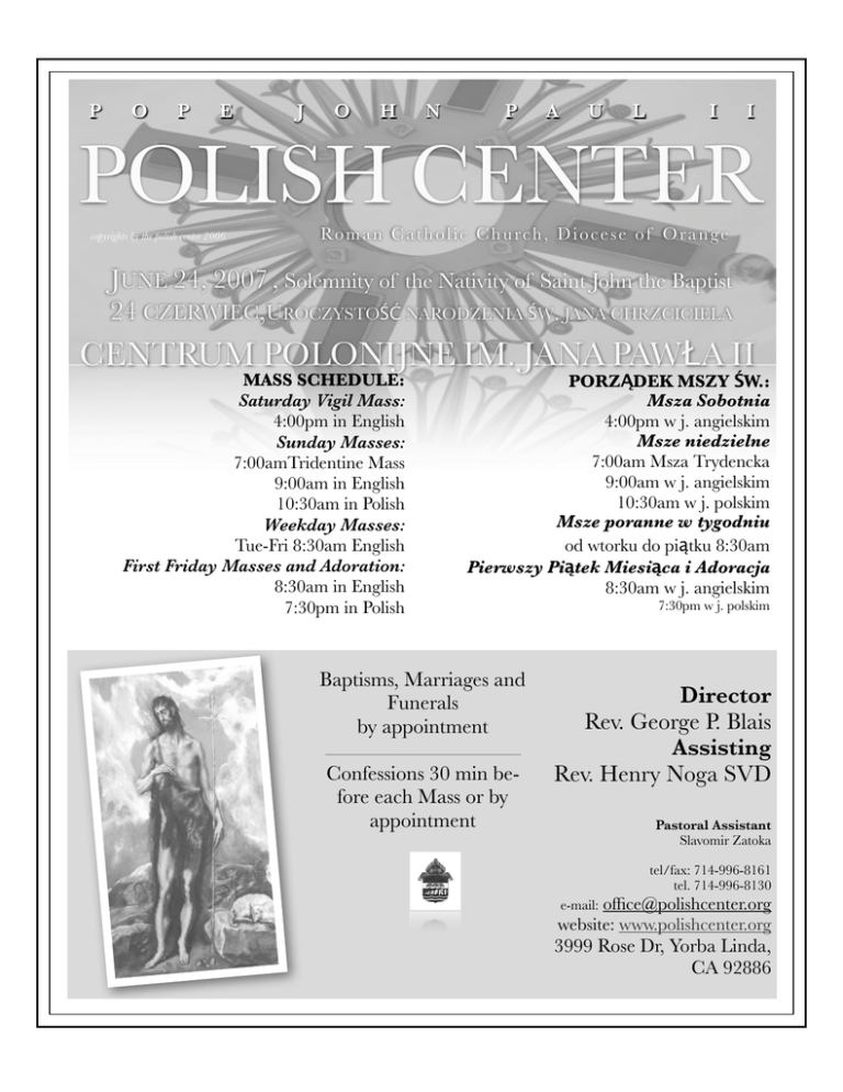 P O P E J O H N P A U L I I POLISH CENTER copyrights by the polish center 2006 Ro m a n C a t h o l i c C h u r c h , D i o c e s e o f O r a n g e JUNE 24, 2007 , Solemnity of the Nativity of Saint John the Baptist 24 CZERWIEC,UROCZYSTO!" NARODZENIA !W. JANA CHRZCICIELA CENTRUM POLONIJNE IM. JANA PAW#A II MASS SCHEDULE: Saturday Vigil Mass: 4:00pm in English Sunday Masses: 7:00amTridentine Mass 9:00am in English 10:30am in Polish Weekday Masses: Tue-Fri 8:30am English First Friday Masses and Adoration: 8:30am in English 7:30pm in Polish PORZ!DEK MSZY "W.: Msza Sobotnia 4:00pm w j. angielskim Msze niedzielne 7:00am Msza Trydencka 9:00am w j. angielskim 10:30am w j. polskim Msze poranne w tygodniu od wtorku do pi$tku 8:30am Pierwszy Pi#tek Miesi#ca i Adoracja 8:30am w j. angielskim Baptisms, Marriages and Funerals by appointment Confessions 30 min before each Mass or by appointment 7:30pm w j. polskim Director Rev. George P. Blais Assisting Rev. Henry Noga SVD Pastoral Assistant Slavomir Zatoka tel/fax: 714-996-8161 tel. 714-996-8130 e-mail: [email protected] website: www.polishcenter.org 3999 Rose Dr, Yorba Linda, CA 92886 Page 2 MESSAGE FROM THE DIRECTOR Feast of the Birth of John the Baptist June 23 -24 Today we celebrate the Solemn Feast of the birth of John the Baptist. This is an important day in the life of the Church because it reminds us of how all human beings are invited to share in the work of the Lord. The scriptures give us many examples of how people cooperated with God to bring His message to the world. John had an important role in introducing the Lord Jesus to the world and preparing the people of Jesus’ time to receive the Lord. He proclaimed the need for repentance and open hearts to receive Jesus’ message and he pointed to Jesus when He finally arrived. He said: I must decrease so that He may increase. We are invited to follow the humble example of John the Baptist. In the Gospel today, we are reminded that John’s mother and father also participated in the work of the Lord as they heard the message the God concerning the name of their son. Elizabeth and Zechariah knew that their child was destined for greatness because they recognized that this son of theirs was a true gift from God in their old age. We also know that John is connected in a special way to Jesus in that their mothers were related. Mary, the mother of Jesus went to care for John’s mother Elizabeth in her pregnancy. We are all invited to reach out to the needs of others throughout our lives, even when it may not seem convenient. On this special day, may we be reminded to recognize the invitation to be a part of God’s plan in and for the world, and may we always respond generously to that invitation. We have been given many examples of this reality from the past and seek to follow these examples. May God Bless you and Mary Keep you, SŁOWO NA NIEDZIELĘ Uroczystość Narodzenia św. Jana Chrzciciela 24 czerwiec, 2007 Dzisiejsze święto Narodzenia Jana Chrzciciela jest ważnym dniem w życiu Kościoła, ponieważ przypomina nam ono o tym, że wszyscy jesteśmy zaproszeni do kontynuowania dzieła naszego Pana. Ewangelia daje nam wiele przykładów ludzkiej wspołpracy z Bogiem w ogłaszaniu światu Jego nowiny. Św. Jan miał znaczącą rolę w przygotowaniu ludzi do nadejścia Jezusa. Głosił potrzebę otwarcia ludzkich serc na przyjście Jezusa, oczyszczenia i żalu na popełnione grzechy. Pamiętajmy słowa św. Jana: „Potrzeba, by On wzrastał, a ja się umniejszał” (J 23,30). Skromność św. Jana jest godna naśladowania. Z dzisiejszej Ewangelii dowiadujemy się o rodzicach Jana Chrzciciela, którzy również byli częścią boskiego planu i usłyszeli słowa Boga mówiące o ich synu i jego przeznaczeniu. Elżbieta i Zachariasz wiedzieli, że ich syn będzie wypełniał wolę boską i wdzięczni byli za dar potomstwa w tak późnym wieku. Matka Jana i matka Jezusa były ze sobą spokrewnione. Maria, matka Jezusa opiekowała się Elżbietą kiedy ta była brzemienna. Pamiętajmy aby wyciągać pomocną dłoń do innych napotkanych w naszym życiu ludzi, nawet jeśli wydaje się nam, że nie będzie to łatwe. Pamiętajmy również o zaproszeniu jakie otrzymujemy od Boga aby brać udział w głoszeniu Dobrej Nowiny i jak ważne jest by w pełni na to wezwanie odpowiedzieć. Niech wydarzenia o których dziś mowa w Ewangelii będą dla nas przykładem. Niech Wam Bóg Błogosławi i Maryja Panna ma w opiece, Ks. George P. Blais Dyrektor Fr. George P. Blais Director READINGS FOR THE WEEK Gn 12:1-9; Mt 7:1-5 Gn 13:2, 5-18; Mt 7:6, 12-14 Gn 15:1-12, 17-18; Mt 7:15-20 Gn 16:1-12, 15-16 [6b-12, 15-16]; Mt 7:21-29 Vigil: Acts 3:1-10; Gal 1:11-20; Jn 21:15-19 Day: Acts 12:1-11; 2 Tm 4:6-8, 17-18; Mt 16:13-19 Sat: Gn 18:1-15; Mt 8:5-17 Sun: 1 Kgs 19:16b, 19-21; Ps 16; Gal 5:1, 13-18; Lk 9:51-62 Mon: Tue: Wed: Thu: Fri: Page 3 KOMENTARZ LITURGICZNY Cykl C, 12 Niedziela Roku Czytania: Za. 12:10-11; Ga. 3:26-29; Łk. 9:18-24 ... A wy za kogo Mnie uważacie? Takie pytanie zadał Chrystus Pan apostołom - jak słyszeliśmy w dzisiejszej Ewangelii. To pytanie jest niezmiernie ważne i stosuje się do każdego z nas: Kim jest dla mnie Jezus Chrystus? Jest ono istotne dlatego, że bez postawienia go - i co więcej, bez prawidłowej odpowiedzi na nie - nie możemy widzieć Chrystusa w sposób prawidłowy, a nasze chrześcijaństwo byłoby bez podstawy, bez treści i bez celu. Od dawien dawna Jezus Chrystus był postacią dyskusyjną i jest nią do dziś. Jak powiedział nasz papież Jan Paweł II - jest Znakiem Sprzeciwu. Jezus jest albo niczym, nie ma nic do powiedzenia i nic nie znaczy, albo też jest odkrywcą tajemnic Bożych, Słowem Bożym danym jako odpowiedź na wszystkie pytania człowieka. Sędzią, który roztrzyga, kto ocaleje, a kto zginie i który znowu przyjdzie ku przerażeniu tych, co mniemali, że Go zabili i chcieli Go przeoczyć i zapomnieć. Chrystus był, jest i pozostanie wielką z