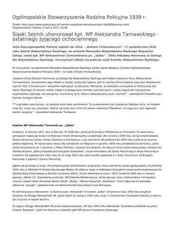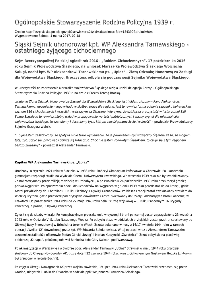 Ogólnopolskie Stowarzyszenie Rodzina Policyjna 1939 r. Źródło: http://osrp.slaska.policja.gov.pl/?serwis=srp&dzial=aktualnosci&id=184390&drukuj=html Wygenerowano: Sobota, 4 marca 2017, 02:48 Śląski Sejmik uhonorował kpt. WP Aleksandra Tarnawskiego ostatniego żyjącego cichociemnego Sejm Rzeczypospolitej Polskiej ogłosił rok 2016 - „Rokiem Cichociemnych”. 17 października 2016 roku Sejmik Województwa Śląskiego, na wniosek Marszałka Województwa Śląskiego Wojciecha Saługi, nadał kpt. WP Aleksandrowi Tarnawskiemu ps. „Upłaz” - Złotą Odznakę Honorową za Zasługi dla Województwa Śląskiego. Uroczystość odbyła się podczas sesji Sejmiku Województwa Śląskiego. W uroczystości na zaproszenie Marszałka Województwa Śląskiego wzięła udział delegacja Zarządu Ogólnopolskiego Stowarzyszenia Rodzina Policyjna 1939 r. na czele z Prezes Teresą Bracką. „Nadanie Złotej Odznaki Honorowej za Zasługi dla Województwa Śląskiego jest hołdem złożonym Panu Aleksandrowi Tarnawskiemu, docenieniem jego wkładu w służbę i pracę dla regionu. Jest to również forma oddania szacunku bohaterskim czynom 316 cichociemnych i wszystkim walczącym za Ojczyznę. Wierzymy, że dzisiejsza uroczystość w historycznej Sali Sejmu Śląskiego to również istotny wkład w propagowanie wartości patriotycznych i ważny sygnał dla mieszkańców województwa śląskiego, że szanujemy i doceniamy tych, którym zawdzięczamy życie i wolność” – powiedział Przewodniczący Sejmiku Grzegorz Wolnik. "T o jaj estem zaszczycony, że spotyka mnie takie wyróżnienie. To ja powinienem być wdzięczny Śląskowi za to, że mogłem tutaj żyć, uczyć się, pracować i dobrze się tutaj czuć. Choć nie jestem rodowitym Ślązakiem, to czuję się z tym regionem bardzo związany” – powiedział Aleksander Tarnawski. Kapitan WP Aleksander Tarnawski ps. „Upłaz” Urodzony 8 stycznia 1921 roku w Słocinie. W 1938 roku ukończył Gimnazjum Państwowe w Chorzowie. Po ukończeniu gimnazjum rozpoczął studia na Wydziale Chemii Uniwersytetu Lwowskiego. We wrześniu 1939 roku nie był zmobilizowany. Został zatrzymany przez milicję radziecką w Drohobyczu, a po zwolnieniu 26 października 1939 roku przekroczył granicę polsko-węgierską. Po opuszczeniu obozu dla uchodźców na Węgrzech w grudniu 1939 roku przedostał się do Francji, gdzie został przydzielony do 1 batalionu 1 Pułku Piechoty 1 Dywizji Grenadierów. Po klęsce Francji został ewakuowany statkiem do Wielkiej Brytanii, gdzie przeszedł pod brytyjskie dowództwo i został skierowany do Szkoły Podchorążych Broni Pancernej w Crawford. Od października 1941 roku do 22 maja 1943 roku pełnił służbę wojskową w 1 Pułku Pancernym 16 Brygady Pancernej, a później 1 Dywizji Pancernej. Zgłosił się do służby w kraju. Po konspiracyjnym przeszkoleniu w dywersji i broni pancernej został zaprzysiężony 23 września 1943 roku w Oddziale VI Sztabu Naczelnego Wodza. Po odbyciu stażu w oddziałach brytyjskich został przetransportowany do Głównej Bazy Przerzutowej w Brindisi na terenie Włoch. Zrzutu dokonano w nocy z 16/17 kwietnia 1944 roku w ramach operacji „Weller 12” dowodzonej przez kpt. WP Edwarda Bohdanowicza. W tej operacji wraz z Aleksandrem Tarnawskim zrzuceni zostali także oficerowie Stefan Górski „Brzeg” i Marian Kuczyński „Zwrotnica”. Zrzut odbył się na placówkę odbiorczą „Kanapa”, położoną koło wsi Baniocha koło Góry Kalwarii pod Warszawą. Po aklimatyzacji w Warszawie i w Świdrze ppor. Aleksander Tarnawski „Upłaz” otrzymał w maju 1944 roku przydział służbowy do Okręgu Nowogródek AK, gdzie dotarł 22 czerwca 1944 roku, wraz z cichociemnym Gustawem Heczką (z którym był zrzucony w rejonie Bochni). Po zajęciu Okręgu Nowogródek AK przez wojska sowieckie, 19 lipca 1944 roku Aleksander Tarnawski przedostał się przez Grodno, Białystok i Lublin do Otwocka w oddziale ppłk WP Janusza Prawdzica-Szlaskiego. W 1945 roku Aleksander Tarnawski podjął pracę w Polskim Radiu w Warszawie. Po zakończeniu wojny całe życie zawodowe związał ze Śląskiem. Do 1947 roku pracował jako laborant w na kopalni „Walenty - Wawel” w Rudzie Śląskiej, następnie studiował na Wydziale Chemicznym Politechniki Śląskiej. Studia te ukończył w 1949 roku z tytułem magistra inżyniera chemika. W kolejnych latach pracował m.in. jako młodszy asystent, a później starszy asystent w katedrze Chemii Fizycznej Politechniki Śląskiej, adiunkt w Instytucie Metali Nieżelaznych, starszy inżynier laboratoryjny w Instytucie Przemysłu Tworzyw i Farb w Gliwicach. W roku 1990 przeszedł na emeryturę. Dziś Aleksander Tarnawski współdziała z jednostką WP AGAT w Gliwicach, propagując i kultywując tradycje patriotyczne, szczególnie wśród młodzieży. W 2016 roku opublikowana została książka o jego losach i walce pt. ,,Ostatni”. 7 września 2014 roku, w wieku 93 lat, wykonał w tandemie spadochronowym kolejny skok z żołnierzami jednostki AGAT. Obecnie jest honorowym kombatantem Jednostki Wojskowej AGAT, która dziedziczy tradycje i obyczaje cichociemnych. Aleksander Tarnawski za waleczność na polu walki został odznaczony czterokrotnie Krzyżem Walecznych, a za pracę zawodową otrzymał Srebrny Krzyż Zasługi. Ocena: 0/5 (0) Tweetnij