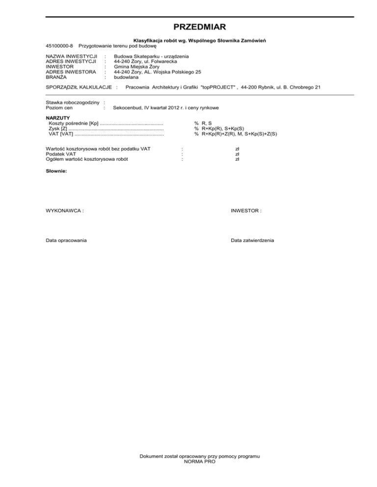 PRZEDMIAR 45100000-8 Klasyfikacja robót wg. Wspólnego Słownika Zamówień Przygotowanie terenu pod budowę NAZWA INWESTYCJI ADRES INWESTYCJI INWESTOR ADRES INWESTORA BRANŻA : : : : : Budowa Skateparku - urządzenia 44-240 Żory, ul. Folwarecka Gmina Miejska Żory 44-240 Żory, AL. Wojska Polskiego 25 budowlana SPORZĄDZIŁ KALKULACJE : Stawka roboczogodziny : Poziom cen : Pracownia Architektury i Grafiki "topPROJECT" , 44-200 Rybnik, ul. B. Chrobrego 21 Sekocenbud, IV kwartał 2012 r. i ceny rynkowe NARZUTY Koszty pośrednie [Kp] ............................................ Zysk [Z] .................................................................. VAT [VAT] .............................................................. Wartość kosztorysowa robót bez podatku VAT Podatek VAT Ogółem wartość kosztorysowa robót % R, S % R+Kp(R), S+Kp(S) % R+Kp(R)+Z(R), M, S+Kp(S)+Z(S) : : : zł zł zł Słownie: WYKONAWCA : INWESTOR : Data opracowania Data zatwierdzenia Dokument został opracowany przy pomocy programu NORMA PRO Skatepark - urządzenia 4szt. PRZEDMIAR Lp. Podstawa Opis i wyliczenia j.m. Poszcz Razem Dział: 45000000-7 Roboty budowlane 1 Grupa objęta zamówieniem:45100000-8 Przygotowanie terenu pod budowę; Klasa: 45110000-1 Roboty w zakresie burzenia i rozbiórki obiektów budowlanych;roboty ziemne; Kategoria robót: 45111000-8 Roboty w zakresie burzenia, roboty ziemne; Podkategoria: 45111291-4 Roboty w zakresie zagospodarowania terenu 1.1 Elementy Skateparku 1 Kalkulacja Dostawa i montaż Quarter pipe plus roll-in (urządzeni nr 2) kpl. d.1. indywidualna 1 1 kpl. 1.00 RAZEM 1.00 2 Kalkulacja Dostawa i montaż 2 x Quarter pipe plus Wall (urządzenie nr 8) kpl. d.1. indywidualna 1 1 kpl. 1.00 RAZEM 1.00 3 Kalkulacja Dostawa i montaż Jumpbox do skoków (urządzenie nr 9) kpl. d.1. indywidualna 1 1 kpl. 1.00 RAZEM 1.00 4 Kalkulacja Dostawa i montaż Spin ramp 170 asymetryczny (urządzenie nr 10) kpl. d.1. indywidualna 1 1 kpl. 1.00 RAZEM 1.00 -2- Norma PRO Wersja 4.31 Nr seryjny: 4510