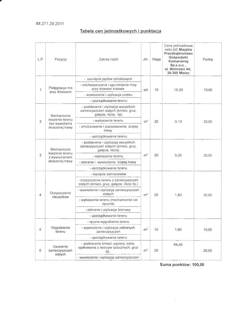 IM.271.29.2011 Tabela cen jednostkowych i punktacja I Cena jednostkowa netto [z!] Miejskie Przedsi~biorstwo L.P. Pozycja Zakres robot 1 Piel~gnacja mis przy drzewach usuni~cie p~dow -_.. Gospodarki Komunalnej Sp.z_o.o. , ul. Wolnosci 44; 39-300 Mielec Jm. Waga szt 10 15,00 10,00 m2 20 0,10 20,00 m2 20 0,30 20,00 m2 20 1,80 20 ,00 m2 10 1,60 10,00 Punkty odroslowych - odchwaszczanie i spulchnianie misy przy drzewie/ krzewie - wywiezienie i utylizacja urobku - uporza,dkowanie terenu 2 Mechaniczne koszenie terenu bez wywozenia skoszonej trawy - pozbieranie i utylizacja wszystkich zanieczyszczen staiych (smieci, gruz, ga!~zie, liscie, itp) - wykoszenie terenu - zmulczowanie i pozostawienie trawy sci~tej - uporzqdkolivanie terenu 3 Mechaniczne koszenie terenu z wywiezieniem skoszonej trawy - pozbieranie i utylizacja wszystkich zanieczyszczen sta!ych (smieci, gruz, ga!~zie, liscie) - wykoszenie terenu - zebranie i wywiezienie sci~tej trawy - uporzqdkowanie terenu - wyci~cie samosiewow - oczyszczenie terenu z zanieczyszczen sta!ych (smieci, gruz, ga!~zie , liscie itp .) 4 Oczyszczenie nieuzytk6w - wywiezienie i utylizacja zanieczyszczen stalych - wykoszenie terenu (mechanicznie lub r~cznie) - zebranie i utylizacja biomasy - uporzqdkowanie terenu 5 Wygrabienie terenu r~czne wygrabienie terenu - wywiezienie i utylizacja zebranych zanieczyszczeri - uporzqdkowanie terenu 6 Usuwanie zanieczyszczen stalych - pozbieranie smieci: papiery, szklo, opakowania z tworzyw sztucznych, gruz itp . 64,40 m 3 20 20,00 - wywiezienie i utylizacja zanieczyszczeri Suma punktow: 100,00