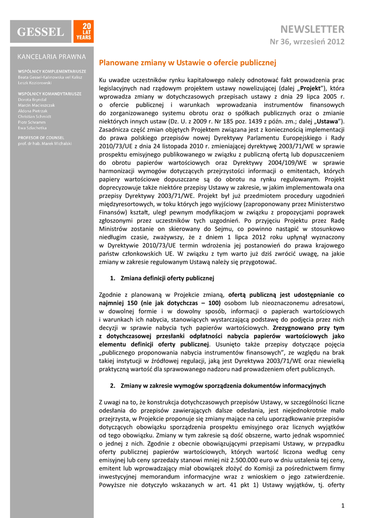 NEWSLETTER Nr 36, wrzesień 2012 Planowane zmiany w Ustawie o ofercie publicznej Ku uwadze uczestników rynku kapitałowego należy odnotować fakt prowadzenia prac legislacyjnych nad rządowym projektem ustawy nowelizującej (dalej „Projekt”), która wprowadza zmiany w dotychczasowych przepisach ustawy z dnia 29 lipca 2005 r. o ofercie publicznej i warunkach wprowadzania instrumentów finansowych do zorganizowanego systemu obrotu oraz o spółkach publicznych oraz o zmianie niektórych innych ustaw (Dz. U. z 2009 r. Nr 185 poz. 1439 z późn. zm.; dalej „Ustawa”). Zasadnicza część zmian objętych Projektem związana jest z koniecznością implementacji do prawa polskiego przepisów nowej Dyrektywy Parlamentu Europejskiego i Rady 2010/73/UE z dnia 24 listopada 2010 r. zmieniającej dyrektywę 2003/71/WE w sprawie prospektu emisyjnego publikowanego w związku z publiczną ofertą lub dopuszczeniem do obrotu papierów wartościowych oraz Dyrektywy 2004/109/WE w sprawie harmonizacji wymogów dotyczących przejrzystości informacji o emitentach, których papiery wartościowe dopuszczane są do obrotu na rynku regulowanym. Projekt doprecyzowuje także niektóre przepisy Ustawy w zakresie, w jakim implementowała ona przepisy Dyrektywy 2003/71/WE. Projekt był już przedmiotem procedury uzgodnień międzyresortowych, w toku których jego wyjściowy (zaproponowany przez Ministerstwo Finansów) kształt, uległ pewnym modyfikacjom w związku z propozycjami poprawek zgłoszonymi przez uczestników tych uzgodnień. Po przyjęciu Projektu przez Radę Ministrów zostanie on skierowany do Sejmu, co powinno nastąpić w stosunkowo niedługim czasie, zważywszy, że z dniem 1 lipca 2012 roku upłynął wyznaczony w Dyrektywie 2010/73/UE termin wdrożenia jej postanowień do prawa krajowego państw członkowskich UE. W związku z tym warto już dziś zwrócić uwagę, na jakie zmiany w zakresie regulowanym Ustawą należy się przygotować. 1. Zmiana definicji oferty publicznej Zgodnie z planowaną w Projekcie zmianą, ofertą publiczną jest udostępnianie co najmniej 150 (nie jak dotychczas – 100) osobom lub nieoznaczonemu adresatowi, w dowolnej formie i w dowolny sposób, informacji o papierach wartościowych i warunkach ich nabycia, stanowiących wystarczającą podstawę do podjęcia przez nich decyzji w sprawie nabycia tych papierów wartościowych. Zrezygnowano przy tym z dotychczasowej przesłanki odpłatności nabycia papierów wartościowych jako elementu definicji oferty publicznej. Usunięto także przepisy dotyczące pojęcia „publicznego proponowania nabycia instrumentów finansowych”, ze względu na brak takiej instytucji w źródłowej regulacji, jaką jest Dyrektywa 2003/71/WE oraz niewielką praktyczną wartość dla sprawowanego nadzoru nad prowadzeniem ofert publicznych. 2. Zmiany w zakresie wymogów sporządzenia dokumentów informacyjnych Z uwagi na to, że konstrukcja dotychczasowych przepisów Ustawy, w szczególności liczne odesłania do przepisów zawierających dalsze odesłania, jest niejednokrotnie mało przejrzysta, w Projekcie proponuje się zmiany mające na celu uporządkowanie przepisów dotyczących obowiązku sporządzenia prospektu emisyjnego oraz licznych wyjątków od tego obowiązku. Zmiany w tym zakresie są dość obszerne, warto jednak wspomnieć o jednej z nich. Zgodnie z obecnie obowiązującymi przepisami Ustawy, w przypadku oferty publicznej papierów wartościowych, których wartość liczona według ceny emisyjnej lub ceny sprzedaży stanowi mniej niż 2.500.000 euro w dniu ustalenia tej ceny, emitent lub wprowadzający miał obowiązek złożyć do Komisji za pośrednictwem firmy inwestycyjnej memorandum informacyjne wraz z wnioskiem o jego zatwierdzenie. Powyższe nie dotyczyło wskazanych w art. 41 pkt 1) Ustawy wyjątków, tj. oferty 1 NEWSLETTER Nr 36, wrzesień 2012 publicznej obejmującej proponowanie: a) nabycia papierów wartościowych w postępowaniu likwidacyjnym, b) nabycia przez Skarb Państwa akcji w procesie prywatyzacji, c) nabycia dotychczasowym akcjonariuszom akcji w wykonaniu prawa poboru, d) nabycia przez spółkę własnych akcji w trybie określonym w Kodeksie spółek handlowych. W Projekcie proponuje się, aby – w przypadku oferty publicznej, w wyniku której zakładane wpływy brutto emitenta lub sprzedającego na terytorium UE, liczone wg ich ceny emisyjnej lub ceny sprzedaży z dnia jej ustalenia stanowią mniej niż 2.500.000 euro – wprowadzić obowiązek udostępnienia memorandum informacyjnego niepodlegającego zatwierdzeniu przez KNF. Jednocześnie, wszystkie przypadki ofert publicznych spełniające to kryterium zostały ze sobą zrównane poprzez rezygnację z wyjątków od obowiązku sporządzenia memorandum informacyjnego, o których mowa w obecnie obowiązującym art. 41 pkt 1) Ustawy. Zmiana ta w szczególności ma znaczenie dla emisji akcji z prawem poboru. 3. Ograniczenie możliwości wykorzystywania konstrukcji papierów wartościowych inkorporujących prawo do nabycia lub objęcia akcji do faktycznego publicznego oferowania tych akcji z pominięciem wymogu prospektowego. W uzasadnieniu do wprowadzenia przedmiotowej zmiany Projekt wskazuje na istniejącą praktykę wykorzystywania konstrukcji papierów wartościowych inkorporujących prawo do nabycia lub objęcia akcji (np. warrantów subskrypcyjnych, obligacji z prawem pierwszeństwa i obligacji zamiennych) do faktycznego publicznego oferowania tych akcji z pominięciem wymogu prospektowego (gdy np. realizacja inkorporowanego w tych papierach uprawnienia następuje w bardzo krótkim czasie po ich przydzieleniu inwestorom). W związku z powyższym proponuje się wprowadzić doprecyzowanie przepisów Ustawy tak, by wyeliminować sztuczne konstruowanie oferty akcji poprzez ofertę tego rodzaju papierów wartościowych. Zmiany planowane w Projekcie mają w spójny sposób: (i) wyłączyć obowiązek prospektowy dla akcji w sytuacji, gdy stanowią 
