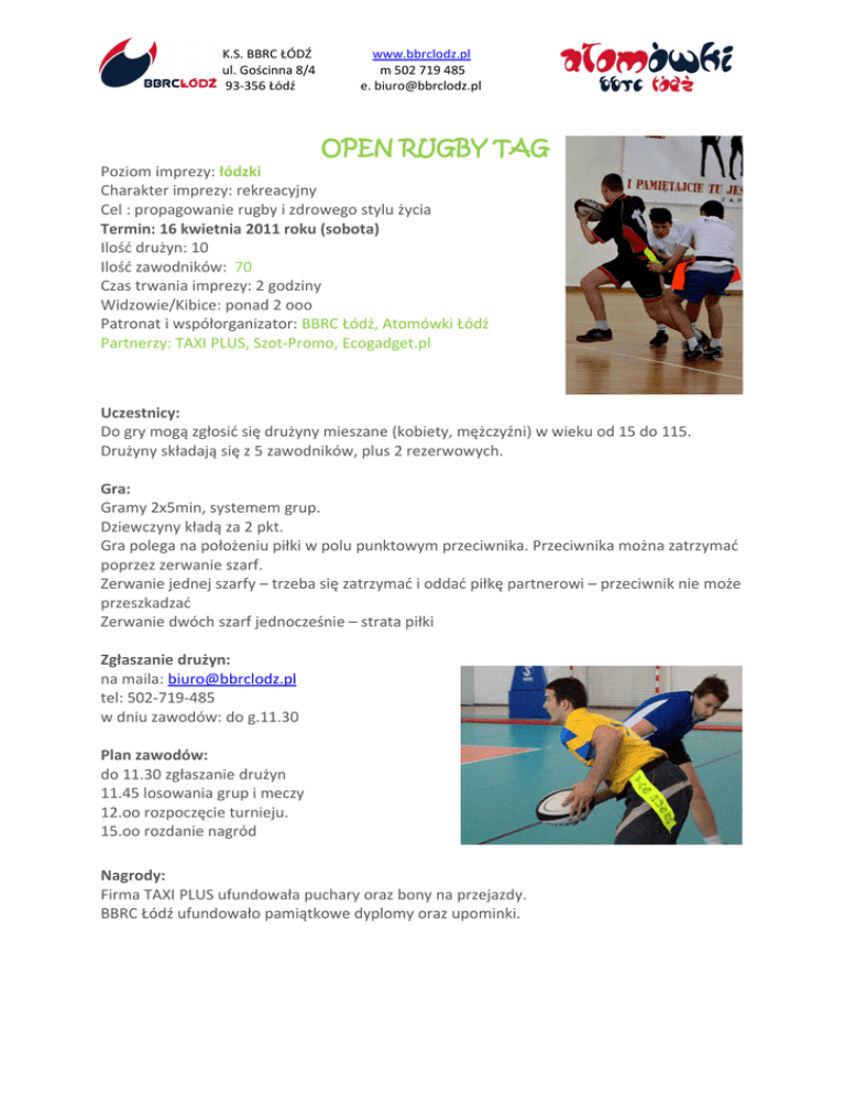 K.S. BBRC ŁÓDŹ ul. Gościnna 8/4 93-356 Łódź www.bbrclodz.pl m 502 719 485 e. [email protected] OPEN RUGBY TAG Poziom imprezy: łódzki Charakter imprezy: rekreacyjny Cel : propagowanie rugby i zdrowego stylu życia Termin: 16 kwietnia 2011 roku (sobota) Ilość drużyn: 10 Ilość zawodników: 70 Czas trwania imprezy: 2 godziny Widzowie/Kibice: ponad 2 ooo Patronat i współorganizator: BBRC Łódź, Atomówki Łódź Partnerzy: TAXI PLUS, Szot-Promo, Ecogadget.pl Uczestnicy: Do gry mogą zgłosić się drużyny mieszane (kobiety, mężczyźni) w wieku od 15 do 115. Drużyny składają się z 5 zawodników, plus 2 rezerwowych. Gra: Gramy 2x5min, systemem grup. Dziewczyny kładą za 2 pkt. Gra polega na położeniu piłki w polu punktowym przeciwnika. Przeciwnika można zatrzymać poprzez zerwanie szarf. Zerwanie jednej szarfy – trzeba się zatrzymać i oddać piłkę partnerowi – przeciwnik nie może przeszkadzać Zerwanie dwóch szarf jednocześnie – strata piłki Zgłaszanie drużyn: na maila: [email protected] tel: 502-719-485 w dniu zawodów: do g.11.30 Plan zawodów: do 11.30 zgłaszanie drużyn 11.45 losowania grup i meczy 12.oo rozpoczęcie turnieju. 15.oo rozdanie nagród Nagrody: Firma TAXI PLUS ufundowała puchary oraz bony na przejazdy. BBRC Łódź ufundowało pamiątkowe dyplomy oraz upominki.