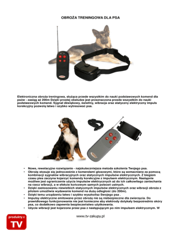 OBROŻA TRENINGOWA DLA PSA Elektroniczna obroża treningowa, służąca przede wszystkim do nauki podstawowych komend dla psów - zasięg aż 200m Dzięki prostej obsłudze jest przeznaczona przede wszystkim do nauki podstawowych komend. Sygnał dźwiękowy, świetlny, wibracja oraz statyczny elektryczny impuls korekcyjny pozwolą łatwo i szybko wytresować psa. . • • • • • • Nowe, rewelacyjne rozwiązanie - najskuteczniejsza metoda szkolenia Twojego psa. Obrożę stosuje się jednocześnie z komendami głosowymi, które są wzmacniane za pomocą kombinacji sygnałów wibracyjnych oraz statycznych impulsów elektrycznych. Z biegiem czasu pies zaczyna kojarzyć komendy korekcyjne z impulsem elektrycznym. Następnie możliwe jest ograniczenie użycia impulsów elektrycznych aż do ich całkowitego zaniechania na rzecz wibracji, a w efekcie końcowym samych poleceń ustnych. Dzięki zastosowaniu niewielkich statycznych impulsów elektrycznych oraz wibracji obroża z pilotem umożliwia wydawanie komend na dużą odległość (do 200m). Dzięki temu urządzeniu łatwo i szybko wyszkolisz Swojego psa . Impulsy elektryczne emitowane przez obrożę nie są niebezpieczne dla zwierzęcia. Do prawidłowego funkcjonowania nie jest konieczne aby elektrody dotykały bezpośrednio skóry psa, co dodatkowo zapewnia bezpieczeństwo użytkowania. Użycie wibracji jest kojarzone przez psa z następującym po nim impulsem elektrycznym. W www.tv-zakupy.pl • • • krótkim czasie nauczy się identyfikować sygnały i wykonywać polecenia tresera. Wibracja i impuls elektryczny posiadają funkcje autostop w celu zapobieżenia ciągłemu drażnieniu psa. Regulowany obwód obroży: 20-50 cm pozwala na dokładne dopasowanie jej do obwodu szyi. Produkt posiada certyfikat CE. Dostrajanie odbiornika i pilota. 1. Włącz urządzenie przyciskiem ON/OFF znajdującym się z boku pilota. 2. Włóż baterie do odbiornika. Następnie od razu wciśnij przycisk wibracji lub przycisk impulsu elektrycznego na pilocie. Wówczas odbiornik zawibruje dwukrotnie jako oznaka dostrojenia pilota z odbiornikiem i poprawnego funkcjonowania całego urządzenia. 3. Jeśli po włożeniu baterii odbiornik zaczyna wibrować samoczynnie bez naciśnięcia jakiegokolwiek przycisku, należy wyjąć baterie, odczekać przynajmniej 10 sekund i wrócić do kroków z pkt 2. 4. Upewnij się że klapka zakrywająca baterie odbiornika jest dobrze założona. Dociśnij dokładnie wszystkie jej rogi. 5. Umocuj odbiornik na pasku obroży. DANE TECHNICZNE NADAJNIK • • • • • Wymiary: 120 x 25 x 45 mm Zasilanie: bateria 9V Wysuwana antena - zasięg do 200m Funkcje: sygnalizacja świetlna, dźwiękowa, wibracja i impuls elektryczny Podświetlenie nocne OBROŻA • Wymiary: regulowana długość 20 - 50 cm, odbiornik 43 x 68 x 38 mm • Zasilanie: 2x 1,5V baterie AAA W ZESTAWIE • • • • Obroża Nadajnik Baterie Testowa dioda i zapasowe zatyczki na elektrod www.tv-zakupy.pl Informacje dotyczące utylizacji i recyklingu: Po upływie okresu żywotności urządzenia, lub kiedy naprawa przestaje być opłacalna, urządzenia nie należy wyrzucać do śmieci. W celu właściwej likwidacji urządzenia należy oddać je w odpowiednich punktach zbioru, gdzie zostaną przyjęte bez pobierania opłaty. Przestrzegając zasad prawidłowej utylizacji pomagacie Państwo zachować cenne zasoby przyrody i zapobiegacie potencjalnym negatywnym wpływom na środowisko naturalne i ludzkie zdrowie. Dalsze szczegóły dotyczące utylizacji prosimy uzyskać w miejscowym urzędzie lub w najbliższym punkcie zbioru. Likwidacja niezgodna z przepisami może zostać ukarana grzywną zgodnie z obowiązującymi przepisami. Baterii nie wyrzucać do kosza na śmieci, ale oddać w punkcie gwarantującym ich recykling. Serwisowanie W przypadku stwierdzenia po zakupieniu urządzenia jakiś wad lub uszkodzeń należy skontaktować się z autoryzowanym punktem serwisowym. Obsługując urządzenie należy przestrzegać instrukcji obsługi. Gwarancja traci ważność w przypadku niewłaściwego lub niezgodnego z instrukcją użytkowania urządzenia lub w przypadku samowolnych przeróbek i zmian konstrukcyjnych. Produkt posiada protokół bezpieczeństwa Dystrybucja: SERVICE TEAM Tłumaczenie na zlecenie SERVICE TEAM SERVICE TEAM Pl. Pokoju 3, 84-300 Lębork TV ZAKUPY www.tv-zakupy.pl www.tv-zakupy.pl KATRA GWARANCYJNA Wystawca: Data: ………………………………………………………………………………………………. Naprawa: ……………………………………………………………………………………………………… ……………………………………………………………………………………………………… ……………………………………………………………………………………………………… ……………………………………………………………………………………………………… ……………………………………………………………………………………………………… ……………………………………………………………………………………………………… ……………………………………………………………………………………………………… ……………………………………………………………………………………………………… ……………………………………………………………………………………………………… ……………………………………………………………………………………………………… ……………………………………………………………………………………………………… ……………………………………………………………………………………………………… ………………………