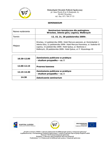 Dolnośląski Ośrodek Polityki Społecznej pl. Jana Pawła II nr 8 (budynek A) 50-043 Wrocław tel. /fax. 071 784 57 53 __________________________________________________________________________________ SEMINARIUM Nazwa wydarzenia Termin Seminarium tematyczne dla podregionu Wrocław, Jelenia góra, Legnica, Wałbrzych 12, 15, 21, 28 października 2009r. Wrocław, 12 października 2009r. Hotel Mercure panoram, pl. Dominikański 1 Jelenia Góra, 21 października 2009r. Hotel Mercure Panorama, ul. Sudecka 63 Legnica, 15 października 2009r. Hotel Qubus, ul. Skarbowa 2 Wałbrzych, 28 października 2009r. Hotel Qubus, ul. P. Wysockiego 45 Miejsce 10.30-12.00 Zamówienia publiczne w praktyce - studium przypadku – cz. I 12.00-12.15 Przerwa kawowa 12.15-14.30 Zamówienia publiczne w praktyce - studium przypadku – cz. I 14.30 Zakończenie seminarium „Projekt systemowy DOPS w zakresie podnoszenia kwalifikacji kadr pomocy i integracji społecznej” współfinansowany z Europejskiego Funduszu Społecznego w ramach Programu Operacyjnego Kapitał Ludzki Priorytet VII Promocja integracji społecznej Działanie 7.1 Rozwój i upowszechnienie aktywnej integracji Poddziałanie 7.1.3 Podnoszenie kwalifikacji kadr pomocy i integracji społecznej