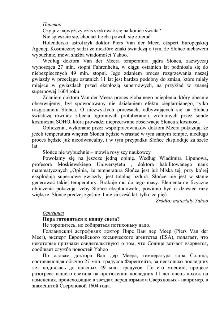 Перевод Czy już najwyższy czas szykować się na koniec świata? Nie spieszcie się, chociaż trzeba powoli się zbierać. Holenderski astrofizyk doktor Piers Van der Meer, ekspert Europejskiej Agencji Kosmicznej sądzi że niektóre znaki świadczą o tym, że Słońce niebawem wybuchnie, mówi służba wiadomości Yahoo. Według doktora Van der Meera temperatura jądra Słońca, zazwyczaj wynosząca 27 mln. stopni Fahrenheita, w ciągu ostatnich lat podniosła się do niebezpiecznych 49 mln. stopni. Jego zdaniem proces rozgrzewania naszej gwiazdy w przeciągu ostatnich 11 lat jest bardzo podobny do zmian, które miały miejsce w gwiazdach przed eksplozją supernowych, na przykład w znanej supernowej 1604 roku. Zdaniem doktora Van der Meera proces globalnego ocieplenia, który obecnie obserwujemy, był spowodowany nie działaniem efektu cieplarnianego, tylko rozgrzaniem Słońca. O niezwykłych procesach, odbywających się na Słońcu świadczą również zdjęcia ogromnych protuberancji, zrobionych przez sondę kosmiczną SOHO, która prowadzi nieprzerwane obserwacje Słońca z kosmosu. Obliczenia, wykonane przez współpracowników doktora Meera pokazują, że jeżeli temperatura wnętrza Słońca będzie wzrastać w tym samym tempie, niedługo proces będzie już nieodwracalny, i w tym przypadku Słońce eksploduje za sześć lat. Słońce nie wybuchnie – mówią rosyjscy naukowcy Powołamy się na jeszcze jedną opinię. Według Wladimira Lipunowa, profesora Moskiewskiego Uniwersytetu , doktora habilitowanego nauk matematycznych „Opinia, że temperatura Słońca jest już bliska tej, przy której eksplodują supernowe gwiazdy, jest totalną bzdurą. Słońce nie jest w stanie generować takiej temperatury. Brakuje mu do tego masy. Elementarne fizyczne obliczenia pokazują: żeby Słońce eksplodowało, powinno być o dziesięć razy większe. Słońce prędzej zgaśnie. I nie za sześć lat, tylko za pięć. Źródło: materiały Yahoo Оригинал Пора готовиться к концу света? Не торопитесь, но собираться потихоньку надо. Голландский астрофизик доктор Пирс Ван дер Меер (Piers Van der Meer), эксперт Европейского космического агентства (ESA), полагает, что некоторые признаки свидетельствуют о том, что Солнце вот-вот взорвется, сообщает служба новостей Yahoo По словам доктора Ван дер Меера, температура ядра Солнца, составляющая обычно 27 млн. градусов Фаренгейта, за несколько последних лет поднялась до опасных 49 млн. градусов. По его мнению, процесс разогрева нашего светила на протяжении последних 11 лет очень похож на изменения, происходящие в звездах перед взрывом Сверхновых - например, в знаменитой Сверхновой 1604 года. По его мнению, процесс глобального потепления, который мы наблюдаем в настоящее время, связан не с действием парникового эффекта, а как раз с разогревом Солнца. О необычных процессах, происходящих на Солнце, свидетельствуют и снимки гигантских протуберанцев, полученных солнечной и гелиосферной обсерваторией НАСА SOHO, ведущей непрерывные наблюдения за светилом из космоса. Вычисления, проведенные сотрудниками доктора Меера, показывают, что если температура солнечных недр будет расти теми же темпами, скоро процесс станет необратимым, и в этом случае Солнце взорвется уже лет через шесть. Солнце не взорвется отвечают российские ученые Сошлемся еще на одно авторитетное мнение. Вот что говорит Владимир Липунов, профессор МГУ, доктор физико-математических наук: "Утверждение, что температура Солнца уже близка к той, когда взрываются сверхновые звезды, - полная ерунда. Солнце не может генерировать такую температуру. Для этого ему не хватает массы. Элементарные физические расчеты: чтобы Солнце взорвалось, оно должно быть в десять раз больше. Оно скорее потухнет. И не через шесть лет, а через пять. Источник: по материалам Yahoo.