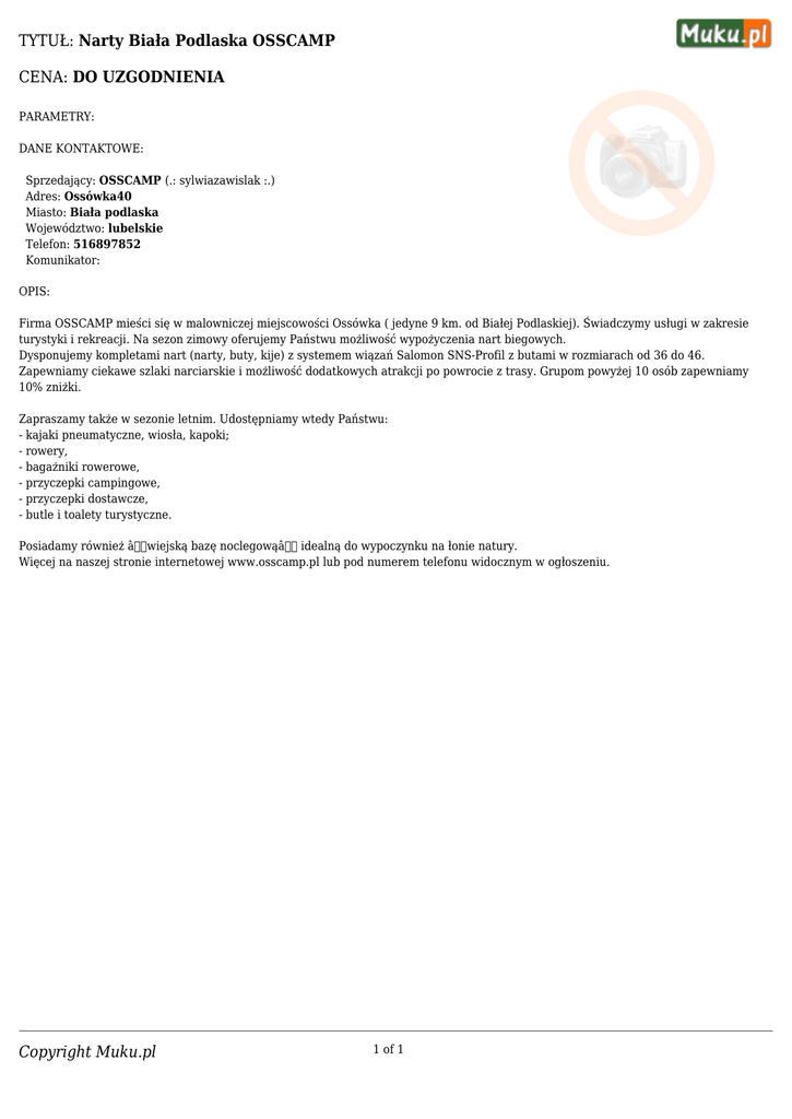 TYTUŁ: Narty Biała Podlaska OSSCAMP CENA: DO UZGODNIENIA PARAMETRY: DANE KONTAKTOWE: Sprzedający: OSSCAMP (.: sylwiazawislak :.) Adres: Ossówka40 Miasto: Biała podlaska Województwo: lubelskie Telefon: 516897852 Komunikator: OPIS: Firma OSSCAMP mieści się w malowniczej miejscowości Ossówka ( jedyne 9 km. od Białej Podlaskiej). Świadczymy usługi w zakresie turystyki i rekreacji. Na sezon zimowy oferujemy Państwu możliwość wypożyczenia nart biegowych. Dysponujemy kompletami nart (narty, buty, kije) z systemem wiązań Salomon SNS-Profil z butami w rozmiarach od 36 do 46. Zapewniamy ciekawe szlaki narciarskie i możliwość dodatkowych atrakcji po powrocie z trasy. Grupom powyżej 10 osób zapewniamy 10% zniżki. Zapraszamy także w sezonie letnim. Udostępniamy wtedy Państwu: - kajaki pneumatyczne, wiosła, kapoki; - rowery, - bagażniki rowerowe, - przyczepki campingowe, - przyczepki dostawcze, - butle i toalety turystyczne. Posiadamy również âwiejską bazę noclegowąâ idealną do wypoczynku na łonie natury. Więcej na naszej stronie internetowej www.osscamp.pl lub pod numerem telefonu widocznym w ogłoszeniu. Copyright Muku.pl 1 of 1