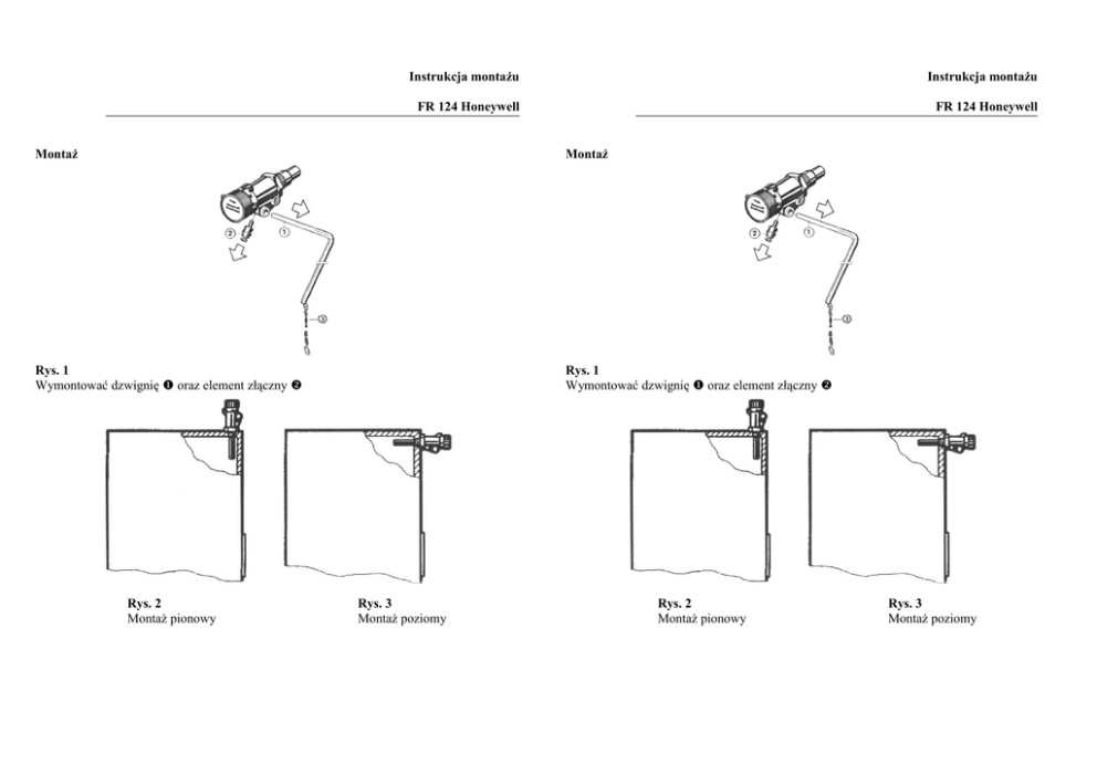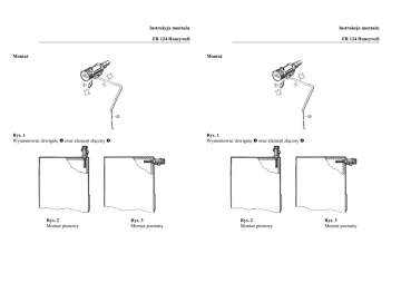 Instrukcja montażu Instrukcja montażu FR 124 Honeywell FR 124 Honeywell Montaż Montaż Rys. 1 Wymontować dzwignię oraz element złączny Rys. 1 Wymontować dzwignię oraz element złączny Rys. 2 Montaż pionowy Rys. 3 Montaż poziomy Rys. 2 Montaż pionowy Rys. 3 Montaż poziomy Zamontować regulator w płaszcz kotła poziomo lub pionowo Rys. 4 Zamontować regulator w płaszcz kotła poziomo lub pionowo Rys. 5 Rys. 4 Rys. 5 Zamontować dzwignię w odwrotnej kolejności jak pokazano na rys. 1, odkręcić element złączny oraz przymocować łańcuszek zgodnie z rysunkiem 6. Zamontować dzidzię w odwrotnej kolejności jak pokazano na rys. 1, odkręcić element złączny oraz przymocować łańcuszek zgodnie z rysunkiem 6. Ustawienie Ustawienie Podgrzać kocioł do temperatury 600C. Ustawić pokrętło regulatora do temperatury wskazanej na termometrze kotłowym. W przypadku montażu poziomego (rys. 2) obowiązuje skala i znacznik na obudowie regulatora W przypadku montażu poziomego obowiązuje czarna skala i znacznik na obudowie regulatora Podgrzać kocioł do temperatury 600C. Ustawić pokrętło regulatora do temperatury wskazanej na termometrze kotłowym. W przypadku montażu poziomego (rys. 2) obowiązuje skala i znacznik na obudowie regulatora W przypadku montażu poziomego obowiązuje czarna skala i znacznik na obudowie regulatora Dostawca Rys. 6 Przymocować łańcuszek do pokrywy paleniska tak, aby pozostawić przelot ok. 2 mm (grubość zapałki) Rys. 6 Przymocować łańcuszek do pokrywy paleniska tak, aby pozostawić przelot ok. 2 mm (grubość zapałki) Sprawdzenie działania regulatora ciągu Ustawić pokrętłem temperaturę wskazaną na termometrze kotłowym. Jeśli regulator został prawidłowo zamontowany pokrywa paleniska odchyli się jak pokazano na rysunku 6. Sprawdzenie działania regulatora ciągu Ustawić pokrętłem temperaturę wskazaną na termometrze kotłowym. Jeśli regulator został prawidłowo zamontowany pokrywa paleniska odchyli się jak pokazano na rysunku 6. Producent Dostawca Producent