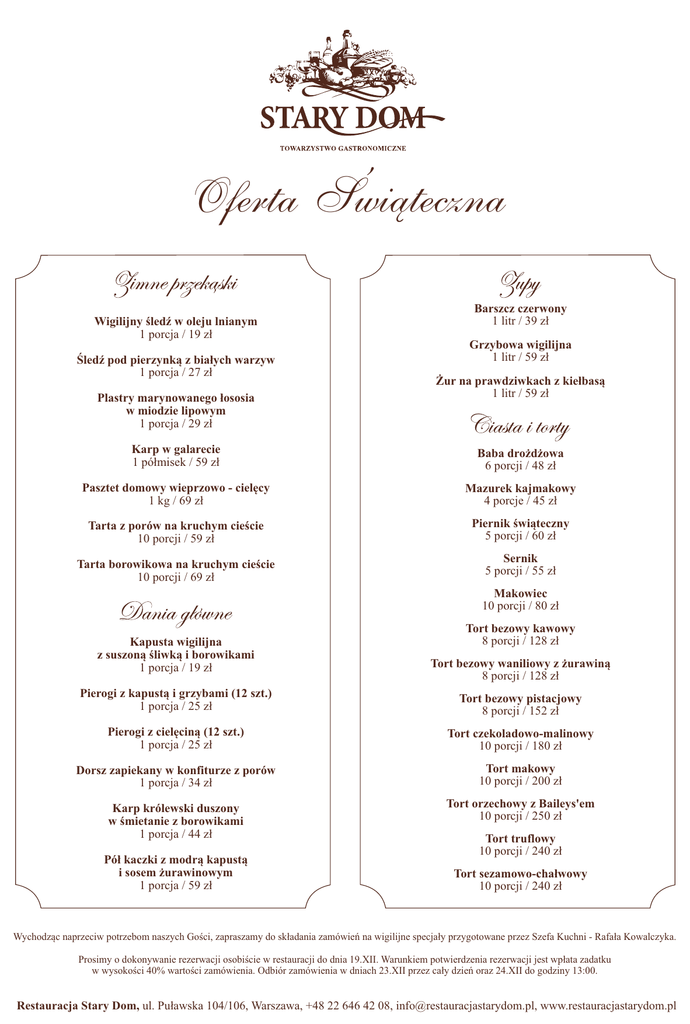 Oferta ¦wi±teczna Wigilijny śledź w oleju lnianym 1 porcja / 19 zł Śledź pod pierzynką z białych warzyw 1 porcja / 27 zł Plastry marynowanego łososia w miodzie lipowym 1 porcja / 29 zł Barszcz czerwony 1 litr / 39 zł Grzybowa wigilijna 1 litr / 59 zł Żur na prawdziwkach z kiełbasą 1 litr / 59 zł Karp w galarecie 1 półmisek / 59 zł Baba drożdżowa 6 porcji / 48 zł Pasztet domowy wieprzowo - cielęcy 1 kg / 69 zł Mazurek kajmakowy 4 porcje / 45 zł Tarta z porów na kruchym cieście 10 porcji / 59 zł Piernik świąteczny 5 porcji / 60 zł Tarta borowikowa na kruchym cieście 10 porcji / 69 zł Sernik 5 porcji / 55 zł Makowiec 10 porcji / 80 zł Kapusta wigilijna z suszoną śliwką i borowikami 1 porcja / 19 zł Tort bezowy kawowy 8 porcji / 128 zł Tort bezowy waniliowy z żurawiną 8 porcji / 128 zł Pierogi z kapustą i grzybami (12 szt.) 1 porcja / 25 zł Tort bezowy pistacjowy 8 porcji / 152 zł Pierogi z cielęciną (12 szt.) 1 porcja / 25 zł Tort czekoladowo-malinowy 10 porcji / 180 zł Dorsz zapiekany w konfiturze z porów 1 porcja / 34 zł Tort makowy 10 porcji / 200 zł Karp królewski duszony w śmietanie z borowikami 1 porcja / 44 zł Tort orzechowy z Baileys'em 10 porcji / 250 zł Pół kaczki z modrą kapustą i sosem żurawinowym 1 porcja / 59 zł Tort truflowy 10 porcji / 240 zł Tort sezamowo-chałwowy 10 porcji / 240 zł Wychodząc naprzeciw potrzebom naszych Gości, zapraszamy do składania zamówień na wigilijne specjały przygotowane przez Szefa Kuchni - Rafała Kowalczyka. Prosimy o dokonywanie rezerwacji osobiście w restauracji do dnia 19.XII. Warunkiem potwierdzenia rezerwacji jest wpłata zadatku w wysokości 40% wartości zamówienia. Odbiór zamówienia w dniach 23.XII przez cały dzień oraz 24.XII do godziny 13:00. Restauracja Stary Dom, ul. Puławska 104/106, Warszawa, +48 22 646 42 08, [email protected], www.restauracjastarydom.pl