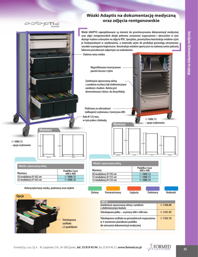Wózki Adaptis na dokumentację medyczną oraz zdjęcia rentgenowskie Wózki ADAPTIS zaprojektowane są również do przechowywania dokumentacji medycznej oraz zdjęć rentgenowskich dzięki pełnemu zestawowi wyposażenia i akcesoriów w tym dużego wyboru uchwytów na zdjęcia RTG. Specjalna, przemyślana konstrukcja wózków czyni je funkcjonalnymi w użytkowaniu, a materiały użyte do produkcji pozwalają utrzymywać wysokie wymagania higieniczne. Konstrukcja wózków oparta jest na stalowej ramie pokrytej lakierem proszkowym odpornym na uszkodzenia. Stalowa rama wózka Wyprofilowane tworzywowe panele boczne i tylne Wóżki na dokumentację medyczną Economy Zamknięcie opuszczaną roletą z zamkiem na klucz lub elektronicznym zamkiem z kodem. Roleta jest demontowana i łatwa do dezynfekcji. Podstawa ze zderzakami (odbojami) wykonana z tworzywa ABS Koła Ø 125 mm, w tym jedno z blokadą Nr 1000.13 - opcja wykonania Wymiary Wymiary Nr 1000.15 - opcja wykonania Wózek z opuszczaną roletą Wózek z opuszczaną roletą Wymiary 16 modułowy H 162 cm 32 modułowy H 162 cm Pudełka i tace 600 x 400 Nr 1000.15 Nr 1000.16 Wymiary 20 modułowy H 193 cm 15 modułowy H 155 cm 12 modułowy H 132 cm Pudełka i tace 600 x 400 Nr 1000.12 Nr 1000.13 Nr 1000.14 Kolorystyka bazy wózka, podstawy oraz etykiet Zielony Opcje Pomarańczowy Ceglasty Fioletowy OPCJE Zamknięcie opuszczaną roletą z zamkiem z elektronicznym kodem Teleskopowa półka – wymiary 600 x 400 mm Teleskopowa szuflada z 3 pudełkami Teleskopowa szuflada na prowadnicach wyposażona w 3 wymienne plastikowe pudełka do wieszania dokumentacji medycznej Formed Sp. z o.o. Sp. k. Al. Legionów 21A, 34-300 Żywiec, tel. 33 819 45 94, fax 33 819 46 21, www.formed.eu.pl Niebieski Nr 1100.08 Nr 1101.99 Nr 1102.10 43 Opcje Wóżki na dokumentację medyczną Elementy wyposażenia wnętrza wózków Pojemniki z polipropylenu 600 x 400 z zabezpieczeniem wysuwu 1 moduł - H 66 mm 2 moduły - H 142 mm 3 moduły - H 219 mm Nr 1100.27 Nr 1100.28 Nr 1100.29 Szuflady z polipropylenu 600 x 400 z zabezpieczeniem wysuwu 1 moduł - H 72 mm 2 moduły - H 148 mm 3 moduły - H 225 mm Nr 1100.30 Nr 1100.31 Nr 1100.32 Szuflady z uchwytami na dokumenty (dla wózków i szaf z szufladami) Szuflady (4 modułowe) zamocowane na prowadnicy z odpinanym uchwytem Półki A – Półka z ABS 600 x 400 B – Półka wysuwana na teleskopowych prowadnicach Nr 1100.26 Nr 1101.99 Dla folderów poziomych A – 1 duży uchwyt ( ładowność – 30 folderów o grubości 15 mm) B – 2 małe uchwyty (ładowność – 2 x 15 folderów o grubości 15 mm) Nr 1102.07 Nr 1102.18 Dla folderów formatu A4 C – 1 duży uchwyt ( ładowność – 11 segregatorów po 40 mm) D – 2 małe uchwyty (ładowność – 2 x 5 segregatorów po 40 mm) Nr 1102.08 Nr 1102.19 Uchwyt na dokumenty z podziałem i regulacją położenia (18 przegród) A – Dla dokumentacji medycznej 18 przegród – H 36 cm Nr 1102.01 B – Dla dokumentacji RTG 18 przegród – H 48 cm Nr 1102.04 Uchwyt na dokumenty stalowy lakierowany na teleskopowych prowadnicach A – Dla 15 klisz RTG, grubość 20 mm Nr 1101.03 B – Dla 35 klisz RTG, grubość 15 mm Nr 1101.98 Zawieszane foldery z polipropylenu 44 A – zawieszenie poprzeczne – grubość 15 mm B – zawieszenie wzdłużne – grubość 15 mm Nr 398.24 Nr 398.25 A – zawieszenie poziome – grubość 20 mm Nr 398.19 Ramki z uchwytami na dokumenty (dla wózków i szaf z opuszczanymi roletami) Ramki (4 modułowe) zamocowane na prowadnicy z odpinanym uchwytem Dla folderów poziomych A – 1 duży uchwyt ( ładowność – 30 dokumentów o grubości 15 mm) Nr 1102.13 B – 2 małe uchwyty (ładowność – 2 x 15 dokumentów o grubości 15 mm) Nr 1102.15 Dla folderów formatu A4 C – 1 duży uchwyt ( ładowność – 11 segregatorów po 40 mm) D – 2 małe uchwyty (ładowność – 2 x 5 segregatorów po 40 mm) Nr 1102.14 Nr 1102.16 Formed Sp. z o.o. Sp. k. Al. Legionów 21A, 34-300 Żywiec, tel. 33 819 45 94, fax 33 819 46 21, www.formed.eu.pl Opcje Lampa na elastycznym ramieniu Uchwyt na arkusze mocowany do listwy bocznej akcesoryjnej Nr 1100.67 Nr 1101.96 Boczna wysuwana półka do pisania Obrotowa, boczna półka na laptop Nr 1100.38 Wymiary: 40,5 x 35 cm Nr 1100.99 Listwa boczna akcesoryjna o długości 350 mm Dla wózków Dla szaf Nr 1100.33 Nr 1101.18 Wóżki na dokumentację medyczną Akcesoria do wózków Adaptis na dokumentację medyczną Półka ze stali nierdzewnej na laptop z regulacją wysokości Wymiary: 45 x 33cm Nr 1102.21 Listwa zasilająca z 5 gniazdami Nr 1101.50 Listwa zasilająca z gniazdami elektrycznymi z filtrem przeciwzakłóceniowym oraz zabezpieczeniem przeciwprzepięciowym Uchwyt z kodem zabezpieczającym laptop Nr 1100.43 A Nr 338.78 Boczny kosz metalowy, lakierowany, mocowany na listwie bocznej akcesoryjnej. Wymiary: 300 x 100 mm, wysokość: 100 mm Nr 1101.90 Zabezpieczająca półka do wsunięcia laptopa z zamknięciem na klucz Nr 1101.40 Boczny kosz metalowy, lakierowany, mocowany na listwie bocznej akcesoryjnej. Wymiary: 300 x 160 mm, wysokość: 100 mm Nr 1101.91 Zabezpieczająca półka na przegubowym ramieniu z regulacją wysokości (3 osie) dla laptopów 15’’ i 17’’ Boczne pudełko z uchwytem na szynę Nr 1100.73 Nr 1101.59 Pudełko z pokrywką mieszczące 10 skoroszytów Półka na przegubowym ramieniu (3 osie) mocowana z tyłu wózka. dla laptopów 15’’ i 17’’. Nr 1100.75 Boczne pudełko ze stali lakierowanej na dokumenty Z regulacją wysokości Nr 1101.85 Ze stałą wysokością Nr 1101.86 Nr 1101.95 Formed Sp. z o.o. Sp. k. Al. Legionów 21A, 34-300 Żywiec, tel. 33 819 45 94, fax 33 819 46 21, www.formed.eu.pl 45