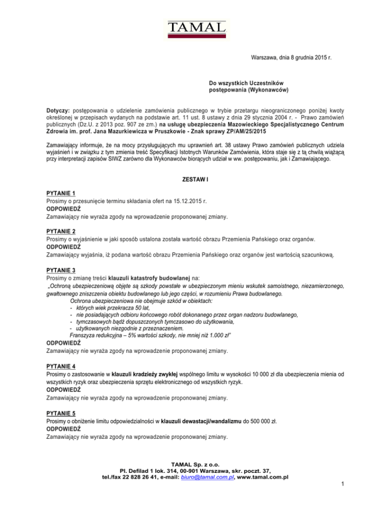Warszawa, dnia 8 grudnia 2015 r. Do wszystkich Uczestników postępowania (Wykonawców) Dotyczy: postępowania o udzielenie zamówienia publicznego w trybie przetargu nieograniczonego poniżej kwoty określonej w przepisach wydanych na podstawie art. 11 ust. 8 ustawy z dnia 29 stycznia 2004 r. - Prawo zamówień publicznych (Dz.U. z 2013 poz. 907 ze zm.) na usługę ubezpieczenia Mazowieckiego Specjalistycznego Centrum Zdrowia im. prof. Jana Mazurkiewicza w Pruszkowie - Znak sprawy ZP/AM/25/2015 Zamawiający informuje, że na mocy przysługujących mu uprawnień art. 38 ustawy Prawo zamówień publicznych udziela wyjaśnień i w związku z tym zmienia treść Specyfikacji Istotnych Warunków Zamówienia, która staje się z tą chwilą wiążącą przy interpretacji zapisów SIWZ zarówno dla Wykonawców biorących udział w ww. postępowaniu, jak i Zamawiającego. ZESTAW I PYTANIE 1 Prosimy o przesunięcie terminu składania ofert na 15.12.2015 r. ODPOWIEDŹ Zamawiający nie wyraża zgody na wprowadzenie proponowanej zmiany. PYTANIE 2 Prosimy o wyjaśnienie w jaki sposób ustalona została wartość obrazu Przemienia Pańskiego oraz organów. ODPOWIEDŹ Zamawiający wyjaśnia, iż podana wartość obrazu Przemienia Pańskiego oraz organów jest wartością szacunkową. PYTANIE 3 Prosimy o zmianę treści klauzuli katastrofy budowlanej na: „Ochroną ubezpieczeniową objęte są szkody powstałe w ubezpieczonym mieniu wskutek samoistnego, niezamierzonego, gwałtownego zniszczenia obiektu budowlanego lub jego części, w rozumieniu Prawa budowlanego. Ochrona ubezpieczeniowa nie obejmuje szkód w obiektach: - których wiek przekracza 50 lat, - nie posiadających odbioru końcowego robót dokonanego przez organ nadzoru budowlanego, - tymczasowych bądź dopuszczonych tymczasowo do użytkowania, - użytkowanych niezgodnie z przeznaczeniem. Franszyza redukcyjna – 5% wartości szkody, nie mniej niż 1.000 zł” ODPOWIEDŹ Zamawiający nie wyraża zgody na wprowadzenie proponowanej zmiany. PYTANIE 4 Prosimy o zastosowanie w klauzuli kradzieży zwykłej wspólnego limitu w wysokości 10 000 zł dla ubezpieczenia mienia od wszystkich ryzyk oraz ubezpieczenia sprzętu elektronicznego od wszystkich ryzyk. ODPOWIEDŹ Zamawiający nie wyraża zgody na wprowadzenie proponowanej zmiany. PYTANIE 5 Prosimy o obniżenie limitu odpowiedzialności w klauzuli dewastacji/wandalizmu do 500 000 zł. ODPOWIEDŹ Zamawiający nie wyraża zgody na wprowadzenie proponowanej zmiany. TAMAL Sp. z o.o. Pl. Defilad 1 lok. 314, 00-901 Warszawa, skr. poczt. 37, tel./fax 22 828 26 41, e-mail: [email protected], www.tamal.com.pl 1 PYTANIE 6 Prosimy o zmianę treści klauzuli powiadomienia o szkodzie na: „W każdym przypadku zaistnienia szkody Ubezpieczony niezwłocznie, nie później niż w ciągu 3 dni od chwili uzyskania wiadomości o szkodzie, ma obowiązek powiadomić Ubezpieczyciela o jej zaistnieniu, podając rodzaj i rozmiar szkody. Natomiast niezwłocznie, nie później jednak niż w ciągu 3 dni roboczych Ubezpieczony ma obowiązek zawiadomić Ubezpieczyciela oraz miejscowe organa policji o każdym wypadku pożaru, a także o każdej szkodzie jaka mogła powstać wskutek przestępstwa. (dotyczy ubezpieczenia: mienia od wszystkich ryzyk, sprzętu elektronicznego od wszystkich ryzyk)” ODPOWIEDŹ Zamawiający nie wyraża zgody na wprowadzenie proponowanej zmiany. PYTANIE 7 Prosimy o wprowadzenie w ubezpieczeniu sprzętu elektronicznego od wszystkich ryzyk dodatkowej klauzuli Urządzeń do jądrowego rezonansu magnetycznego o treści: „Ustala się z zachowaniem pozostałych niezmienionych niniejszą klauzulą postanowień ogólnych warunków ubezpieczenia sprzętu elektronicznego, iż Ubezpieczyciel odpowiada za szkody w urządzeniach do jądrowego rezonansu magnetycznego tylko wówczas, gdy na te urządzenia zawarta została umowa o całkowitej konserwacji. W ramach niniejszej umowy środki chłodzące takie jak: hel, azot itp. są materiałami pomocniczymi w rozumieniu § 5 ust. 3 o.w.u. sprzętu elektronicznego. Koszty ogrzewania i / lub ochładzania kriostatem są tylko wtedy ubezpieczone, kiedy pozostają w bezpośrednim związku z obowiązkiem wypłaty odszkodowania za szkodę w ubezpieczonym sprzęcie. Oblodzenie nie jest uznane jako szkoda w sprzęcie. Dostarczone przez producenta standardowe oprogramowanie lub koszty jego wymiany są tylko wtedy ubezpieczone, kiedy pozostają w bezpośrednim związku z obowiązkiem wypłaty odszkodowania za szkodę w ubezpiec zonym sprzęcie, o ile uwzględniono te koszty podczas ustalania wysokości sumy ubezpieczenia ” ODPOWIEDŹ Zamawiający nie wyraża zgody na wprowadzenie proponowanej zmiany. PYTANIE 8 Ze względu na oczekiwany dwuletni okres ubezpieczenia prosimy o wprowadzen ie klauzuli wypowiedzenia o następującej treści: Klauzula wypowiedzenia umowy ubezpieczenia Z zachowaniem pozostałych, niezmienionych niniejsza klauzulą, postanowień umowy ubezpieczenia strony uzgodniły, iż każda ze stron może wypowiedzieć umowę ubezpieczenia wyłączenie z zachowaniem 2-miesięcznego okresu wypowiedzenia ze skutkiem na koniec pierwszego okresu ubezpieczenia z zastrzeżeniem, że Ubezpieczyciel może tego dokonać wyłącznie z ważnych powodów. Za ważne powody uzasadniające wypowiedzenie umowy przez Ubezpieczyciela uznaje się wyłącznie poniżej określone sytuacje: a. jeżeli Ubezpieczający/ Ubezpieczony wyłudził lub usiłował wyłudzić świadczenie z umowy ubezpieczenia, przy czym wyłudzenie lub usiłowanie wyłudzenia odszkodowania musi być potwierdzone prawomocnym orzeczeniem sądowym, b. jeżeli w związku z zawarciem lub wykonaniem umowy ubezpieczenia Ubezpieczający/ Ubezpieczony usiłował popełnić przestępstwo, przy czym popełnienie lub usiłowanie popełnienia przestępstwa musi być potwierdzone prawomocnym orzeczeniem sądowym, c. jeżeli wskaźnik szkodowości na 2 miesiące przed zakończeniem pierwszego okresu ubezpieczenia (li
