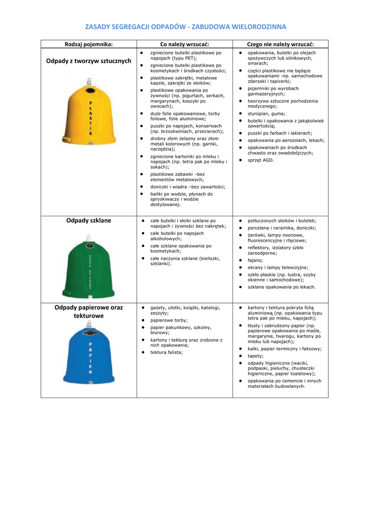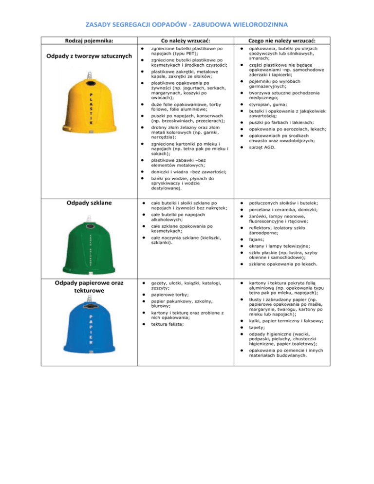 ZASADY SEGREGACJI ODPADÓW - ZABUDOWA WIELORODZINNA Rodzaj pojemnika: Odpady z tworzyw sztucznych Co należy wrzucać: Czego nie należy wrzucać: zgniecione butelki plastikowe po napojach (typu PET); opakowania, butelki po olejach spożywczych lub silnikowych, smarach; zgniecione butelki plastikowe po kosmetykach i środkach czystości; plastikowe zakrętki, metalowe kapsle, zakrętki ze słoików; części plastikowe nie będące opakowaniami -np. samochodowe zderzaki i tapicerki; plastikowe opakowania po żywności (np. jogurtach, serkach, margarynach, koszyki po owocach); pojemniki po wyrobach garmażeryjnych; duże folie opakowaniowe, torby foliowe, folie aluminiowe; styropian, guma; puszki po napojach, konserwach (np. brzoskwiniach, przecierach); drobny złom żelazny oraz złom metali kolorowych (np. garnki, narzędzia); zgniecione kartoniki po mleku i napojach (np. tetra pak po mleku i sokach); tworzywa sztuczne pochodzenia medycznego; butelki i opakowania z jakąkolwiek zawartością; puszki po farbach i lakierach; opakowania po aerozolach, lekach; opakowaniach po środkach chwasto oraz owadobójczych; sprzęt AGD. plastikowe zabawki –bez elementów metalowych; doniczki i wiadra –bez zawartości; bańki po wodzie, płynach do spryskiwaczy i wodzie destylowanej. Odpady szklane całe butelki i słoiki szklane po napojach i żywności bez nakrętek; potłuczonych słoików i butelek; całe butelki po napojach alkoholowych; żarówki, lampy neonowe, fluorescencyjne i rtęciowe; całe szklane opakowania po kosmetykach; reflektory, izolatory szkło żaroodporne; całe naczynia szklane (kieliszki, szklanki). fajans; porcelana i ceramika, doniczki; ekrany i lampy telewizyjne; szkło płaskie (np. lustra, szyby okienne i samochodowe); szklane opakowania po lekach. Odpady papierowe oraz tekturowe gazety, ulotki, książki, katalogi, zeszyty; papierowe torby; papier pakunkowy, szkolny, biurowy; kartony i tekturę oraz zrobione z nich opakowania; tektura falista; kartony i tektura pokryta folią aluminiową (np. opakowania typu tetra pak po mleku, napojach); tłusty i zabrudzony papier (np. papierowe opakowania po maśle, margarynie, twarogu, kartony po mleku lub napojach); kalki, papier termiczny i faksowy; tapety; odpady higieniczne (waciki, podpaski, pieluchy, chusteczki higieniczne, papier toaletowy); opakowania po cemencie i innych materiałach budowlanych.