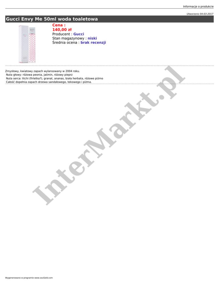 Informacje o produkcie Utworzono 04-03-2017 Gucci Envy Me 50ml woda toaletowa Cena : 140,00 zł In te r M ar kt Zmysłowy, kwiatowy zapach wylansowany w 2004 roku. Nuta głowy: różowa peonia, jaśmin, różowy pieprz Nuta serca: litchi (firletka?), granat, ananas, biała herbata, różowe piżmo Całość dopełnia zapach drzewa sandałowego, tekowego i piżma. .p l Producent : Gucci Stan magazynowy : niski Średnia ocena : brak recenzji Wygenerowano w programie www.oscGold.com
