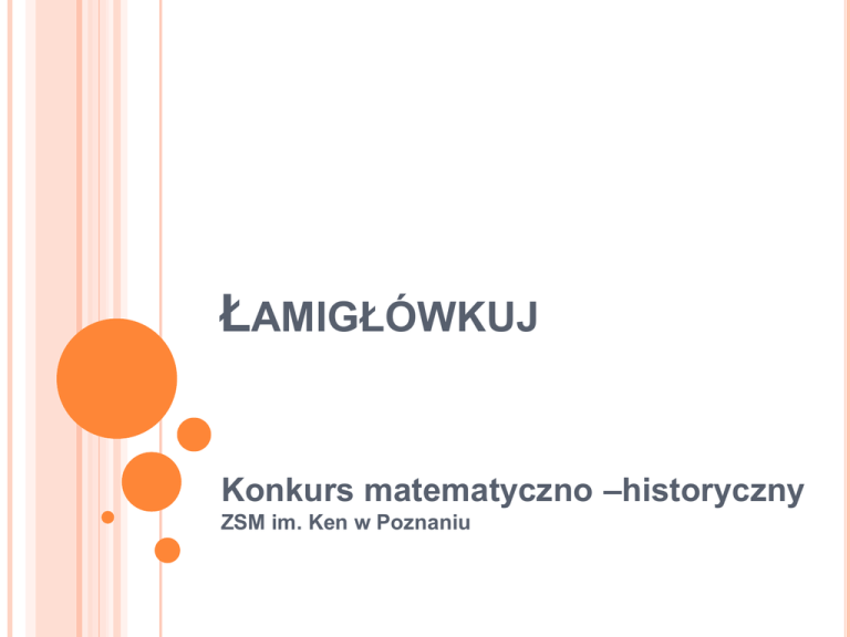 ŁAMIGŁÓWKUJ Konkurs matematyczno –historyczny ZSM im. Ken w Poznaniu ZASADY KONKURSU Część matematyczna: max. 150 p Uczniowie dostaną do rozwiązania 5 łamigłówek o różnym stopniu trudności: I- 10p II - 20p III - 30p IV- 40p V- 50p Część historyczna: 50 p Uczniowie wybiorą jeden z podanych tematów i napiszą krótki esej historyczny lub stworzą prezentację: 50p Słynny matematyk na tle wydarzeń historycznych Nietypowa pasja (zamiłowanie) wybranego matematyka Maksymalna liczba słów/stron: DODATKOWE INFORMACJE: Część matematyczna: Łamigłówki będą miały różny stopień trudności – nie musisz rozwiązywać wszystkich, zrób tyle, ile dasz radę. Najlepszym sposobem na łamigłówki jest próba rozwiązania wieczorem, rozpisania, rano rozwiązanie prawie samo wpada do głowy – miej przy łóżku kartkę i ołówek Część historyczna: Praca powinna być samodzielna - plagiat jest równoznaczny ze skreśleniem ucznia z listy konkursowej. Dopuszczalna jest forma pisemna, multimedialna oraz w każdej innej formie – równie dobrze można zaśpiewać byle ładnie WZÓR KARTY/DEKLARACJI UCZESTNIKA: Imię i nazwisko: ……………………………. Klasa: …………… Niniejszym zgłaszam swoje uczestnictwo w konkursie „Łamigłówkuj” i zobowiązuję się zwrócić zadania konkursowe do dnia …………………. Podpis uczestnika: ……………………………. Prace można zwracać do: Matematyka: Anna Skrzypczak Gniot, Agnieszka Thiem Historia: Marzena Olejniczak Podstawy Przedsiębiorczości: Małgorzata Wower ZADANIE NR 1 (ZA 10 PKT.) Mamy 6 szklanek ustawionych w jednym rzędzie – 3 puste i 3 pełne. Ile najmniej ruchów potrzeba by szklanki puste i pełne ustawić na przemian? Jeden ruch liczy się za każdym razem, gdy podnosimy jedną szklankę. ZADANIE NR 2 (ZA 20 PKT.) Mamy pewną liczbę. Po podzieleniu jej: przez 3 otrzymamy resztę 2, przez 5 – resztę 3, a przez 7 – resztę 2. Jaka to liczba? ZADANIE NR 3 (ZA 30 PKT.) Literom odpowiadają różne cyfry, może być wśród nich zero (uwaga: tym samym literom odpowiadają te same cyfry). Przedstaw oryginalne dodawanie. ZADANIE NR 4 (ZA 40 PKT.) Na wierzchołkach i w miejscach przecięcia linii tworzących poniższą gwiazdę umieszczono 12 okręgów. Jak wpisać w nie liczby od 1 do 12, po jednej w każdy okrąg, aby suma liczb w każdym rzędzie i suma liczb we wszystkich sześciu wierzchołkach była równa? ZADANIE NR 5 (ZA 50 PKT.) Mamy 12 ponumerowanych, jednakowo wyglądających kul, wśród których została ukryta jedna o innej wadze. Nie wiadomo, czy kula jest cięższa, czy lżejsza. Mamy do dyspozycji wagę szalkową oraz trzy ważenia. 1 2 3 4 5 6 7 8 9 10 11 12 Proszę odszukać inną kulę, oraz określić czy jest lżejsza, czy . cięższa