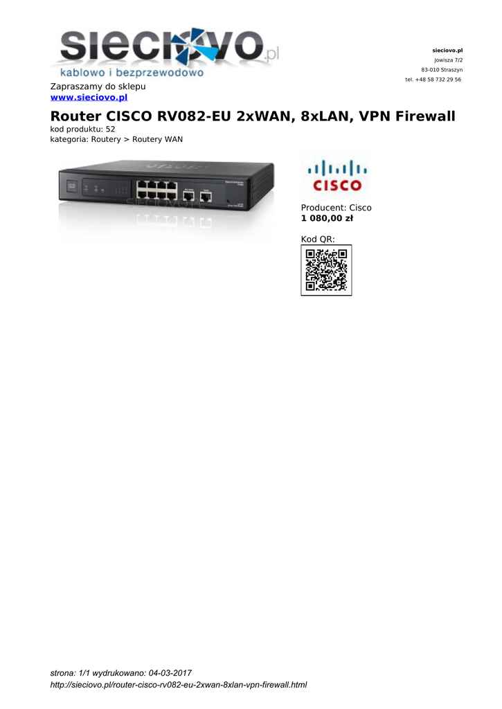 sieciovo.pl Jowisza 7/2 83-010 Straszyn tel. +48 58 732 29 56 Zapraszamy do sklepu www.sieciovo.pl Router CISCO RV082-EU 2xWAN, 8xLAN, VPN Firewall kod produktu: 52 kategoria: Routery > Routery WAN Producent: Cisco 1 080,00 zł Kod QR: strona: 1/1 wydrukowano: 04-03-2017 http://sieciovo.pl/router-cisco-rv082-eu-2xwan-8xlan-vpn-firewall.html