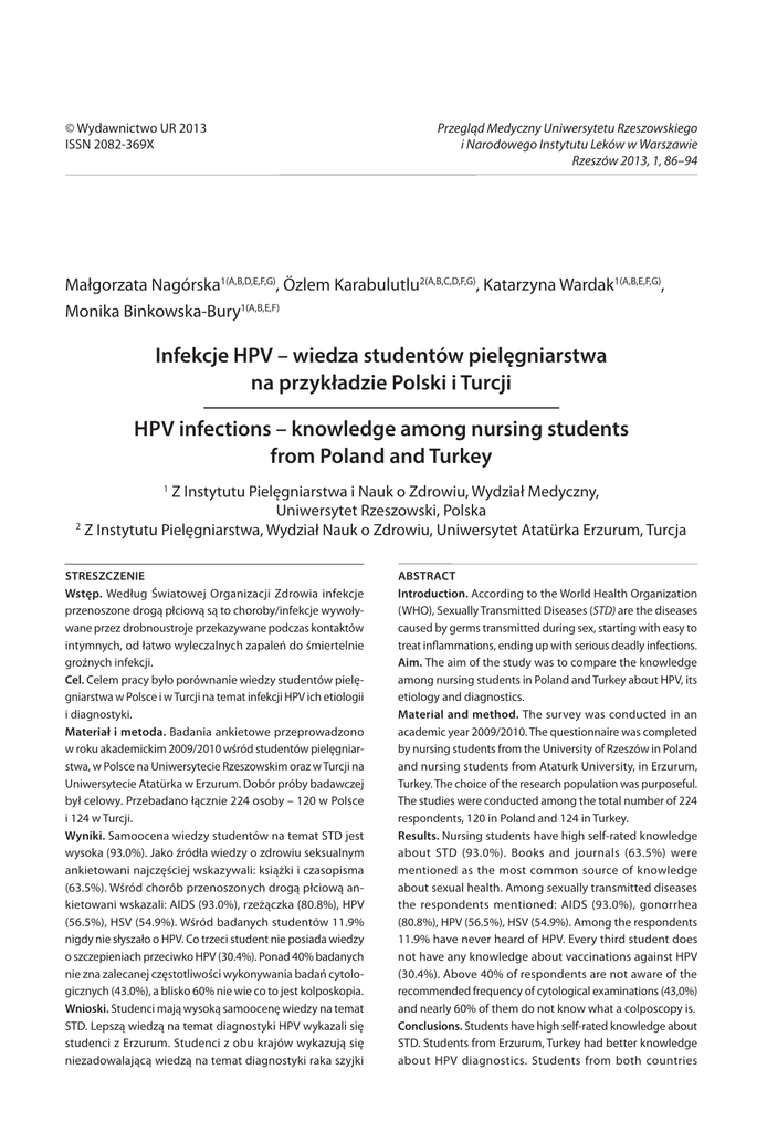 86 Prz. Med. Uniw. Rzesz. Inst. Leków, 2013, 1, 86–94 © Wydawnictwo UR 2013 ISSN 2082-369X Przegląd Medyczny Uniwersytetu Rzeszowskiego i Narodowego Instytutu Leków w Warszawie Rzeszów 2013, 1, 86–94 Małgorzata Nagórska1(A,B,D,E,F,G), Özlem Karabulutlu2(A,B,C,D,F,G), Katarzyna Wardak1(A,B,E,F,G), Monika Binkowska-Bury1(A,B,E,F) Infekcje HPV – wiedza studentów pielęgniarstwa na przykładzie Polski i Turcji Hpv infections – knowledge among nursing students from Poland and Turkey Z Instytutu Pielęgniarstwa i Nauk o Zdrowiu, Wydział Medyczny, Uniwersytet Rzeszowski, Polska 2 Z Instytutu Pielęgniarstwa, Wydział Nauk o Zdrowiu, Uniwersytet Atatürka Erzurum, Turcja 1 Streszczenie Wstęp. Według Światowej Organizacji Zdrowia infekcje przenoszone drogą płciową są to choroby/infekcje wywoływane przez drobnoustroje przekazywane podczas kontaktów intymnych, od łatwo wyleczalnych zapaleń do śmiertelnie groźnych infekcji. Cel. Celem pracy było porównanie wiedzy studentów pielęgniarstwa w Polsce i w Turcji na temat infekcji HPV ich etiologii i diagnostyki. Materiał i metoda. Badania ankietowe przeprowadzono w roku akademickim 2009/2010 wśród studentów pielęgniarstwa, w Polsce na Uniwersytecie Rzeszowskim oraz w Turcji na Uniwersytecie Atatürka w Erzurum. Dobór próby badawczej był celowy. Przebadano łącznie 224 osoby – 120 w Polsce i 124 w Turcji. Wyniki. Samoocena wiedzy studentów na temat STD jest wysoka (93.0%). Jako źródła wiedzy o zdrowiu seksualnym ankietowani najczęściej wskazywali: książki i czasopisma (63.5%). Wśród chorób przenoszonych drogą płciową ankietowani wskazali: AIDS (93.0%), rzeżączka (80.8%), HPV (56.5%), HSV (54.9%). Wśród badanych studentów 11.9% nigdy nie słyszało o HPV. Co trzeci student nie posiada wiedzy o szczepieniach przeciwko HPV (30.4%). Ponad 40% badanych nie zna zalecanej częstotliwości wykonywania badań cytologicznych (43.0%), a blisko 60% nie wie co to jest kolposkopia. Wnioski. Studenci mają wysoką samoocenę wiedzy na temat STD. Lepszą wiedzą na temat diagnostyki HPV wykazali się studenci z Erzurum. Studenci z obu krajów wykazują się niezadowalającą wiedzą na temat diagnostyki raka szyjki Abstract Introduction. According to the World Health Organization (WHO), Sexually Transmitted Diseases (STD) are the diseases caused by germs transmitted during sex, starting with easy to treat inflammations, ending up with serious deadly infections. Aim. The aim of the study was to compare the knowledge among nursing students in Poland and Turkey about HPV, its etiology and diagnostics. Material and method. The survey was conducted in an academic year 2009/2010. The questionnaire was completed by nursing students from the University of Rzeszów in Poland and nursing students from Ataturk University, in Erzurum, Turkey. The choice of the research population was purposeful. The studies were conducted among the total number of 224 respondents, 120 in Poland and 124 in Turkey. Results. Nursing students have high self-rated knowledge about STD (93.0%). Books and journals (63.5%) were mentioned as the most common source of knowledge about sexual health. Among sexually transmitted diseases the respondents mentioned: AIDS (93.0%), gonorrhea (80.8%), HPV (56.5%), HSV (54.9%). Among the respondents 11.9% have never heard of HPV. Every third student does not have any knowledge about vaccinations against HPV (30.4%). Above 40% of respondents are not aware of the recommended frequency of cytological examinations (43,0%) and nearly 60% of them do not know what a colposcopy is. Conclusions. Students have high self-rated knowledge about STD. Students from Erzurum, Turkey had better knowledge about HPV diagnostics. Students from both countries Nagórska, Karabulutlu, Wardak, Binkowska-Bury Infekcje HPV - wiedza studentów pielęgniarstwa na przykładzie Polski i Turcji 87 macicy. Poziom wiedzy studentów pielęgniarstwa jako przyszłych edukatorów zdrowia zarówno w Polsce, jak i w Turcji na temat infekcji HPV nie jest satysfakcjonujący. Niezbędne jest uzupełnienie programów kształcenia pielęgniarek w obu krajach o treści na temat STD. Słowa kluczowe: Sexually Transmitted Diseases, HPV, knowledge, nursing students, Poland, Turkey showed unsatisfactory knowledge about cervical cancer diagnostics. The level of nursing students’ knowledge as future health educators, both in Poland and Turkey about HPV is insufficient, therefore it is necessary to add supplements about STD to nursing education programs in both countries . Key words: STD, HPV, nursing students, Poland, Turkey Wstęp Introduction Choroby przenoszone drogą płciową (ang. STD – Sexual Transmitted Diseases) stanowią duży problem społeczny zwłaszcza w obecnych czasach dużej swobody zachowań seksualnych. Według WHO choroby przenoszone drogą płciową są to choroby wywoływane przez drobnoustroje przekazywane podczas kontaktów intymnych, od łatwo wyleczalnych zapaleń do śmiertelnie groźnych infekcji [1]. Jedną z nich jest HPV - Wirus Brodawczaka Ludzkiego (Human Papilloma Virus), który prowadzi do zmian łagodnych lub złośliwych o charakterze brodawczaków, wykazujących skłonności do nawrotów (kłykciny kończyste, tzw. brodawki płciowe) lub progresji (zmiany przed- i nowotworowe). Zakażenia HPV są bardzo rozpowszechnione wśród populacji na całym świecie, a szczególnie w krajach wysoko rozwiniętych. (Jabłońska, Majewski 2010). Do zakażeń dochodzi najczęściej poprzez kontakty seksualne z zakażonym partnerem, drogą wertykalną – z matki na płód i okołoporodowo. Genitalne typy HPV odpowiadają za zmiany nieonkogenne (kłykciny kończyste, brodawczaki krtani i kłykciny olbrzymie) i onkogenne (rak szyjki macicy, rak okolicy analno-genitalnej, np. rak prącia oraz część raków głowy i szyi) [2, 3]. Sexually transmitted diseases (STD) are a serious social problem, especially in the present times when 