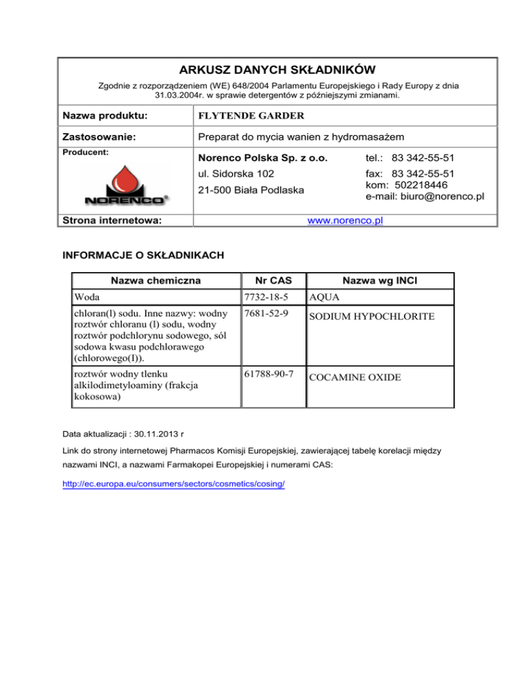 ARKUSZ DANYCH SKŁADNIKÓW Zgodnie z rozporządzeniem (WE) 648/2004 Parlamentu Europejskiego i Rady Europy z dnia 31.03.2004r. w sprawie detergentów z późniejszymi zmianami. Nazwa produktu: FLYTENDE GARDER Zastosowanie: Preparat do mycia wanien z hydromasażem Producent: Norenco Polska Sp. z o.o. tel.: 83 342-55-51 ul. Sidorska 102 fax: 83 342-55-51 kom: 502218446 e-mail: [email protected] 21-500 Biała Podlaska Strona internetowa: www.norenco.pl INFORMACJE O SKŁADNIKACH Nazwa chemiczna Nr CAS Nazwa wg INCI Woda 7732-18-5 AQUA chloran(l) sodu. Inne nazwy: wodny roztwór chloranu (l) sodu, wodny roztwór podchlorynu sodowego, sól sodowa kwasu podchlorawego (chlorowego(I)). 7681-52-9 SODIUM HYPOCHLORITE roztwór wodny tlenku alkilodimetyloaminy (frakcja kokosowa) 61788-90-7 COCAMINE OXIDE Data aktualizacji : 30.11.2013 r Link do strony internetowej Pharmacos Komisji Europejskiej, zawierającej tabelę korelacji między nazwami INCI, a nazwami Farmakopei Europejskiej i numerami CAS: http://ec.europa.eu/consumers/sectors/cosmetics/cosing/
