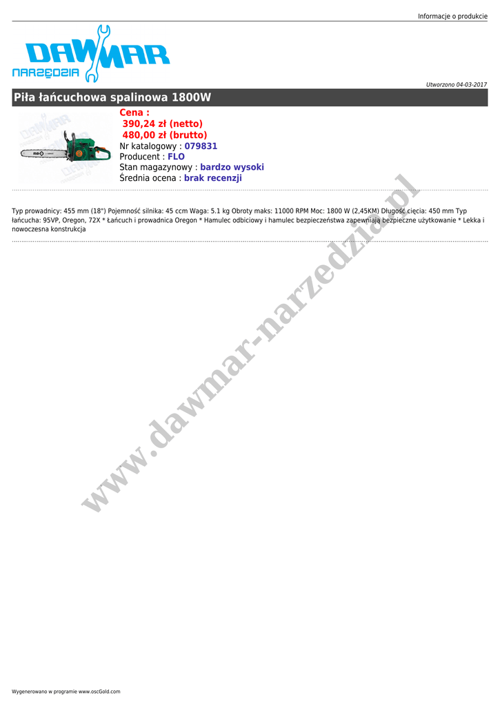 Informacje o produkcie Utworzono 04-03-2017 Piła łańcuchowa spalinowa 1800W Cena : 390,24 zł (netto) 480,00 zł (brutto) zi a. p l Nr katalogowy : 079831 Producent : FLO Stan magazynowy : bardzo wysoki Średnia ocena : brak recenzji w w w .d aw m ar -n ar ze d Typ prowadnicy: 455 mm (18") Pojemność silnika: 45 ccm Waga: 5.1 kg Obroty maks: 11000 RPM Moc: 1800 W (2,45KM) Długość cięcia: 450 mm Typ łańcucha: 95VP, Oregon, 72X * Łańcuch i prowadnica Oregon * Hamulec odbiciowy i hamulec bezpieczeństwa zapewniają bezpieczne użytkowanie * Lekka i nowoczesna konstrukcja Wygenerowano w programie www.oscGold.com