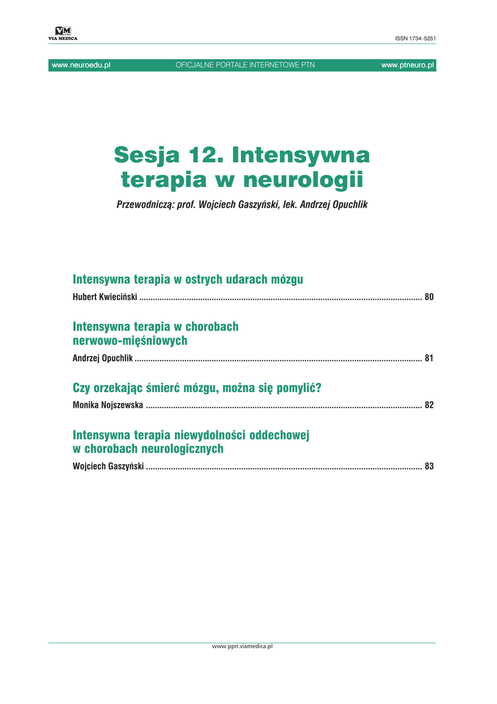 ISSN 1734–5251 www.neuroedu.pl OFICJALNE PORTALE INTERNETOWE PTN www.ptneuro.pl Sesja 12. Intensywna terapia w neurologii Przewodniczą: prof. Wojciech Gaszyński, lek. Andrzej Opuchlik Intensywna terapia w ostrych udarach mózgu Hubert Kwieciński ............................................................................................................................. 80 Intensywna terapia w chorobach nerwowo-mięśniowych Andrzej Opuchlik ............................................................................................................................... 81 Czy orzekając śmierć mózgu, można się pomylić? Monika Nojszewska .......................................................................................................................... 82 Intensywna terapia niewydolności oddechowej w chorobach neurologicznych Wojciech Gaszyński .......................................................................................................................... 83 www.ppn.viamedica.pl 79 Polski Przegląd Neurologiczny, 2010, tom 6, supl. A Tabela 1. Schemat postępowania w ostrym udarze niedokrwiennym Intensywna terapia w ostrych udarach mózgu Hubert Kwieciński Katedra i Klinika Neurologii WUM w Warszawie W Polsce, podobnie jak w innych krajach UE, wczesna śmiertelność szpitalna z powodu udarów mózgu jest nadal wysoka. W udarach niedokrwiennych (UN) wczesna śmiertelność wynosi 8–20%, w krwotokach śródmózgowych (ICH) — 25–64% oraz 25–55% w krwotokach podpajęczynówkowych (SAH). Wskaźniki te nakazują traktować świeży udar mózgu jako stan nagły i bezpośrednio zagrażający życiu, w którym postępowanie powinno być natychmiastowe, podobnie jak w świeżym zawale serca. W świeżych udarach mózgu obowiązuje zasada „czas to mózg” (time is brain). Dyspozytorzy i ratownicy medyczni powinni umieć rozpoznawać objawy udaru mózgu przy pomocy prostego badania, jakim jest test FAST (Face-ArmSpeech Test). Każdy chory z udarem mózgu w stanie zagrożenia życia, jeśli nie wymaga pilnego zabiegu neurochirurgicznego, powinien być hospitalizowany na oddziale intensywnej opieki neurologicznej (OION) lub w innym oddziale intensywnej opieki (OIOM, OIT) lub w szpitalu, w którym znajduje się oddział udarowy (stroke unit). Intensywna terapia udarów mózgu powinna uwzględniać trzy zasadnicze elementy: 1) postępowanie natychmiastowe (zasada ABC) w celu zachowania funkcji życiowych oraz standardowe postępowanie ogólnomedyczne; 2) kwalifikację chorego do właściwego leczenia specjalistycznego (np. leczenie trombolityczne lub zabieg naczyniowy); 3) wczesne leczenie i profilaktykę powikłań neurologicznych (wtórne krwotoki, obrzęk mózgu, napady drgawkowe) oraz innych powikłań (infekcje, żylna choroba zakrzepowozatorowa, arytmia, niedożywienie i odleżyny). Główne zasady postępowania w ostrej fazie udaru mózgu są podobne dla udarów niedokrwiennych i krwotocznych. Zasadnicze różnice dotyczą stosowania tlenoterapii, leczenia nadciśnienia tętniczego oraz wskazań do leczenia neurochirurgicznego. U chorych z udarem niedokrwiennym stosuje się tlenoterapię jedynie przy współistniejących objawach hipoksemii (wysycenie hemoglobiny tlenem < 95%; tab. 1). W ostrym udarze niedokrwiennym niezwykle ważne jest określenie dokładnego czasu wystąpienia pierwszych objawów neurologicznych, a następnie wykonanie pilnego badania TK mózgu (tab. 1). Są to główne kryteria stosowane przy kwalifikacji chorych do leczenia trombolitycznego. Kwas acetylosalicylowy (np. aspiryna) można podać prawie wszystkim chorym z udarem niedokrwiennym w ciągu 48 godzin, ale jego skuteczność jest przeszło 10 razy mniejsza niż dożylnej trombolizy. Kwas acetylosalicylowy nie powinien być podawany tym chorym, którzy są potencjalnymi kandydatami do trombolizy. U chorych z ciężkim udarem mózgu, obok dużego deficytu neurologicznego i śpiączki, mogą wystąpić objawy niewydolności wielu narządów. Wśród stanów bezpośrednio zagrażających życiu należy wymienić niewydolność oddechową i poważne powikłania kardiologiczne. Do innych poważnych zaburzeń należą: hiperglikemia, kwasica 80 Wczesna hospitalizacja (1–3 h) Monitorowanie i stabilizacja podstawowych funkcji życiowych Pilna diagnostyka: badanie TK mózgu i podstawowe badania krwi Stosowanie tlenoterapii tylko przy objawach hipoksji Utrzymanie bilansu płynów i elektrolitów (stosować 0,9% NaCl) Leczenie nasilonej hipoglikemii (< 50 mg/dl) i hiperglikemii (> 180 mg/dl) Obniżanie wysokich wartości ciśnienia tętniczego, jeśli RR skurczowe > 220 mm Hg lub RR rozkurczowe > 120 mm Hg Rozważanie leczenie trombolitycznego: rt-PA (alteplaza) 0,9 mg/kg dożylnie Stosowanie aspiryny (100–300 mg/d.); leczenie heparyną tylko w szczególnych przypadkach Utrzymanie temperatury ciała < 37,5 °C, w leczeniu gorączki stosuje się paracetamol i ochładzanie Stosowanie łagodnej hipotermii (32–33 °C) nie jest obecnie zalecane Hemikraniektomia dekompresyjna u chorych < 60. rż. ze złośliwym zawałem mózgu (obszar MCA), w ciągu 48 h od początku udaru Stosowanie leków osmotycznie czynnych tylko przy objawach zwiększonego ciśnienia śródczaszkowego (ICP) Zapobieganie i szybkie leczenie wszystkich powikłań Wdrożenie wczesnej rehabilitacji poudarowej Wczesna prewencja wtórna udaru oraz zdarzeń sercowo-naczyniowych metaboliczna, hipertermia, niewydolność nerek i wątroby oraz żylna choroba zakrzepowo-zatorowa. Wszyscy chorzy w stanie zagrożenia życia z powodu udaru lub z objawami istotnej niewydolności innych narządów powinni być hospitalizowani w oddziałach intensywnej opieki. Niewydolność oddechowa Ostra niewydolność oddechowa u chorych z udarem mózgu jest na ogół konsekwencją zaburzeń ośrodkowej regulacji oddychania. Głębokie zaburzenia świadomości i współistniejące napady padaczkowe sprzyjają zachłyśnięciu i niewydolności oddechow