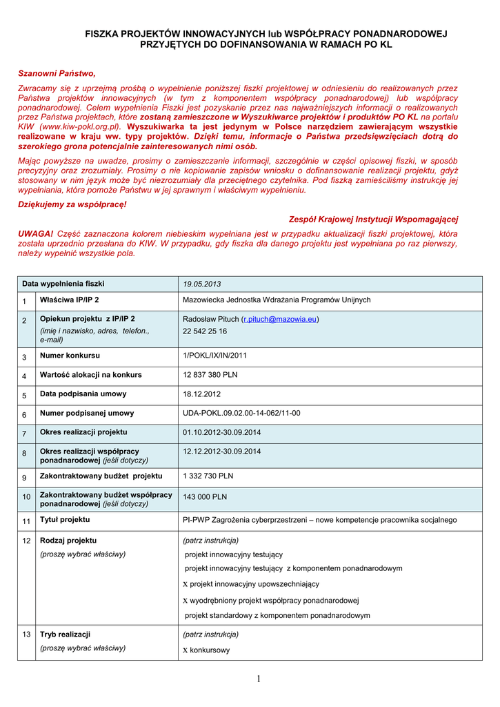 FISZKA PROJEKTÓW INNOWACYJNYCH lub WSPÓŁPRACY PONADNARODOWEJ PRZYJĘTYCH DO DOFINANSOWANIA W RAMACH PO KL Szanowni Państwo, Zwracamy się z uprzejmą prośbą o wypełnienie poniższej fiszki projektowej w odniesieniu do realizowanych przez Państwa projektów innowacyjnych (w tym z komponentem współpracy ponadnarodowej) lub współpracy ponadnarodowej. Celem wypełnienia Fiszki jest pozyskanie przez nas najważniejszych informacji o realizowanych przez Państwa projektach, które zostaną zamieszczone w Wyszukiwarce projektów i produktów PO KL na portalu KIW (www.kiw-pokl.org.pl). Wyszukiwarka ta jest jedynym w Polsce narzędziem zawierającym wszystkie realizowane w kraju ww. typy projektów. Dzięki temu, informacje o Państwa przedsięwzięciach dotrą do szerokiego grona potencjalnie zainteresowanych nimi osób. Mając powyższe na uwadze, prosimy o zamieszczanie informacji, szczególnie w części opisowej fiszki, w sposób precyzyjny oraz zrozumiały. Prosimy o nie kopiowanie zapisów wniosku o dofinansowanie realizacji projektu, gdyż stosowany w nim język może być niezrozumiały dla przeciętnego czytelnika. Pod fiszką zamieściliśmy instrukcję jej wypełniania, która pomoże Państwu w jej sprawnym i właściwym wypełnieniu. Dziękujemy za współpracę! Zespół Krajowej Instytucji Wspomagającej UWAGA! Część zaznaczona kolorem niebieskim wypełniana jest w przypadku aktualizacji fiszki projektowej, która została uprzednio przesłana do KIW. W przypadku, gdy fiszka dla danego projektu jest wypełniana po raz pierwszy, należy wypełnić wszystkie pola. Data wypełnienia fiszki 19.05.2013 1 Właściwa IP/IP 2 Mazowiecka Jednostka Wdrażania Programów Unijnych 2 Opiekun projektu z IP/IP 2 Radosław Pituch ([email protected]) (imię i nazwisko, adres, telefon., e-mail) 22 542 25 16 3 Numer konkursu 1/POKL/IX/IN/2011 4 Wartość alokacji na konkurs 12 837 380 PLN 5 Data podpisania umowy 18.12.2012 6 Numer podpisanej umowy UDA-POKL.09.02.00-14-062/11-00 7 Okres realizacji projektu 01.10.2012-30.09.2014 8 Okres realizacji współpracy ponadnarodowej (jeśli dotyczy) 12.12.2012-30.09.2014 9 Zakontraktowany budżet projektu 1 332 730 PLN 10 Zakontraktowany budżet współpracy ponadnarodowej (jeśli dotyczy) 143 000 PLN 11 Tytuł projektu PI-PWP Zagrożenia cyberprzestrzeni – nowe kompetencje pracownika socjalnego 12 Rodzaj projektu (patrz instrukcja) (proszę wybrać właściwy) projekt innowacyjny testujący projekt innowacyjny testujący z komponentem ponadnarodowym x projekt innowacyjny upowszechniający x wyodrębniony projekt współpracy ponadnarodowej projekt standardowy z komponentem ponadnarodowym 13 Tryb realizacji (patrz instrukcja) (proszę wybrać właściwy) x konkursowy 1 systemowy 14 Opis projektu (maks. 3 000 znaków): a) cel główny projektu Cel innowacji – włączenie nowego tematu i metody w kształceniu zawodowym nt. zagrożeń cyberprzestrzeni - realizowany będzie przy wykorzystaniu produktu finalnego w postaci kompleksowego programu kształcenia. Nowoczesny (modułowy) program pozwoli zrealizować jednocześnie wszystkie cele procesu kształcenia takie jak: - dostarczanie wiedzy, - wzmocnienie umiejętności praktycznych, - formowanie i promowanie ogólnych kompetencji społecznych. b) problemy, które rozwiązuje współpraca ponadnarodowa (dotyczy tylko projektów współpracy ponadnarodowej oraz innowacyjnych z komponentem ponadnarodowym) 1. Zmiana dotychczasowego podejścia do profilaktyki zagrożeń, jakie stwarza cyberprzestrzeń, 2. znalezienie nowych, lepszych i bardziej efektywnych sposobów rozwiązywania problemów związanych z zagrożeniami cyberprzestrzeni. c) cele do osiągnięcia we współpracy ponadnarodowej (dotyczy tylko projektów współpracy ponadnarodowej oraz innowacyjnych z komponentem ponadnarodowym) Opracowanie programu kształcenia pracowników służb społecznych, który pozwoli wykształcić i wszechstronnie przygotować te osoby do pracy z osobami i rodzinami dotkniętymi problemami świata wirtualnego. Planowane rezultaty i produkty współpracy obejmują: - przegląd doświadczeń w dziedzinie kształcenia zawodowego, funkcjonowania służb społecznych oraz związanych z tematyką zagrożeń cyberprzestrzeni, w postaci zestawu prezentacji i protokołów ze spotkań oraz raportu o współpracy z rekomendacjami dla produktu i projektu, - wspólne prace nad produktem i strategią wdrażania projektu, - współudział ekspertów w fazie testowania, - wykłady ekspertów zagranicznych. d) planowane efekty współpracy ponadnarodowej (dotyczy tylko projektów współpracy ponadnarodowej oraz innowacyjnych z komponentem ponadnarodowym) 15 1. Podniesienie świadomości co do zagrożeń cyberprzestrzeni, 2. przygotowanie 150 pracowników socjalnych i kadr pomocy społecznej do rozpoznawania nowych zagrożeń powodowanych przez cyberprzestrzeń i ich skutków społecznych, 3. wzmocnienie kompetencji zawodowych: użytkowników projektu i odbiorców – pracowników służb społecznych, 4. modernizacja oferty kształcenia zawodowego pracowników służb społecznych (tym szczególnie pracowników socjalnych), 5. poprawa zdolności adaptacyjnych pracowników socjalnych i służb społecznych do zmian zachodzących w gospodarce, 6. modyfikacja kierunków i specjalności na i społecznych kształcących służby społeczne. uczelniach humanistycznych e) zwięzły opis działań upowszechniających (dotyczy tylko projektów innowacyjnych, w tym innowacyjnych z komponentem ponadnarodowym) Stworzenie bazy mediów, nawiązanie współpracy z fundacjami, firmami i organizacjami zajmującymi się obszarem problematyki objętej przez projekt. Duże znaczenie w procesie upowszechniania będzie miało wykorzystanie narzędzi BTL oraz działania w Internecie i funkcjonowanie strony internetowej. Wśród tych ostatnich należy wskazać (newsletter), działania poprzez fanpage na Facebook'u, a także kampanię AdWords. Pona