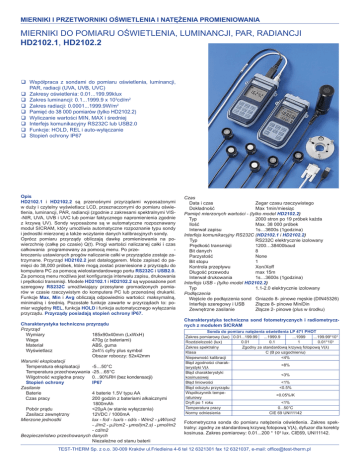MIERNIKI I PRZETWORNIKI OŚWIETLENIA I NATĘŻENIA PROMIENIOWANIA MIERNIKI DO POMIARU OŚWIETLENIA, LUMINANCJI, PAR, RADIANCJI HD2102.1, HD2102.2 Współpraca z sondami do pomiaru oświetlenia, luminancji, PAR, radiacji (UVA, UVB, UVC) Zakresy oświetlenia: 0.01...199.99klux Zakres luminancji: 0.1...1999.9 x 103cd/m2 Zakres radiacji: 0.0001...1999.9W/m2 Pamięć do 38 000 pomiarów (tylko HD2102.2) Wyliczanie wartości MIN, MAX i średniej Interfejs komunikacyjny RS232C lub USB2.0 Funkcje: HOLD, REL i auto-wyłączanie Stopień ochrony IP67 Opis HD2102.1 i HD2102.2 są przenośnymi przyrządami wyposażonymi w duży i czytelny wyświetlacz LCD, przeznaczonymi do pomiaru oświetlenia, luminancji, PAR, radiancji (zgodnie z zakresami spektralnymi VIS-NIR, UVA, UVB i UVC lub pomiar faktycznego napromienienia zgodnie z krzywą UV). Sondy wyposażone są w automatyczne rozpoznawany moduł SICRAM, który umożliwia automatyczne rozpoznanie typu sondy i jednostki mierzonej a także wczytanie danych kalibracyjnych sondy. Oprócz pomiaru przyrządy obliczają dawkę promieniowania na powierzchnię (całkę po czasie) Q(t). Progi wartości naliczanej całki i czas całkowania programowany za pomocą menu. Po przekroczeniu ustawionych progów naliczanie całki w przyrządzie zostaje zatrzymane. Przyrząd HD2102.2 jest dataloggerem. Może zapisać do pamięci do 38,000 próbek, które mogą zostać przeniesione z przyrządu do komputera PC za pomocą wielostandardowego portu RS232C i USB2.0. Za pomocą menu możliwa jest konfiguracja interwału zapisu, drukowania i prędkości transmisji. Modele HD2102.1 i HD2102.2 są wyposażone port szeregowy RS232C umożliwiający przesyłane gromadzonych pomiarów w czasie rzeczywistym do komputera PC lub przenośnej drukarki. Funkcje Max, Min i Avg obliczają odpowiednio wartości: maksymalną, minimalną i średnią. Pozostałe funkcje zawarte w przyrządach to: pomiar względny REL, funkcja HOLD i funkcja automatycznego wyłączania przyrządu. Przyrządy posiadają stopień ochrony IP67. Charakterystyka techniczna przyrządu Przyrząd Wymiary 185x90x40mm (LxWxH) Waga 470g (z bateriami) Materiał ABS, guma Wyświetlacz 2x4½ cyfry plus symbol Obszar roboczy: 52x42mm Warunki eksploatacji Temperatura eksploatacji -5…50°C Temperatura przechowywania -25…65°C Wilgotność względna pracy 0…90%RH (bez kondensacji) Stopień ochrony IP67 Zasilanie Baterie 4 baterie 1.5V typu AA Czas pracy 200 godzin z bateriami alkaicznymi 1800mAh Pobór prądu <20μA (w stanie wyłączenia) Zasilacz zewnętrzny 12VDC / 1000mA Mierzone jednostki lux - fcd - lux/s - cd/s - W/m2 - μW/cm2 - J/m2 - μJ/cm2 - μmol(m2.s) - μmol/m2 - cd/m2 Bezpieczeństwo przechowanych danych Niezależne od stanu baterii Czas Data i czas Zegar czasu rzeczywistego Dokładność Max 1min/miesiąc Pamięć mierzonych wartości - (tylko model HD2102.2) Typ 2000 stron po 19 próbek każda Ilość Max. 38 000 próbek Interwał zapisu 1s…3600s (1godzina) Interfejs komunikacyjny RS232C (HD2102.1 i HD2102.2) Typ RS232C elektrycznie izolowany Prędkość transmisji 1200…38400baud Bit danych 8 Parzystość None Bit stopu 1 Kontrola przepływu Xon/Xoff Długość przewodu max 15m Interwał drukowania 1s…3600s (1godzina) Interfejs USB - (tylko model HD2102.2) Typ 1.1-2.0 elektrycznie izolowany Podłączenia Wejście do podłączenia sond Gniazdo 8- pinowe męskie (DIN45326) Interfejs szeregowy i USB Złącze 8- pinowe MiniDin Zewnętrzne zasilanie Złącze 2- pinowe (plus w środku) Charakterystyka techniczna sond fotometrycznych i radiometrycznych z modułem SICRAM Sonda do pomiaru natężenia oświetlenia LP 471 PHOT Zakres pomiarowy (lux) 0.01...199.99 ...1999.9 ...1999 ...199.99*103 Rozdzielczość (lux) 0.01 0.1 1 0.01*103 Zakres spektralny Zgodny ze standardową krzywą fotopową V(λ) Klasa C (B po uzgodnieniu) Niepewność kalibracji <4% Błąd zgodności charak<8% terystyki V(λ Błąd charakterystyki <3% kosinusowej Błąd liniowości <1% Błąd odczytu przyrządu <0.5% Współczynnik tempe<0.05%/K raturowy Dryft po 1 roku <1% Temperatura pracy 0...50°C Normy odniesienia CIE 69 UNI11142 Fotometryczna sonda do pomiaru natężenia oświetlenia. Zakres spektralny: zgodny ze standardową krzywą fotopową V(λ), dyfuzor dla korekty kosinusa. Zakres pomiarowy: 0.01...200 * 103 lux. CIE69, UNI11142. TEST-THERM Sp. z o.o. 30-009 Kraków ul.Friedleina 4-6 tel 12 6321301 fax 12 6321037, e-mail: [email protected] 195 MIERNIKI I PRZETWORNIKI OŚWIETLENIA I NATĘŻENIA PROMIENIOWANIA Sonda do pomiaru luminancji. Zakres spektralny: zgodny ze standardową krzywą fotopową V(λ), kąt optyczny 2°. Zakres pomiarowy: 0.1...2000*103cd/m2. Względna widmowa odpowiedź Typowa krzywa odpowiedzi: LP 471 PHOT i LP 471 LUM2 1 0,9 0,8 Zakres pomiarowy (W/m2) Rozdzielczość (W/m2) Zakres spektralny Niepewność kalibracji Błąd liniowości Błąd odczytu Dryft po 1 roku Temperatura pracy 1.000 ...19.999 0.1*10-3 20.00 ...199.99 200.00 ...1999.9 0.001 0.01 400...1050nm <5% <1% ±1 cyfra <1% 0...50°C 0.1 1 0,9 0,8 0,7 0,6 0,5 0,4 0,7 0,3 0,6 0,2 0,5 0,1 0,4 0 350 0,3 450 550 650 750 850 950 1050 λ (nm) 0,2 430 480 530 580 630 680 730 780 830 λ (nm) Sonda fitofotometryczna LP471PAR Zakres pomiarowy 0.01...199.99 200.0...1999.9 (μmol/m-2s-1) Rozdzielczość 0.01 0.1 (μmol/m-2s-1) Zakres spektralny 400...700nm Niepewność kalibracji <5% Błąd liniowości <1% Błąd odczytu ±1 cyfra Dryft po 1 roku <1% Temperatura pracy 0...50°C 2000...10000 1 Rozdzielczość (W/m2) Zakres spektralny Niepewność kalibracji Błąd liniowości Błąd odczytu Dryft po 1 roku Temperatura pracy Sonda radiometryczna LP471UVA 0.1*10-3 ...999.99*10-3 0.1*10-3 1.000 ...19.999 20.00 ...199.99 200.00 ...1999.9 0.001 0.01 315...400nm (szczyt 360nm) <5% <1% ±1 cyfra <2% 0...50°C 0.1 Sonda do pomiaru promieniowania UVA. Zakres spektralny: 315...400nm (szczyt 360nm). Zakres pomiarowy: 0.1*10-3…2000 W/m2. Typowa krzywa odpowiedzi: LP 471 