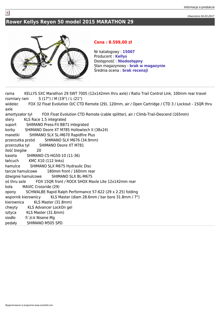 Informacje o produkcie Utworzono 04-03-2017 Rower Kellys Reyon 50 model 2015 MARATHON 29 Cena : 8.599,00 zł Nr katalogowy : 15007 Producent : Kellys Dostępność : Niedostępny Stan magazynowy : brak w magazynie Średnia ocena : brak recenzji rama KELLYS SXC Marathon 29 SWT 7005 (12x142mm thru axle) / Ratio Trail Control Link, 100mm rear travel rozmiary ram S (17") / M (19") / L (21") widelec FOX 32 Float Evolution O/C CTD Remote (29), 120mm, air / Open Cartridge / CTD 3 / Lockout - 15QR thru axle amortyzator tył FOX Float Evolution CTD Remote (cable splitter), air / Climb-Trail-Descend (165mm) stery KLS Race 1.5 integrated suport SHIMANO Press-Fit BB71 integrated korby SHIMANO Deore XT M785 Hollowtech II (38x24) manetki SHIMANO SLX SL-M670 Rapidfire Plus przerzutka przód SHIMANO SLX M676 (34.9mm) przerzutka tył SHIMANO Deore XT M781 ilość biegów 20 kaseta SHIMANO CS-HG50-10 (11-36) łańcuch KMC X10 (112 links) hamulce SHIMANO SLX M675 Hydraulic Disc tarcze hamulcowe 180mm front / 160mm rear dżwignie hamulcowe SHIMANO SLX BL-M675 oś thru axle FOX 15QR front / ROCK SHOX Maxle Lite 12x142mm rear koła MAVIC Crossride (29) opony SCHWALBE Rapid Ralph Performance 57-622 (29 x 2.25) folding wspornik kierownicy KLS Master (diam 28.6mm / bar bore 31.8mm / 7°) kierownica KLS Master (31.8mm) chwyty KLS Advancer LockOn gel sztyca KLS Master (31.6mm) siodło fi´zi:k Nisene Mg pedały SHIMANO M505 SPD Wygenerowano w programie www.oscGold.com