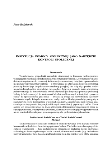 Piotr Raźniewski INSTYTUCJA POMOCY SPOŁECZNEJ JAKO NARZĘDZIE KONTROLI SPOŁECZNEJ Streszczenie Transformacja gospodarki centralnie sterowanej w kierunku wolnorynkowej w znaczącym stopniu zachwiała istniejącymi systemami wartości. Dotychczasowe narzędzia wykorzystywane do transmisji kulturowej — rozumianej tutaj jako upowszechnianie preferowanych norm i wartości — a prowadzące do utrwalania kontroli społecznej, przestały istnieć (np. dotychczasowe struktury partyjne) lub stały się z punktu widzenia zakładanych celów niewydolne (np. media). Jednym z narzędzi jakie nowoczesne państwo stosuje do kontrolowania swoich obywateli jest instytucja pomocy społecznej. Należy jednak zauważyć, że skuteczność działań realizowanych w imię idei „przywracania” do społeczeństwa jest niska — zwraca się uwagę na niewydolność systemów biurokratycznych, których immanentne cechy uniemożliwiają/utrudniają osiągnięcie zakładanych celów (szczególnie w polskich realiach), akcentowane jest również znaczenie przechwytywania instytucji publicznych do realizacji prywatnych celów. Celem autora jest zwrócenie uwagi na to, że głównymi odbiorcami propagowanych przez instytucje publiczne, w tym pomoc społeczną, kierunków światopoglądowej poprawności, nie są nominalni beneficjenci systemu pomocy, ale społeczeństwo jako całość. Institution of Social Care as a Tool of Social Control Abstract Transformation of centrally controlled economy towards free market economy has considerably shaken the existing systems of values. The hitherto tools employed for cultural transmission — here understood as spreading of preferred norms and values — leading to the strengthening of social control, either ceased to exist (e.g. the hitherto party structures) or have become malfunctioning from the point of view of the assumed 70 Piotr Raźniewski goals (e.g. mass media). One of the tools being used by contemporary state to control its citizens is institution of social care. It should be noted, however, that effectiveness of activities undertaken in the name of the idea of readjustment to life in society, is low — what’s being pointed out is malfunctioning of bureaucratic systems, whose immanent features make it impossible/difficult to achieve the assumed goals (especially in Polish reality) as well as the importance of intercepting public institutions for private purposes. The author aims at drawing attention to the fact that main recipients of the worldview correctness directions propagated by public institutions, including social care, are not nominal beneficiaries of social care system but the society as a whole. Zawarta w tytule myśl wymaga doprecyzowania, nie jest bowiem celem tej pracy mierzenie się z całym spektrum problematyki mieszczącej się w pojęciu planowanej zmiany społecznej oraz kontroli społecznej. Poświęcona jest pewnemu szczególnemu przypadkowi interwencji społecznej, którego efekty są, zdaniem autora, ukryte za podwójną zasłoną niejawności. System kapitalistyczny a pomoc społeczna Jedną z konsekwencji obserwowanej od początków lat 90-tych głębokiej zmiany systemowej była zmiana struktury interesów poszczególnych aktorów życia publicznego w Polsce. Wzmiankowane zjawiska mogą przybierać formę zróżnicowanych procesów: destrukcji pewnych interesów, walki o przeniesienie starych interesów w nową rzeczywistość, wyłanianie się nowych interesów oraz ich dekompozycję i rekompozycję (W. Wesołowski 1995, s. 7). Oczywiście nie są to procesy przebiegające bez wywoływania konfliktów, a nawet walki między poszczególnymi aktorami życia społecznego, a przede wszystkim publicznego. Zasadniczą osią opisywanego przełomu było przejście od gospodarki opartej na własności państwowej i planowaniu do gospodarki opartej na własności prywatnej i mechanizmach rynku. Należy jednocześnie zauważyć, że dla części społeczeństwa nagła zmiana ustroju spowodowała pojawienie się uczucia „normatywnej pustki” (E. Wnuk-Lipiński 2005, s. 208) — bowiem istotny dla wielu punkt odniesienia, jakim była obecność określonego systemu politycznego, nagle zniknął. Na jego miejsce pojawił się natomiast nowy, najczęściej nieznany w swoim realnym wymiarze (bądź przesadnie zmitologizowany) system kapitalistyczny. W znacznej mierze przebieg procesów, Instytucja pomocy społecznej jako narzędzie kontroli społecznej 71 którym podlegało transformujące się społeczeństwo był wypadkową mechanizmów dostosowawczych, uruchomionych przez poszczególnych aktorów życia społecznego (zarówno indywidualnych jak i zbiorowych) oraz narzuconych odgórnie regulacji (a właściwie deregulacji) wprowadzanych w sferze gospodarki i polityki, w imię idei państwa kapitalistycznego. Prowadzenie działalności gospodarczej jest często traktowane jako gra o sumie zerowej, żeby ktoś wygrał — czyli osiągnął zysk, ktoś musi przegrać, czyli ponieść stratę. Jednakże wbudowana w system kapitalistyczny zasada zdrowego egoizmu, nie powoduje, że jest on przez to zły, czy amoralny (R. B., jr., Hawkins 1994, s. 9). Jeżeli bowiem elementem natury ludzkiej jest instynkt racjonalnej zachłanności, to należy tym instynktom — chciwości — pozwolić rozwijać się, aby — tak jak twierdzili Mandewille i Smith — rynek przemienił te prywatne przywary w publiczne cnoty (P. H. Dembiński 2001). Przedstawione sposoby rozumienia działalności gospodarczej, eksponujące egoistyczne aspekty działalności ekonomicznej wywodzone jakoby z natury ludzkiej, są bliskie filozoficznym poglądom Thomasa Hobbesa. Zgodnie z jego koncepcją człowiek jest istotą zdolną wyłącznie do realizacji egoistycznych pragnień i celów, dbającą tylko o własne potrzeby i interesy (T. Hobbes 1954, s. 150). Ten model działania przeniesiony w sferę aktywności ekonomicznej, określany bywa mianem „wilczego kapitalizmu”, w 