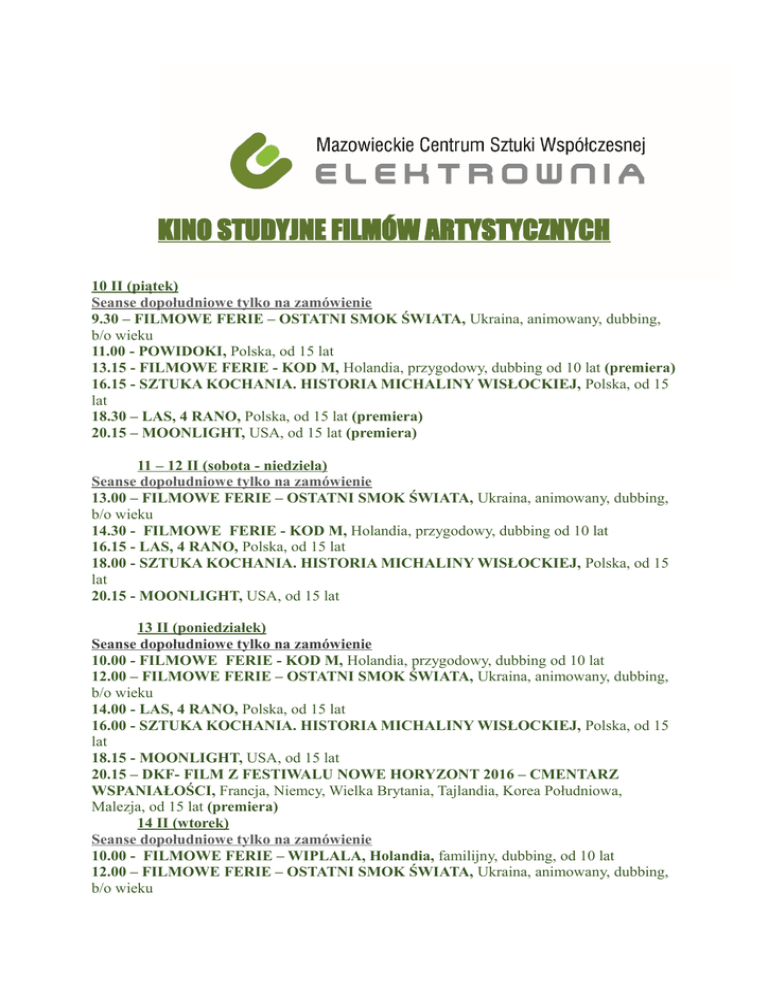 KINO STUDYJNE FILMÓW ARTYSTYCZNYCH 10 II (piątek) Seanse dopołudniowe tylko na zamówienie 9.30 – FILMOWE FERIE – OSTATNI SMOK ŚWIATA, Ukraina, animowany, dubbing, b/o wieku 11.00 - POWIDOKI, Polska, od 15 lat 13.15 - FILMOWE FERIE - KOD M, Holandia, przygodowy, dubbing od 10 lat (premiera) 16.15 - SZTUKA KOCHANIA. HISTORIA MICHALINY WISŁOCKIEJ, Polska, od 15 lat 18.30 – LAS, 4 RANO, Polska, od 15 lat (premiera) 20.15 – MOONLIGHT, USA, od 15 lat (premiera) 11 – 12 II (sobota - niedziela) Seanse dopołudniowe tylko na zamówienie 13.00 – FILMOWE FERIE – OSTATNI SMOK ŚWIATA, Ukraina, animowany, dubbing, b/o wieku 14.30 - FILMOWE FERIE - KOD M, Holandia, przygodowy, dubbing od 10 lat 16.15 - LAS, 4 RANO, Polska, od 15 lat 18.00 - SZTUKA KOCHANIA. HISTORIA MICHALINY WISŁOCKIEJ, Polska, od 15 lat 20.15 - MOONLIGHT, USA, od 15 lat 13 II (poniedziałek) Seanse dopołudniowe tylko na zamówienie 10.00 - FILMOWE FERIE - KOD M, Holandia, przygodowy, dubbing od 10 lat 12.00 – FILMOWE FERIE – OSTATNI SMOK ŚWIATA, Ukraina, animowany, dubbing, b/o wieku 14.00 - LAS, 4 RANO, Polska, od 15 lat 16.00 - SZTUKA KOCHANIA. HISTORIA MICHALINY WISŁOCKIEJ, Polska, od 15 lat 18.15 - MOONLIGHT, USA, od 15 lat 20.15 – DKF- FILM Z FESTIWALU NOWE HORYZONT 2016 – CMENTARZ WSPANIAŁOŚCI, Francja, Niemcy, Wielka Brytania, Tajlandia, Korea Południowa, Malezja, od 15 lat (premiera) 14 II (wtorek) Seanse dopołudniowe tylko na zamówienie 10.00 - FILMOWE FERIE – WIPLALA, Holandia, familijny, dubbing, od 10 lat 12.00 – FILMOWE FERIE – OSTATNI SMOK ŚWIATA, Ukraina, animowany, dubbing, b/o wieku 14.00 – LAS, 4 RANO, Polska, od 15 lat 15.45 - MOONLIGHT, USA, od 15 lat 18.00, 20.15 – SZTUKA KOCHANIA. HISTORIA MICHALINY WISŁOCKIEJ, Polska, od 15 lat 15 II (środa) Seanse dopołudniowe tylko na zamówienie 10.00 - FILMOWE FERIE - KOD M, Holandia, przygodowy, dubbing od 10 lat 12.00 - FILMOWE FERIE – OSTATNI SMOK ŚWIATA, Ukraina, animowany, dubbing, b/o wieku 14.00, 18.00 – SZTUKA KOCHANIA. HISTORIA MICHALINY WISŁOCKIEJ, Polska, od 15 lat 16.15 - LAS, 4 RANO, Polska, od 15 lat 20.15 - MOONLIGHT, USA, od 15 lat 16 II (czwartek) Seanse dopołudniowe tylko na zamówienie 10.00 - FILMOWE FERIE - KOD M, Holandia, przygodowy, dubbing od 10 lat (ostatni dzień) 12.00 - FILMOWE FERIE – OSTATNI SMOK ŚWIATA, Ukraina, animowany, dubbing, b/o wieku 14.00, 18.00 – SZTUKA KOCHANIA. HISTORIA MICHALINY WISŁOCKIEJ, Polska, od 15 lat 16.15 - MOONLIGHT, USA, od 15 lat 20.15 - LAS, 4 RANO, Polska, od 15 lat (ostatni dzień) Ceny biletów: - tani poniedziałek: 10 zł, wtorek - czwartek: 12 zł, piątek - niedziela: 15 zł - filmy dla dzieci: 12 zł Ceny karnetów: - karnety na trzy dowolnie wybrane filmy w ramach DKF, zakupione po 1 I 2017 ważne do 30 VI 2017 - 21 zł, karnet na jeden film - 10 zł - po okazaniu biletu z kina otrzymujesz promocję na zakup biletu na wystawę - karnety i zaproszenia są ważne po uprzedniej rejestracji w kasie kina - po zakupie biletu, kasa nie przyjmuje zwrotów - miejsca na widowni są nienumerowane Seanse dopołudniowe tylko na zamówienie. Seanse dopołudniowe tylko na zamówienie. Informacje pod nr tel. (48) 383 60 77, (48) 386 16 60, a także na stronie internetowej www.elektrownia.art.pl Opisy filmów: Premiery: LAS, 4 RANO, dramat, reż. Jan Jakub Kolski, Polska 2016 (97’) FORST jest zamożnym, dobrze zorganizowanym człowiekiem. Kiedy go poznajemy, wydaje się królem życia. Któregoś dnia porzuca korporację w której jest wiceprezesem. Zniszczenia jakie po sobie zostawia, nie dają nadziei na powrót. Las, 4 rano kilka lat później. Na wpół zdziczały dziad leśny; zarośnięty, brudny, w łachmanach – zakłada wnyki na zwierzęta. Rozpoznajemy; to ten sam człowiek – Forst. Mężczyzna mieszka w lesie, w wybudowanej przez siebie ziemiance. Za towarzystwo ma trójnogiego psa. Żywi się mięsem upolowanej zwierzyny, żyje w zgodzie z przyrodą. Któregoś dnia przed drzwiami jego samotni staje 13letnia dziewczynka JADZIA. Forst musi po raz kolejny zmieniać swoje życie… Źródło: Wrocławska Fundacja Filmowa MOONLIGHT, dramat, reż. Barry Jenkins, USA 2017 (111’) Obsypany nagrodami „Moonlight”, Kronika życia młodego Afroamerykanina Od dzieciństwa do dorosłości, to dzieło absolutnie wyjątkowe. Film stanowi zarazem ponadczasową opowieść o poszukiwaniu swego miejsca w świecie, jak i głęboko osobiste, poetyckie studium tożsamości, rasy, dojrzewania, męskości, rodziny, przyjaźni i miłości. Akcja filmu, bazującego na autentycznych wydarzeniach, rozgrywa się na przestrzeni dwóch dekad w dzielnicy nędzy w Miami. Bohatera w ciągu trzech faz życia odgrywa tercet utalentowanych aktorów – Alex Hibbert, Ashton Sanders oraz Trevante Rhodes. Chirona poznajemy jako zagubionego chłopca, którego z opresji ratuje lokalny diler. Następnie obserwujemy prześladowanego przez rówieśników nastolatka, zmagającego się z własną seksualnością, i wreszcie dorosłego czarnoskórego mężczyznę. Niezwykle empatyczna wizja Barry’ego Jenkinsa dotyka uniwersalnych prawd i momentów, które kształtują nasze życie i czynią nas tym, kim jesteśmy. Źródło: Solopan CMENTARZ WSPANIAŁOŚCI, dramat, fantasy, reż. Apichatpong Weerasethakul, Francja, Niemcy, Wielka Brytania, Tajlandia, Korea Południowa 2016 (122’) Fabuła filmu skupia się wokół dawnego budynku szkoły, w którym został utworzony szpital do opieki nad żołnierzami pogrążonymi w tajemniczej śpiączce. Jenjira, także mająca problemy ze zdrowiem, zgłasza się do placówki jako wolontariuszka. Jest szczególnie zainteresowana żołnierzem o imieniu Itt i to jemu poświęca najwięcej uwagi. Z czasem Jenjira zauważa, że nawiązuje z nim kontakt, a niedługo potem żołnierz odzyskuje świadomość. Prosta narracja skrywa wielowymiarową opowieść, niepoddającą się łatwym i jednoznacznym interpretacjom. Inspiracją dla tej historii mógł 