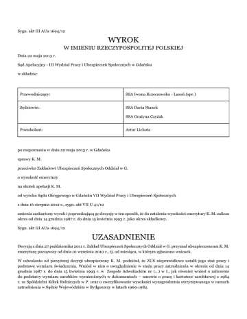 Sygn. akt III AUa 1694/12 WYROK W IMIENIU RZECZYPOSPOLITEJ POLSKIEJ Dnia 22 maja 2013 r. Sąd Apelacyjny - III Wydział Pracy i Ubezpieczeń Społecznych w Gdańsku w składzie: Przewodniczący: SSA Iwona Krzeczowska - Lasoń (spr.) Sędziowie: SSA Daria Stanek SSA Grażyna Czyżak Protokolant: Artur Lichota po rozpoznaniu w dniu 22 maja 2013 r. w Gdańsku sprawy K. M. przeciwko Zakładowi Ubezpieczeń Społecznych Oddział w G. o wysokość emerytury na skutek apelacji K. M. od wyroku Sądu Okręgowego w Gdańsku VII Wydział Pracy i Ubezpieczeń Społecznych z dnia 16 sierpnia 2012 r., sygn. akt VII U 41/12 zmienia zaskarżony wyrok i poprzedzającą go decyzję w ten sposób, że do ustalenia wysokości emerytury K. M. zalicza okres od dnia 14 grudnia 1987 r. do dnia 15 kwietnia 1993 r. jako okres składkowy. Sygn. akt III AUa 1694/12 UZASADNIENIE Decyzją z dnia 27 października 2011 r. Zakład Ubezpieczeń Społecznych Oddział w G. przyznał ubezpieczonemu K. M. emeryturę począwszy od dnia 01 września 2010 r., tj. od miesiąca, w którym zgłoszono wniosek. W odwołaniu od powyższej decyzji ubezpieczony K. M. podniósł, że ZUS nieprawidłowo ustalił jego staż pracy i podstawę wymiaru świadczenia. Wniósł w nim o uwzględnienie w stażu pracy zatrudnienia w okresie od dnia 14 grudnia 1987 r. do dnia 15 kwietnia 1993 r. w Zespole Adwokackim nr (...) w I., jak również wniósł o zaliczenie do podstawy wymiaru zarobków wymienionych w dokumentach – umowie o pracę i kartotece zarobkowej z 1984 r. ze Spółdzielni Kółek Rolniczych w P. oraz o zweryfikowanie wysokości wynagrodzenia otrzymywanego w ramach zatrudnienia w Sądzie Wojewódzkim w Bydgoszczy w latach 1969-1982. W odpowiedzi na odwołanie z dnia 30 grudnia 2011 r. pozwany organ rentowy wniósł o jego oddalenie, podtrzymując stanowisko przedstawione w zaskarżonej decyzji. Wnioskodawca w toku procesu modyfikował zakres zarzutów i ostatecznie wniósł o zaliczenie do podstawy wymiaru emerytury okresu jego zatrudnienia: - od dnia 02 listopada 1984 r. do dnia 13 grudnia 1987 r. w Kancelarii (...) w P. - od dnia 14 grudnia 1987 r. do dnia 15 kwietnia 1993 r. w Zespole Adwokackim nr (...) w I. - od dnia 15 kwietnia 1993 r. do dnia 18 listopada 1994 r. w Kancelarii Adwokackiej “L.” w I.. Pozwany podtrzymał swoje stanowisko w sprawie i wskazał, że ubezpieczony był zgłoszony do ubezpieczenia społecznego w okresie od dnia 01 grudnia 1984 r. do dnia 31 grudnia 1985 r., od dnia 01 marca 1986 r. do dnia 30 czerwca 1986 r. oraz od dnia 15 września 1986 r. do 30 listopada 1987 r. Powyższe okresy nie korespondują z okresami wynikającymi z zaświadczenia z Okręgowej Rady Adwokackiej w B. z dnia 15 czerwca 2011 r. oraz ze świadectwa pracy z Okręgowej Rady Adwokackiej w B. z dnia 01 marca 2012 r. W związku z powyższym pozwany do stażu pracy zaliczył w/ w okresy zgłoszenia K. M. do ubezpieczenia – nie zaliczając okresu od dnia 14 grudnia 1987 r. do dnia 15 kwietnia 1993 r. tj. okresu zatrudnienia w Zespole Adwokackim nr (...) w I.. Jednocześnie pozwany wskazał, że do stażu pracy nie zaliczył również ubezpieczonemu okresu od dnia 15 kwietnia 1993 r. do dnia 18 listopada 1994 r., podstawą czego jest brak zgłoszenia ubezpieczonego do ubezpieczenia społecznego w w/w okresie prowadzenia indywidualnej Kancelarii Adwokackiej “L.” w I.. Sąd Okręgowy w Gdańsku VII Wydział Pracy i Ubezpieczeń Społecznych wyrokiem z dnia 16 sierpnia 2012 r. oddalił odwołanie ( pkt I) i orzekł o kosztach procesu (pkt II). Sąd Okręgowy ustalił, że wnioskodawca K. M., urodzony w dniu (...), z zawodu jest prawnikiem, w 1969 r. ukończył wyższe studia prawnicze na Uniwersytecie M. K. w T.. Przez cały okres aktywności zawodowej wykonywał zawód sędziego sądu rejonowego, radcy prawnego oraz adwokata. W okresie od dnia 01 października 1963 r. do dnia 31 października 1963 r. oraz od dnia 16 stycznia 1964 r. do dnia 30 września 1964 r. ubezpieczony K. M. był zatrudniony w Gminnej Spółdzielni (...) w Ż. w pełnym wymiarze czasu pracy na stanowisku referenta sprzedaży. W okresie od dnia 02 listopada 1963 r. do dnia 14 grudnia 1963 r. ubezpieczony zatrudniony był w Spółdzielni Pracy (...) w J.. W okresie od dnia 01 października 1964 r. do dnia 30 września 1969 r. ubezpieczony odbył studia prawnicze na Uniwersytecie M. K. w T., ukończone zdobyciem dyplomu magistra prawa. W okresie od dnia 01 października 1969 r. do dnia 31 maja 1982 r. ubezpieczony był zatrudniony w Sądzie Wojewódzkim w Bydgoszczy jako aplikant sądowy (1969-1970), asesor sądowy Sądu Powiatowego w T. (1971-1974), następnie sędzia i Prezes Sądu Rejonowego w Tucholi (1979-1981) oraz sędzia i Prezes Sądu Rejonowego w Inowrocławiu (1981-1982). W dniu 31 maja 1982 r. ubezpieczony zrezygnował ze stanowiska sędziego. W okresie od 02 listopada 1984 r. do dnia 13 kwietnia 1984 r. ubezpieczony był zatrudniony w (...) Centrali (...) na stanowisku radcy prawnego w wymiarze ½ etatu. W okresie od dnia 16 sierpnia 1982 r. do dnia 31 lipca 1984 r. ubezpieczony był zatrudniony w Wojewódzkim Związku (...) w B. na stanowisku radcy prawnego w wymiarze ½ etatu. W okresie od dnia 16 kwietnia 1983 r. do dnia 31 października 1984 r. ubezpieczony był zatrudniony w Wojewódzkim Zakładzie (...) w B. na stanowisku radcy prawnego. W okresie od dnia 02 listopada 1984 r. do dnia 13 grudnia 1987 r. ubezpieczony był zatrudniony w Kancelarii (...) w P. jako adwokat. W okresie od dnia 14 grudnia 1987 r. do dnia 15 kwietnia 1993 r. ubezpieczony był zatrudniony w Zespole Adwokackim nr (...) w I. jako adwokat. Okręgowa Rada Adwokacka w B. wystawiła ubezpieczonemu świadectwo pracy potwierdzające powyższy okres zatrudnienia na podstawie wpisów do Rejestru (...) i nie dysponuje żadnymi innymi dokumentami płacowymi dotyczącymi osoby ubezpieczonego. W okresie od dnia 15 kwietnia 1993 r. do dnia 18 listopada 1994 r. ubezpieczony był zat