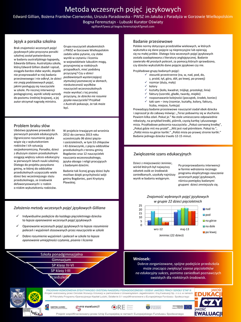 Metoda wczesnych pojęć językowych Edward Gillian, Bożena Franków-Czerwonko, Urszula Paradowska - PWSZ im Jakuba z Paradyża w Gorzowie Wielkopolskim Bogna Ferensztajn - Lubuski Kurator Oświaty egillianATpwsz.pl bogna.ferensztajnATgmail.com Język a porażka szkolna Brak znajomości wczesnych pojęć językowych jako przyczyna porażki szkolnej został potwierdzony w badaniu australijskiego logopedy, Edwarda Gilliana. Australijska szkoła, którą Edward Gillian zbadał i opisał, osiągała bardzo słabe wyniki, dopóki nie przeprowadził w niej badania przesiewowego i nie odkrył, że dzieci nie znają podstawowych pojęć, jakimi posługują się nauczyciele w szkole. Po rocznej interwencji pedagogicznej, wyniki szkoły wzrosły do poziomu średniej krajowej, a jej autor otrzymał nagrodę ministra. Badanie przesiewowe Grupa nauczycieli akademickich z PWSZ w Gorzowie Wielkopolskim zadała sobie pytanie, czy słabe wyniki w czytaniu i liczeniu w województwie lubuskim mogą, przynajmniej w niektórych przypadkach, mieć podobną przyczynę? Czy u dzieci pozbawionych wystarczającej stymulacji poznawczej w domach, nieskuteczność wysiłków nauczycieli wczesnoszkolnych może wynikać z tej prostej przyczyny, że dziecko nie rozumie języka nauczyciela? Przykład z Australii pokazuje, że tak może być. Problem braku słów Ubóstwo językowe prowadzi do pierwszych porażek edukacyjnych. Ograniczone rozumienie języka wiąże się z wykształceniem rodziców i ich sytuacją socjoekonomiczną. Ponadto, dzieci z dłuższym stażem przedszkolnym osiągają większy sukces edukacyjny w pierwszych latach nauki szkolnej. Dlatego do projektu pozyskano gminę, w której do oddziałów przedszkolnych uczęszczało wiele dzieci bez wcześniejszego stażu przedszkolnego, ze środowisk defaworyzowanych i z rodzin o niskim wykształceniu rodziców. W projekcie trwającym od września 2012 do czerwca 2013 roku uczestniczyło 96 dzieci pięcioi sześcioletnich, w tym 53 chłopców i 43 dziewczynki, z pięciu oddziałów przedszkolnych z terenu gminy Bogdaniec oraz 12 nauczycielek nauczania wczesnoszkolnego, języka obcego i religii pracujących z badanymi dziećmi. Badanie tak licznej grupy dzieci było możliwe dzięki przychylności wójt gminy Bogdaniec, pani Krystyny Pławskiej. Polskie normy dotyczące przedziałów wiekowych, w których wykształca się dane pojęcie są nieprecyzyjne lub opierają się na małej próbie. Dlatego lista wczesnych pojęć językowych została zaadaptowana z literatury anglojęzycznej. Badanie zawierało 46 prostych poleceń, za pomocą których sprawdzono, czy dziecko wykształciło dane pojęcie językowe czy nie. Przykładowe grupy badanych pojęć: stosunki przestrzenne (na, w, nad, pod, do, z, przód, tył, góra, dół, po lewej, po prawej) rozmiar (duży, mały) kolory kształty (koło, kwadrat, trójkąt, prostokąt, linia) faktury (szorstki, gładki, twardy, miękki) rozpoznawanie kolejności (początek, środek, koniec) taki sam – inny (rozmiar, kształty, kolory, faktury, liczba, miejsce, funkcja) Prowadzący badanie przesiewowe nauczyciel siadał obok dziecka i zapraszał je do zabawy mówiąc: „Teraz pobawimy się w słuchanie. Powiem kilka zdań. Pokaż je.” Na stole umieszczano odpowiednie rekwizyty, na przykład kredki, piórnik, czystą kartkę i pluszowego misia. Przykładowe polecenia nauczyciela: „Pokaż czerwoną kredkę”, „Pokaż gdzie miś ma przód”, „Miś jest nad piórnikiem. Pokaż to.”, „Połóż misia na górze kartki.” „Połóż misia po prawej stronie kartki.” Badanie jednego dziecka trwało 12-15 minut. Zwiększenie szans edukacyjnych Dzieci z miejscowości Jeniniec, wśród których był najwyższy odsetek osób ze środowisk zaniedbanych, uzyskały najniższy wynik w badaniu wstępnym. Po przeprowadzeniu interwencji w formie wdrożenia rocznego programu eksplicytnego nauczania wczesnych pojęć językowych, różnica pomiędzy badanymi grupami dzieci zmniejszyła się. Znajomość wybranych pojęć językowych w grupie 22 dzieci pięcioletnich Założenia metody wczesnych pojęć językowych Gilliana Indywidualne podejście do każdego pięcioletniego dziecka to lepsze opanowanie wczesnych pojęć językowych Opanowanie wczesnych pojęć językowych to lepsze rozumienie poleceń i wyjaśnień stosowanych przez nauczyciela w szkole Dobre rozumienie wyjaśnień i poleceń w szkole to lepsze opanowanie umiejętności czytania, pisania i liczenia Szkoła ponadgimnazjalna Gimnazjum SP klasy IV-VI SP klasy I-III Przedszkole 25 20 15 10 5 0 nad pod na górze wrz-12 maj-13 na dole po lewej Jeniniec (22 dzieci) Wniosek: Dobrze zorganizowane, spójne podejście przedszkola może znacząco zwiększyć szanse pięciolatków na edukacyjny sukces, pomimo zaniedbań poznawczych swoistych dla niektórych środowisk.