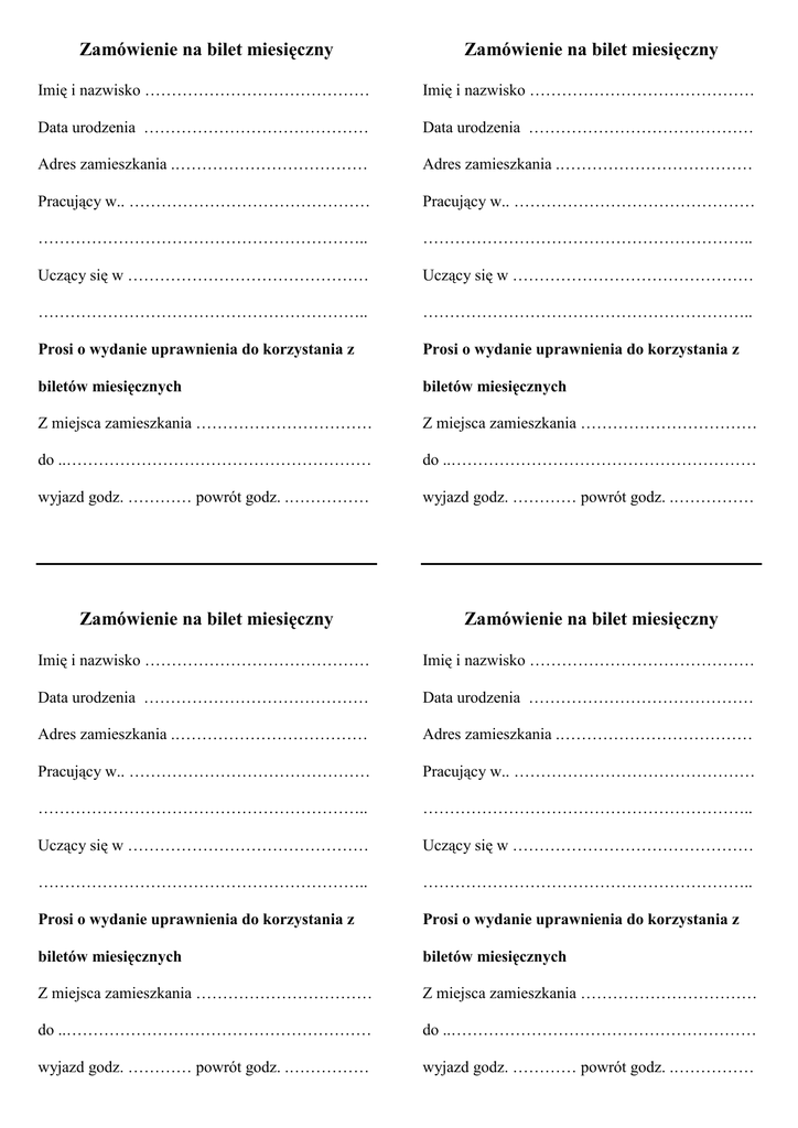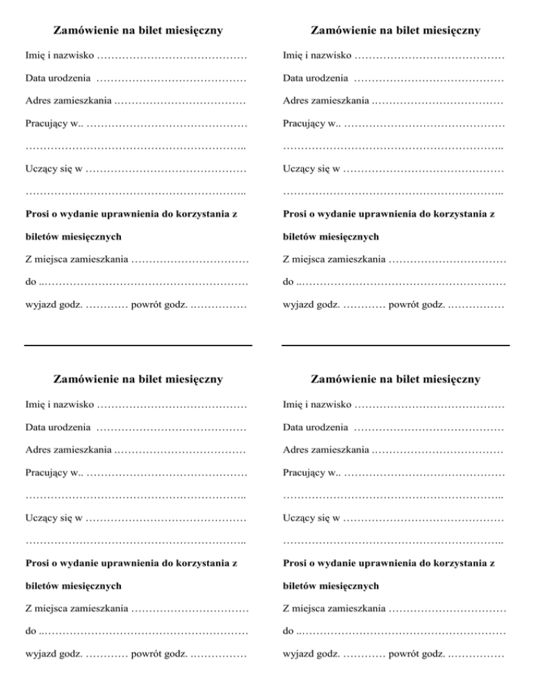 Zamówienie na bilet miesięczny Zamówienie na bilet miesięczny Imię i nazwisko …………………………………… Imię i nazwisko …………………………………… Data urodzenia …………………………………… Data urodzenia …………………………………… Adres zamieszkania .……………………………… Adres zamieszkania .……………………………… Pracujący w.. ……………………………………… Pracujący w.. ……………………………………… …………………………………………………….. …………………………………………………….. Uczący się w ……………………………………… Uczący się w ……………………………………… …………………………………………………….. …………………………………………………….. Prosi o wydanie uprawnienia do korzystania z Prosi o wydanie uprawnienia do korzystania z biletów miesięcznych biletów miesięcznych Z miejsca zamieszkania …………………………… Z miejsca zamieszkania …………………………… do ..………………………………………………… do ..………………………………………………… wyjazd godz. ………… powrót godz. .…………… wyjazd godz. ………… powrót godz. .…………… Zamówienie na bilet miesięczny Zamówienie na bilet miesięczny Imię i nazwisko …………………………………… Imię i nazwisko …………………………………… Data urodzenia …………………………………… Data urodzenia …………………………………… Adres zamieszkania .……………………………… Adres zamieszkania .……………………………… Pracujący w.. ……………………………………… Pracujący w.. ……………………………………… …………………………………………………….. …………………………………………………….. Uczący się w ……………………………………… Uczący się w ……………………………………… …………………………………………………….. …………………………………………………….. Prosi o wydanie uprawnienia do korzystania z Prosi o wydanie uprawnienia do korzystania z biletów miesięcznych biletów miesięcznych Z miejsca zamieszkania …………………………… Z miejsca zamieszkania …………………………… do ..………………………………………………… do ..………………………………………………… wyjazd godz. ………… powrót godz. .…………… wyjazd godz. ………… powrót godz. .……………