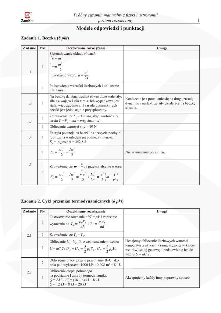 Próbny egzamin maturalny z fizyki i astronomii poziom rozszerzony Modele odpowiedzi i punktacji Zadanie 1. Beczka (8 pkt) Zadanie Pkt 1 1.1 1.2 1.3 1.4 Oczekiwane rozwiązanie Sformułowanie układu równań at at 2 s 2 2 i uzyskanie wzoru a . 2s Uwagi 1 Podstawienie wartości liczbowych i obliczenie a ≈ 1 m/s2. 1 Na beczkę działają wzdłuż równi dwie stałe siły: Konieczne jest powołanie się na drugą zasadę siła zsuwająca i siła tarcia. Ich wypadkowa jest dynamiki i na fakt, że siły działające na beczkę stała, więc zgodnie z II zasadą dynamiki ruch są stałe. beczki jest jednostajnie przyspieszony. 1 Zauważenie, że Fs – T = ma, skąd wartość siły tarcia T = Fs – ma = m (g sin a – a). 1 Obliczenie wartości siły: ~19 N 1 Energia potencjalna beczki na szczycie pochylni (obliczana względem jej podnóża) wynosi: Ep = mgs sin a = 352,8 J 1 Ek 1.5 m 2 I 2 2 2 Nie wymagamy objaśnień. , i przekształcenie wzoru: r I m 2 I 2 m 2 I 2 2 Ek 2 m 2 2 2 2 2 2r r Zauważenie, że 1 Zadanie 2. Cykl przemian termodynamicznych (8 pkt) Zadanie Pkt 1 2.1 Oczekiwane rozwiązanie Zastosowanie równania nRT = pV i zapisanie pV pV wyrażenia na TB B B i TC C C . nR nR 1 Zauważenie, że TA = TB. 1 Obliczenie UA, UB, UC z zastosowaniem wzoru 3 3 U = nCVT: U A U B pBVB , U C pCVC 2 2 1 Obliczenie pracy gazu w przemianie B–C jako pola pod wykresem: 1000 kPa · 0,008 m3 = 8 kJ. 1 Obliczenie ciepła pobranego na podstawie I zasady termodynamiki: Q = DU – Wz = (18 – 6) kJ + 8 kJ Q = 12 kJ + 8 kJ = 20 kJ 2.2 Uwagi Uznajemy obliczenie liczbowych wartości temperatur z użyciem (zamieszczonej w karcie wzorów) stałej gazowej i podstawienie ich do wzoru U = nCVT. Akceptujemy każdy inny poprawny sposób. 1 Próbny egzamin maturalny z fizyki i astronomii poziom rozszerzony Zadanie Pkt 2.3 1 2.4 Oczekiwane rozwiązanie Uwagi Średnia energia kinetyczna każdej cząsteczki gazu jest wprost proporcjonalna do temperatury bezwzględnej, zatem suma energii wszystkich Jeśli uczeń napisze wzór U = N ∙ Ek śr = NCT, to cząsteczek gazu jest także wprost proporcjonalna powinien zaznaczyć, że jest tak tylko dla gazu do temperatury gazu. doskonałego. Suma energii kinetycznych cząsteczek jest jednym ze składników energii wewnętrznej. 1 Zdanie nie jest prawdziwe. 1 Energia wewnętrzna gazu doskonałego U = N ∙ Ek śr, a średnia energia kinetyczna cząsteczki jest proporcjonalna do kwadratu jej średniej szybkości. Zadanie 3. Półprzewodniki (6 pkt) Zadanie Pkt 1 3.1 1 b) Od liczby atomów domieszki 1 b) Od temperatury 1 W temperaturze pokojowej E1 1 Za obliczenie nowej różnicy potencjałów: U – DU = 0,09 V 1 E2 3.2 Oczekiwane rozwiązanie a) Od temperatury Uwagi U V 5105 . d m Uznajemy obliczenia wykonane bezpośrednio na liczbowych wartościach, a nie na symbolach. U U V 2, 25105 d m Zadanie 4. Układy soczewek (7 pkt) Zadanie Pkt Oczekiwane rozwiązanie 4.1 1 Poprawne rozmieszczenie ognisk. Poprawne poprowadzenie promienia. 1 Obliczenie zdolności skupiającej soczewek 5 D i 2,5 D. Uwagi 2 Próbny egzamin maturalny z fizyki i astronomii poziom rozszerzony Zadanie Pkt Oczekiwane rozwiązanie 3 Uwagi 4.2 1 Poprawne poprowadzenie dwóch promieni. 1 Poprawne podanie cech: rzeczywisty, powiększony, odwrócony. 1 Obiektyw tworzy obraz rzeczywisty, powiększony i odwrócony między obiektywem i okularem. 1 Przedmiotem dla okularu jest obraz otrzymany w obiektywie. W okularze powstaje pozorny, prosty i powiększony obraz tego przedmiotu. W stosunku do pierwotnego przedmiotu jest powiększony i odwrócony. 4.3 4.4 1 Im bliżej ogniska obiektywu (dla x > f ) umieszczony jest przedmiot, tym bardziej obraz jest powiększony. Uznajemy stwierdzenie, że okular działa jak lupa. Odpowiedź może wynikać ze znajomości konstrukcji obrazu w soczewce lub z obliczenia prowadzącego do wniosku, że pob = f . Nie x− f wymagamy tego obliczenia. Zadanie 5. Pomiary (11 pkt) Zadanie 5.1 Pkt 1 Oczekiwane rozwiązanie Narysowanie schematu. Zjawisko to wynika z prawa Ohma dla całego obwodu (zawierającego źródło). 1 I r – opór wewnętrzny Rr Gdy R maleje, I rośnie. Uwagi Alternatywna odpowiedź: Zjawisko to wynika z II prawa Kirchhoffa dla oczka sieci. 5.2 1 e = I (R + r) e = I R + I r Zauważenie, że IR = U, więc: U = e – I r e – I r – I R = 0, skąd I więc gdy R maleje, I rośnie. Rr UAB = e – I r To napięcie mierzy woltomierz. , Próbny egzamin maturalny z fizyki i astronomii poziom rozszerzony Zadanie Pkt 1 5.3 Oczekiwane rozwiązanie Stałe są wielkości: siła elektromotoryczna źródła e i opór wewnętrzny źródła r. 1 – r – współczynnik kierunkowy e – tzw. wyraz wolny (wartość U, gdy I = 0, tzn. obwód jest otwarty, lub inaczej: współrzędna U gdy I = 0) 1 Wyskalowanie osi. 1 Naniesienie punktów pomiarowych. 1 Naniesienie prostokątów niepewności pomiarowych. 1 Narysowanie najlepiej dobranej prostej. 1 Wyznaczenie e: e ≈ 2 V. 1 Wyznaczenie r: 2V r 1, 25 1, 6 A Uwagi 5.4 5.5 Wartości liczbowe mogą się różnić, bo są odczytywane z wykresu. Zadanie 6. Poprzeczka (10 pkt) Zadanie Pkt 6.1 1 Oczekiwane rozwiązanie Jest to zjawisko indukcji elektromagnetycznej: w obwodzie płynie prąd, gdyż zmienia się strumień pola magnetycznego, obejmowany przez obwód, co powoduje, że w obwodzie powstaje siła elektromotoryczna indukcji. Uwagi 4 Próbny egzamin maturalny z fizyki i astronomii poziom rozszerzony Zadanie Pkt 6.2 1 Oczekiwane rozwiązanie Uwagi Uznajemy każde inne poprawne uzasadnienie. Podczas ruchu poprzeczki strumień magnetyczny obejmowany przez obwód maleje, więc linie pola magnetycznego prądu indukowanego w obwodzie mają taki sam zwrot, jak linie pola zewnętrznego. Stosując regułę śruby prawoskrętnej, znajdujemy kierunek prądu indukcyjnego. Odwołanie się do treści prawa Faradaya lub skorzystanie ze wzoru na napięcie indukowane pomiędzy końcami pręta metalowego poruszającego się w polu magnetycznym (U Bl ). 